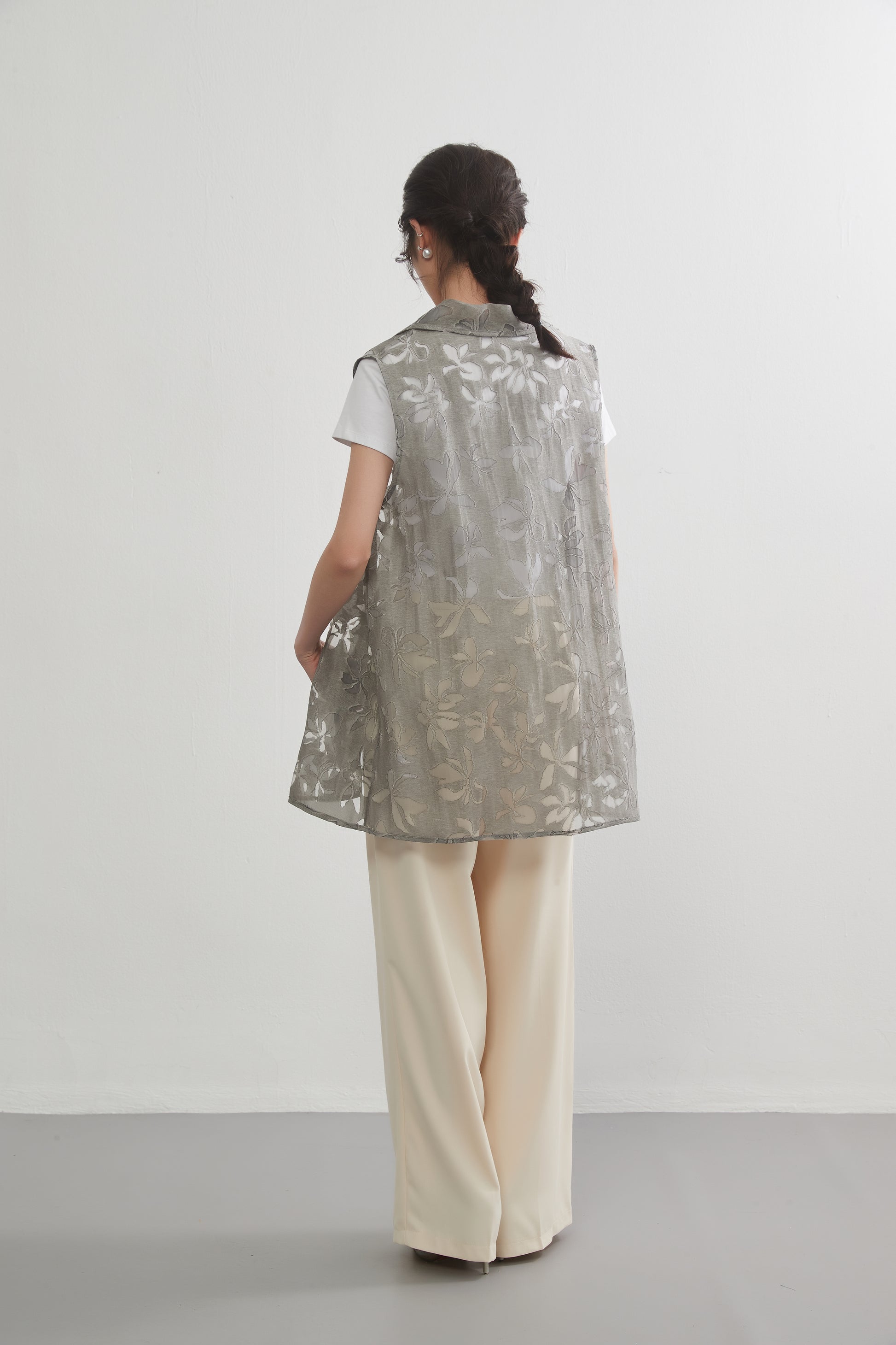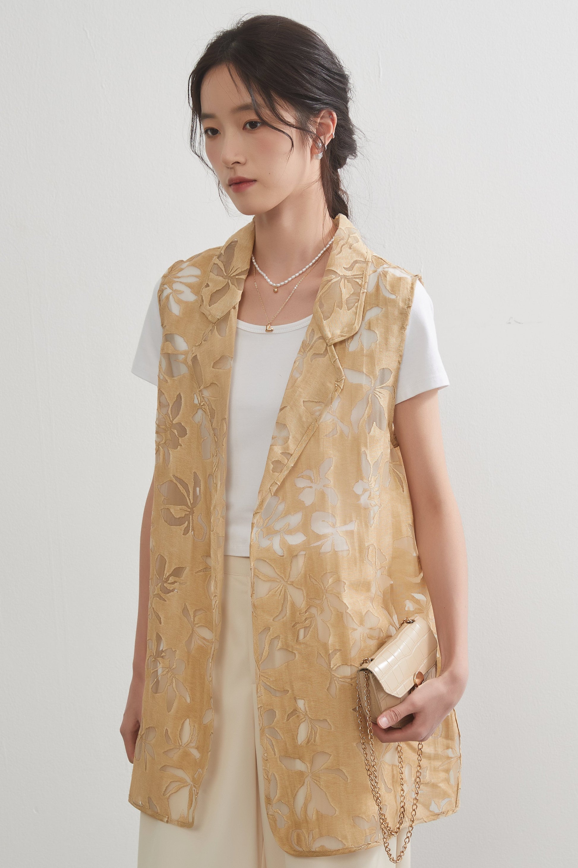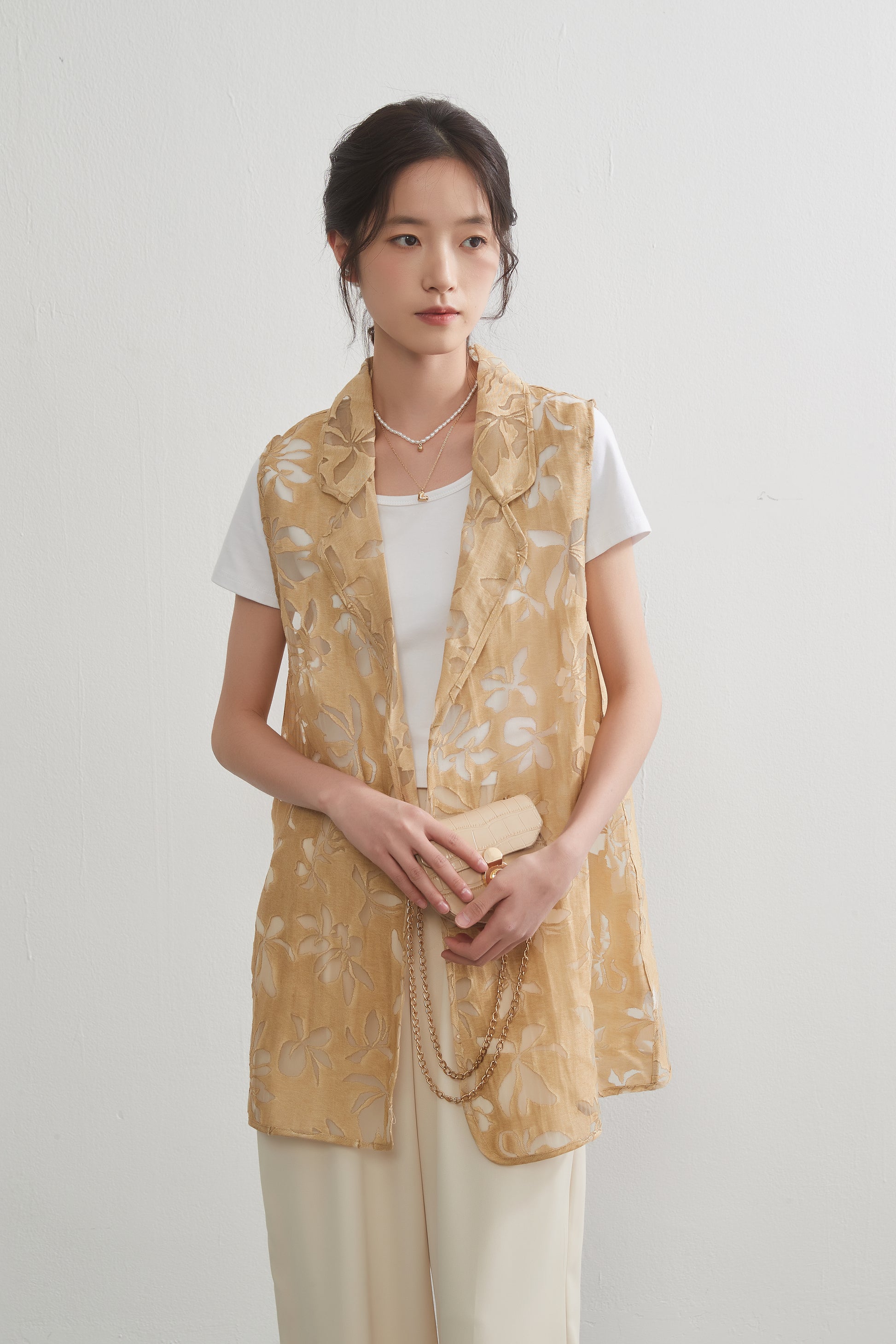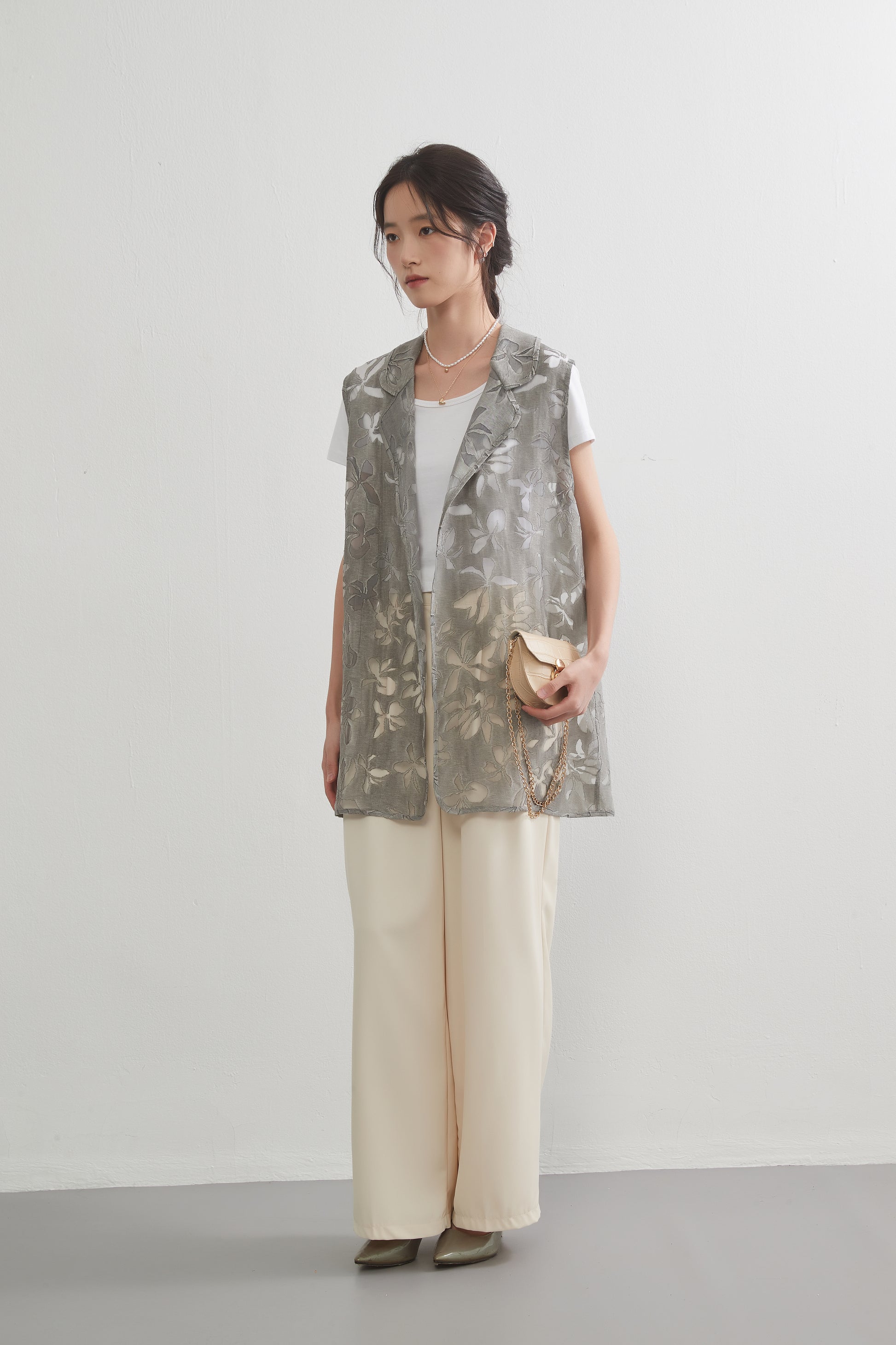 繊細な花柄のオパール加工が特徴的なベスト。軽やかな透け感があり、エレガントさとカジュアルさを両立したデザインです。シンプルなインナーと合わせることで、柄の美しさを引き立てます。