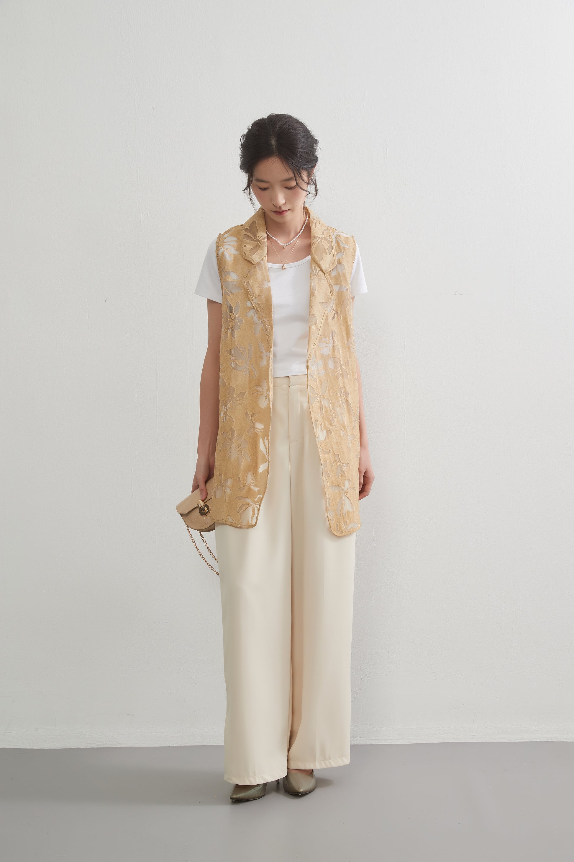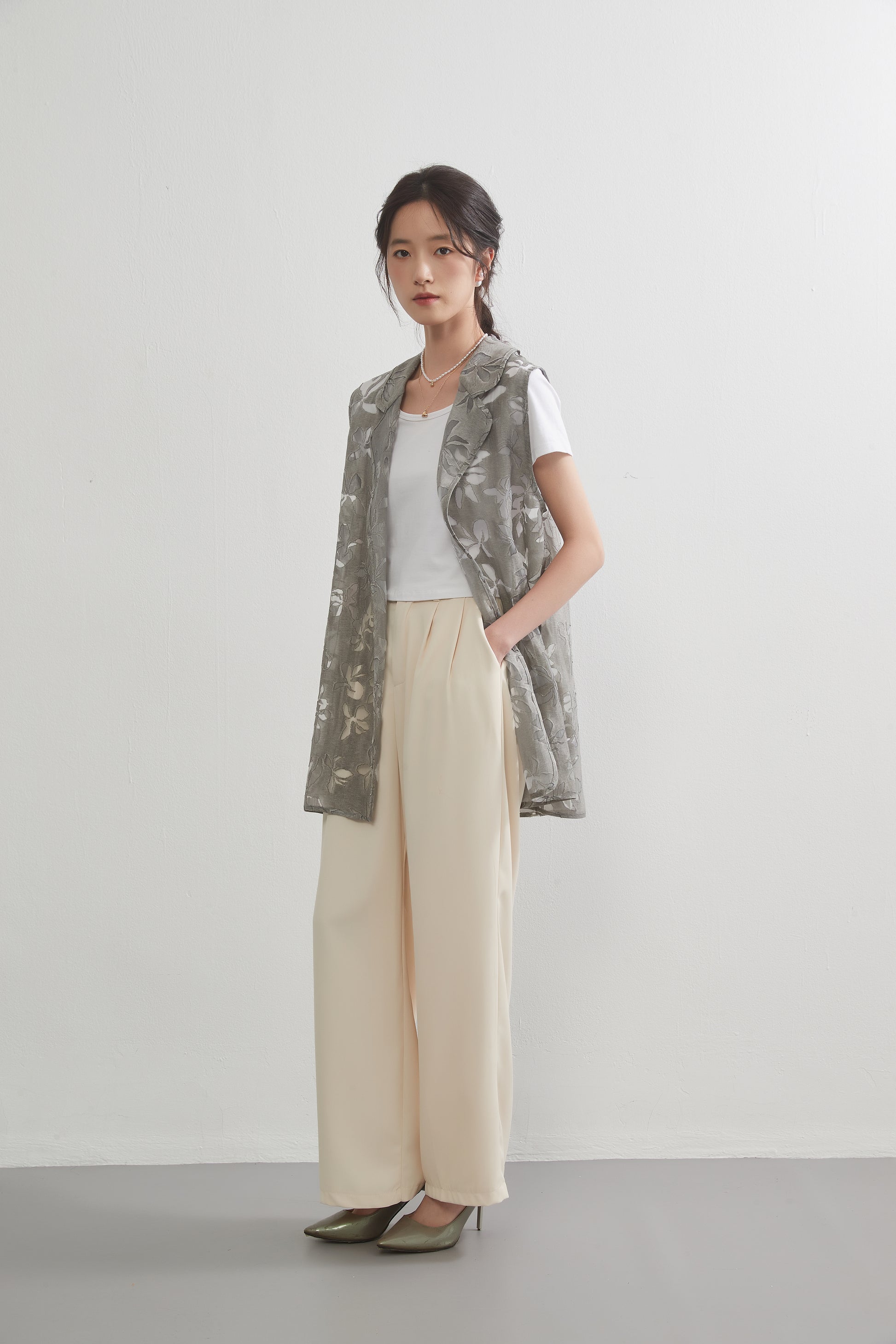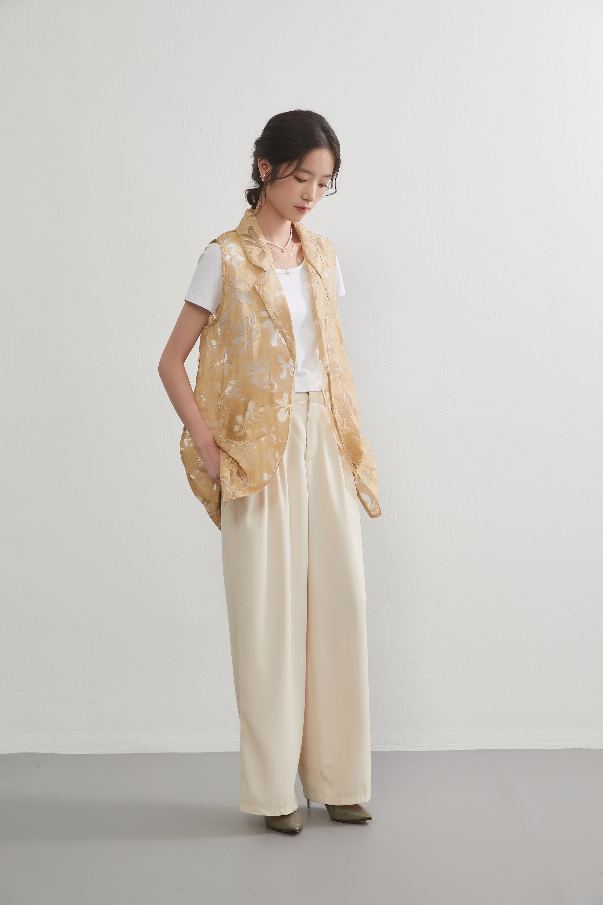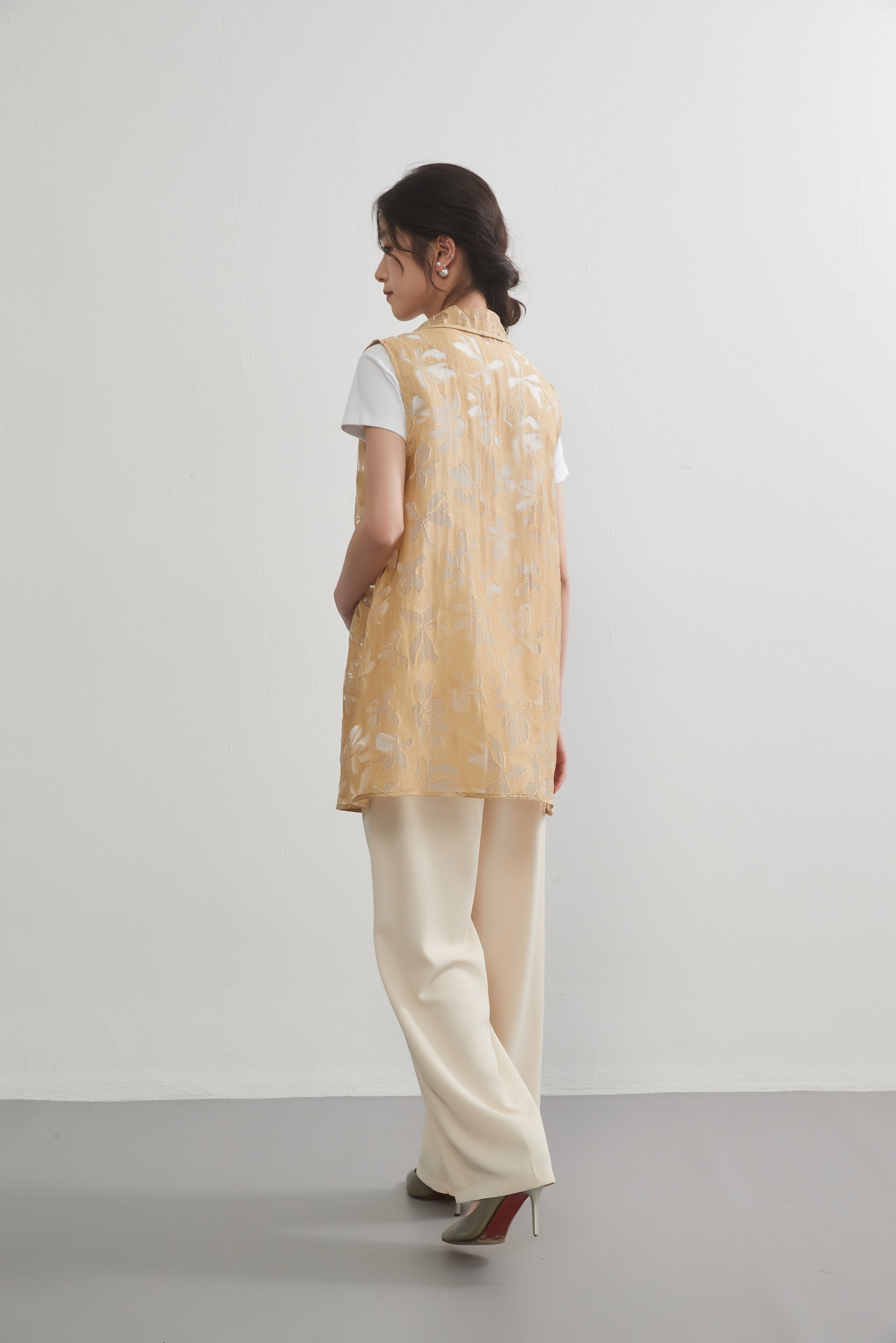 繊細な花柄のオパール加工が特徴的なベスト。軽やかな透け感があり、エレガントさとカジュアルさを両立したデザインです。シンプルなインナーと合わせることで、柄の美しさを引き立てます。