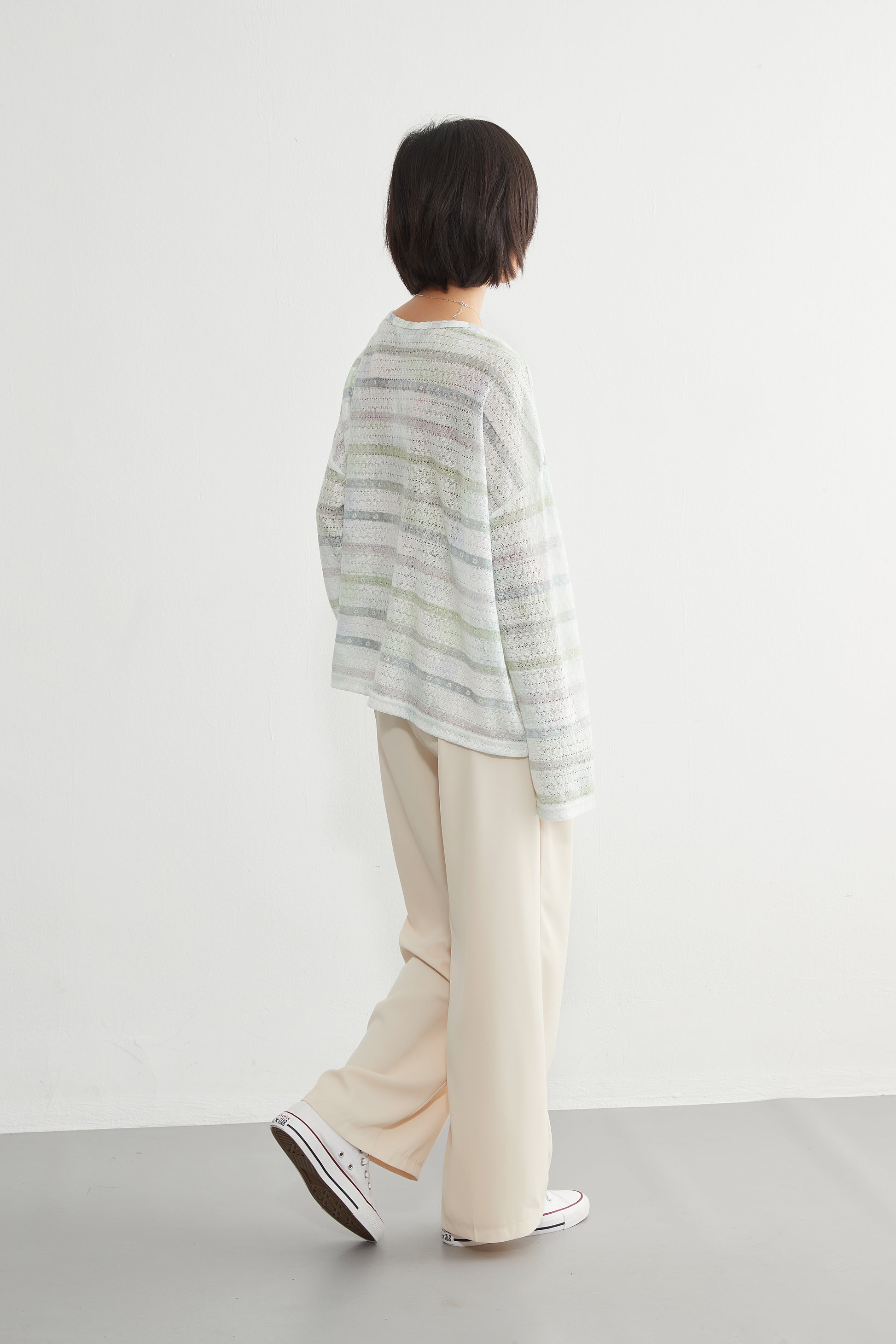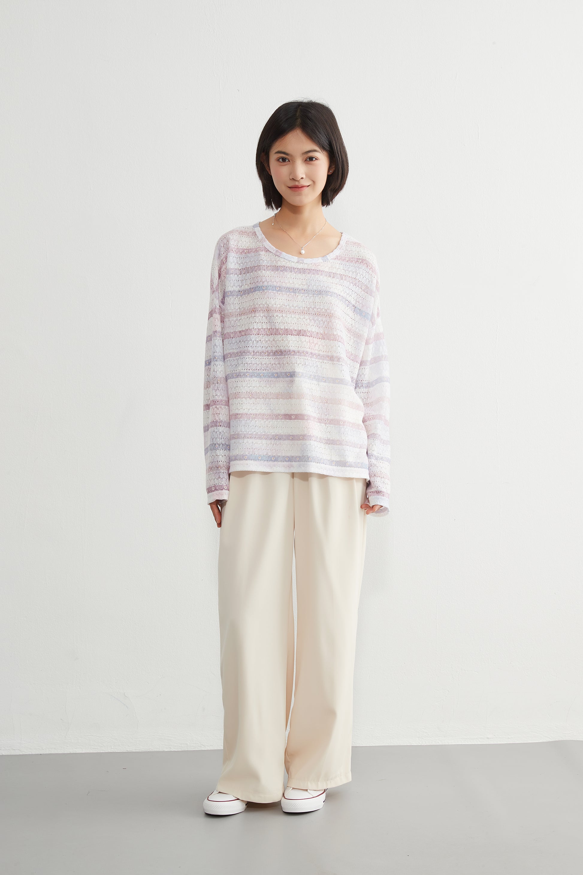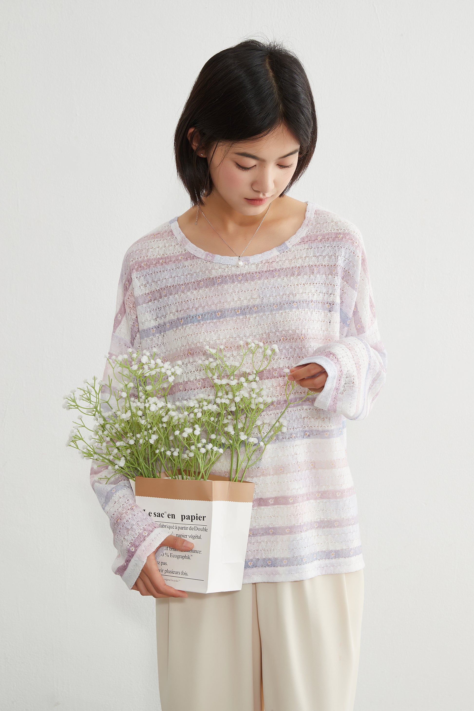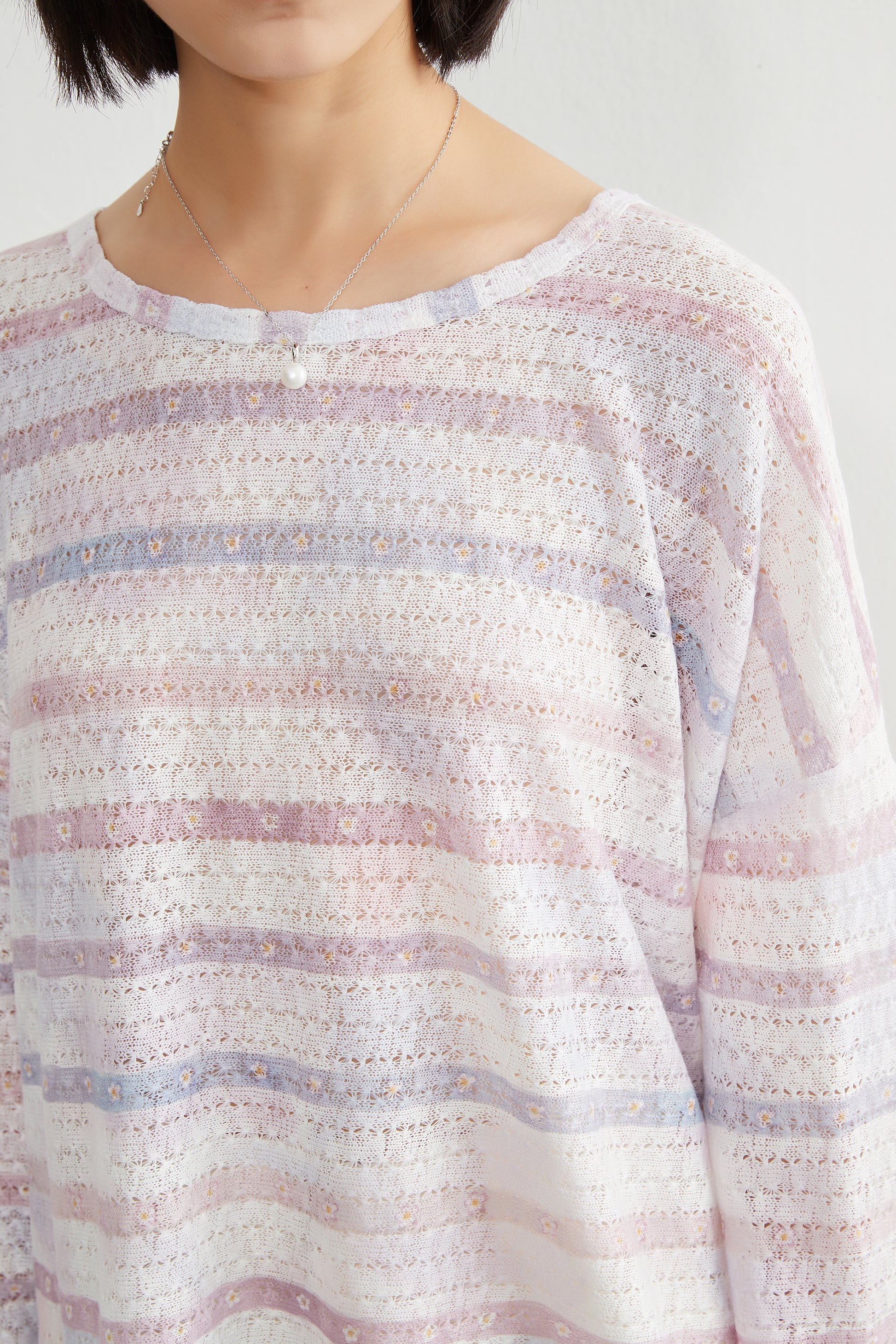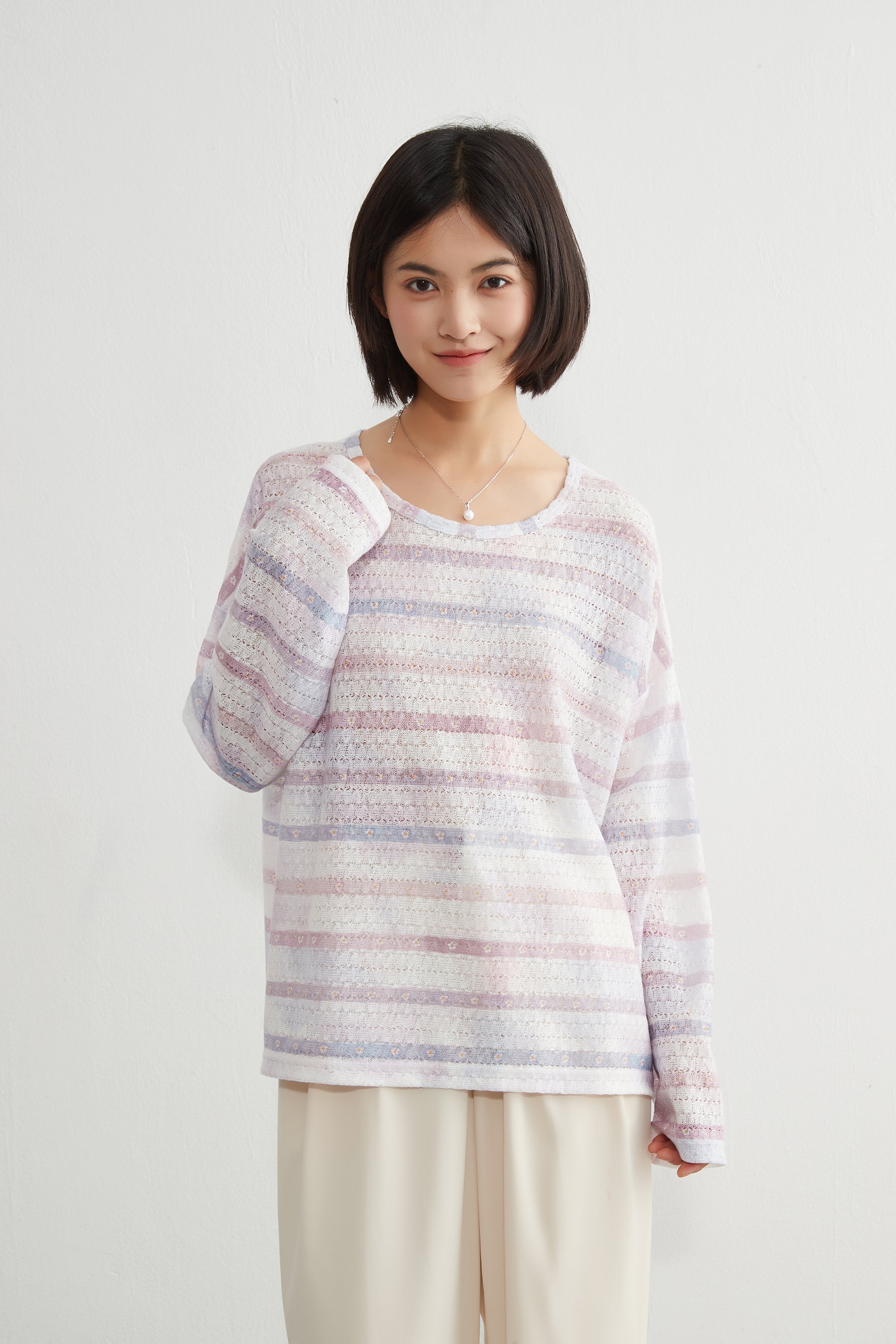 KNR645・ラッセル編みむら染め風小花プリント長袖ボーダープルオーバー
