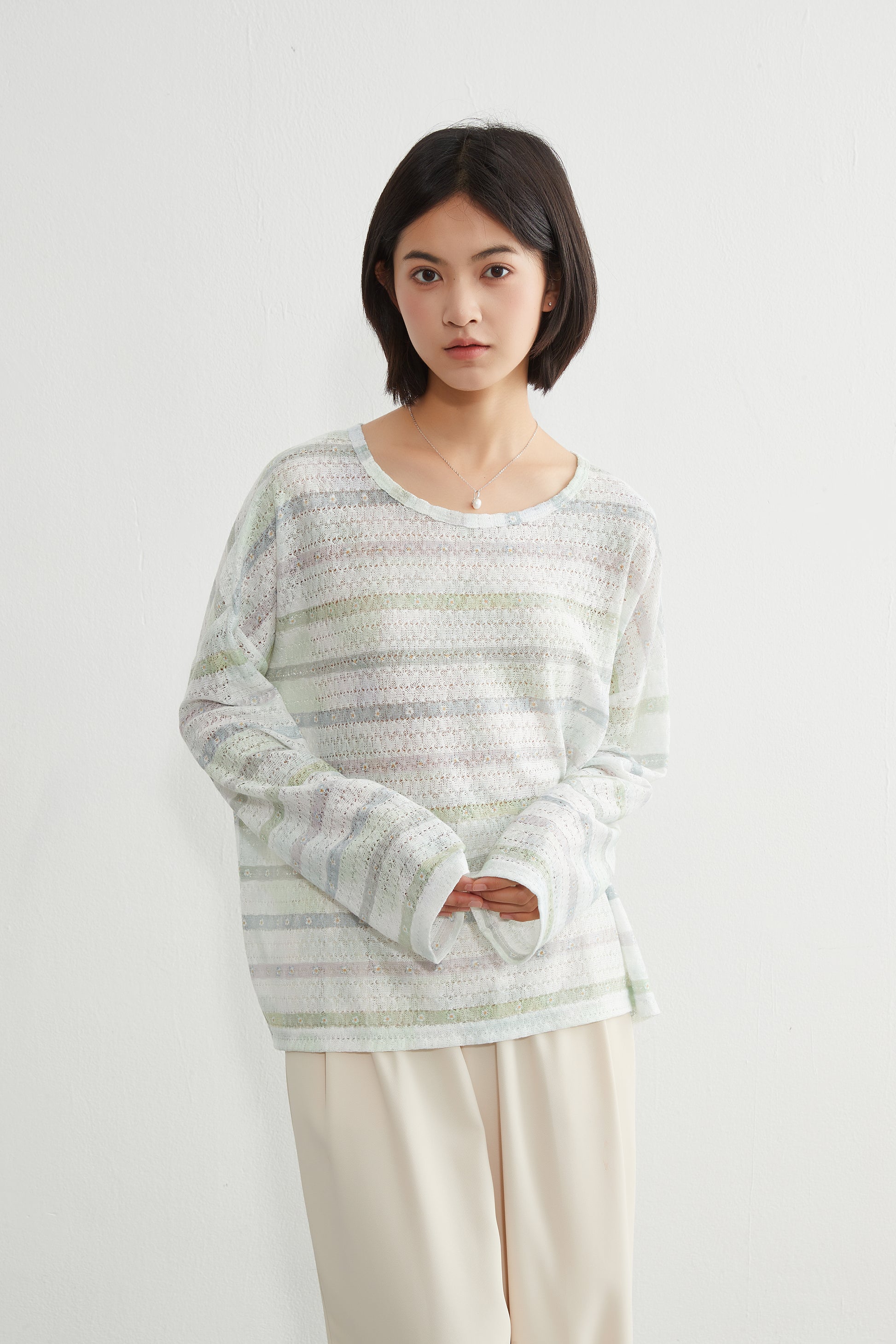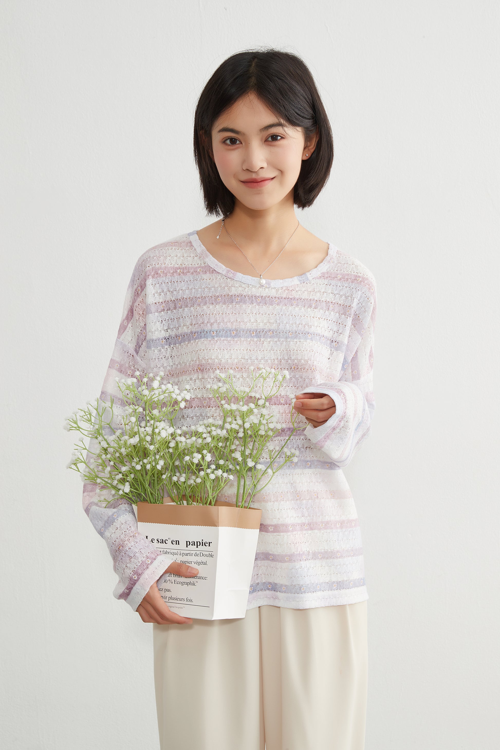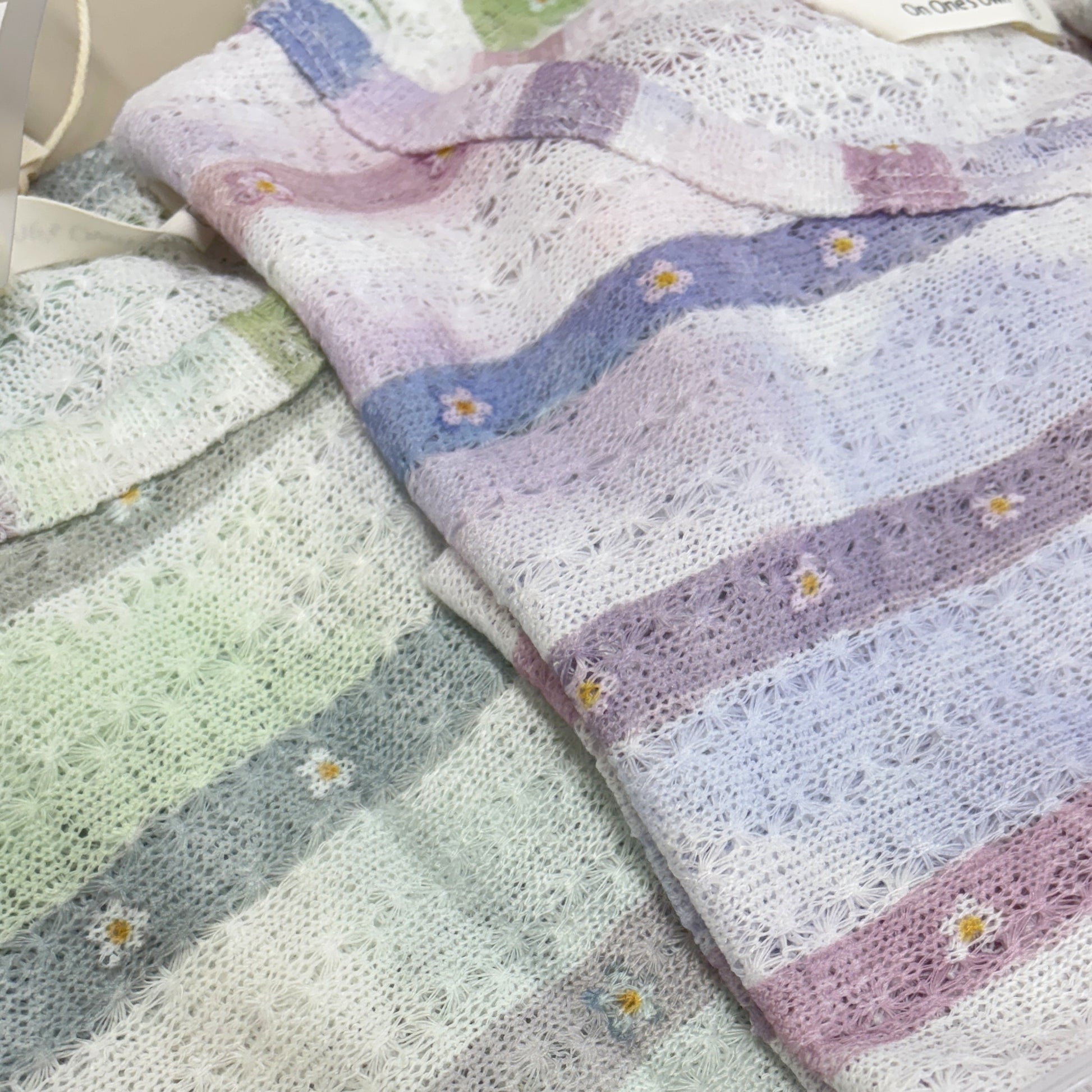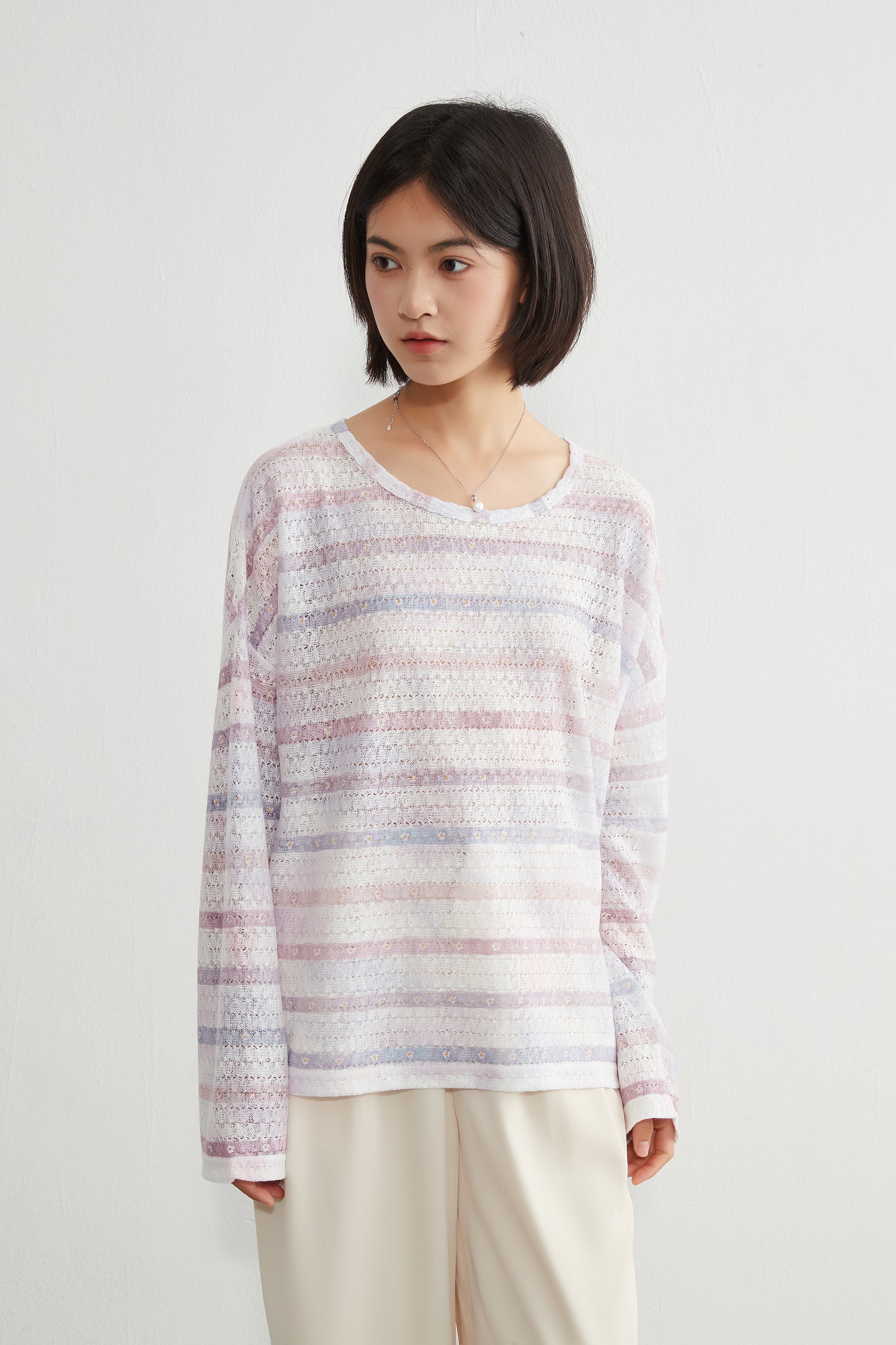 KNR645・ラッセル編みむら染め風小花プリント長袖ボーダープルオーバー