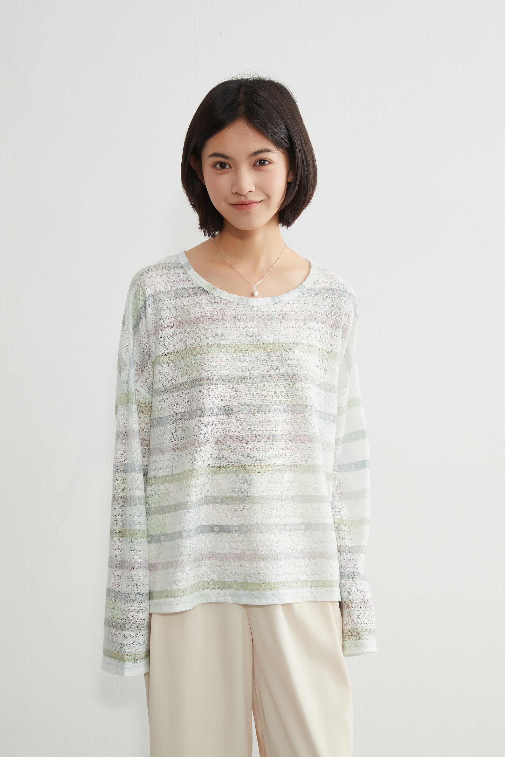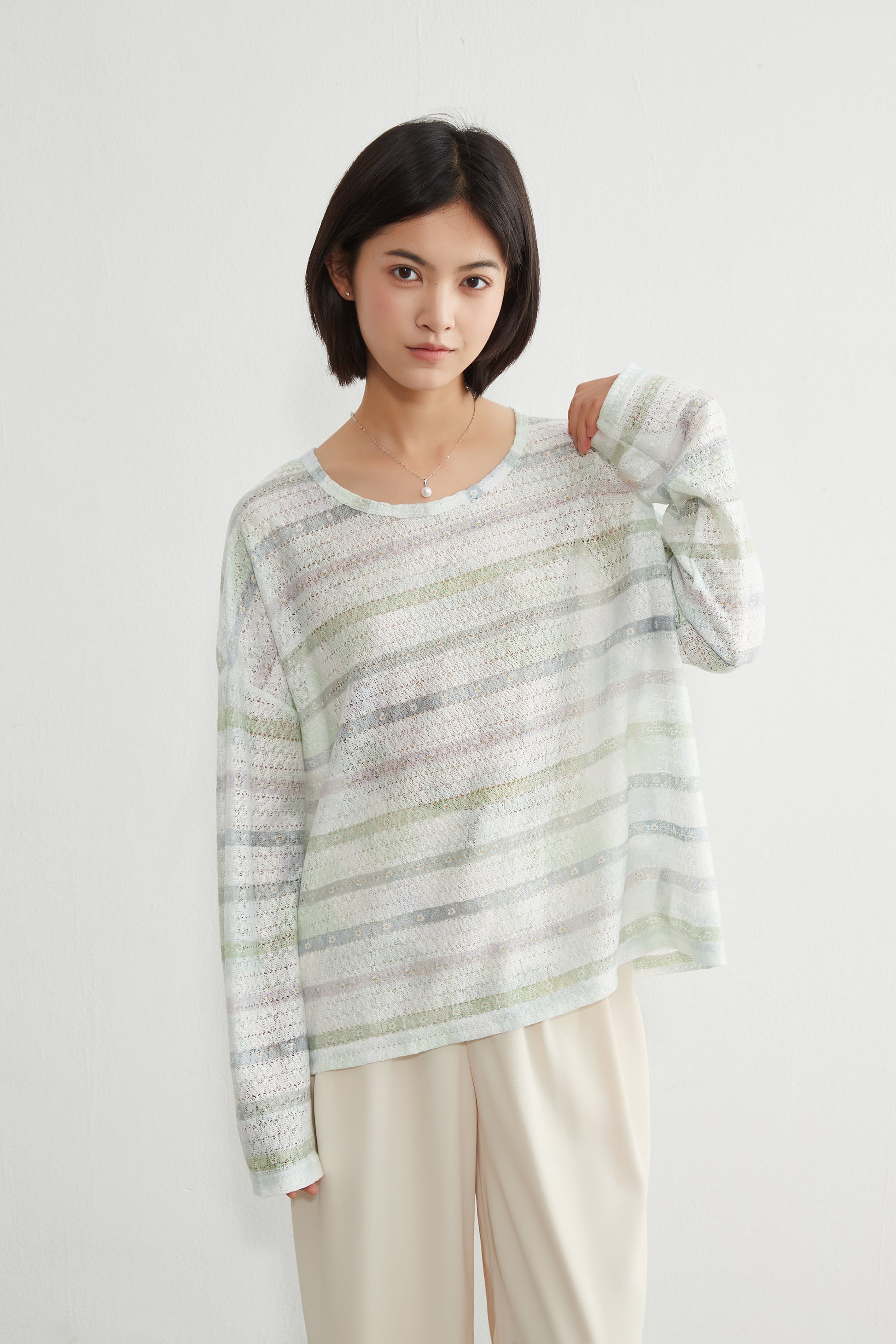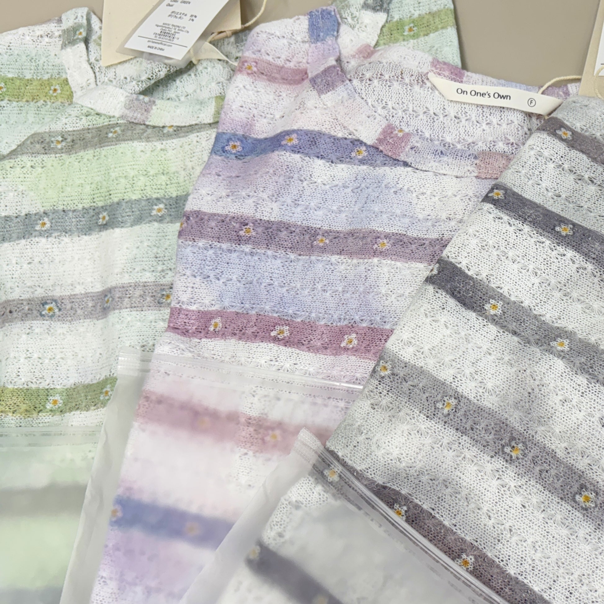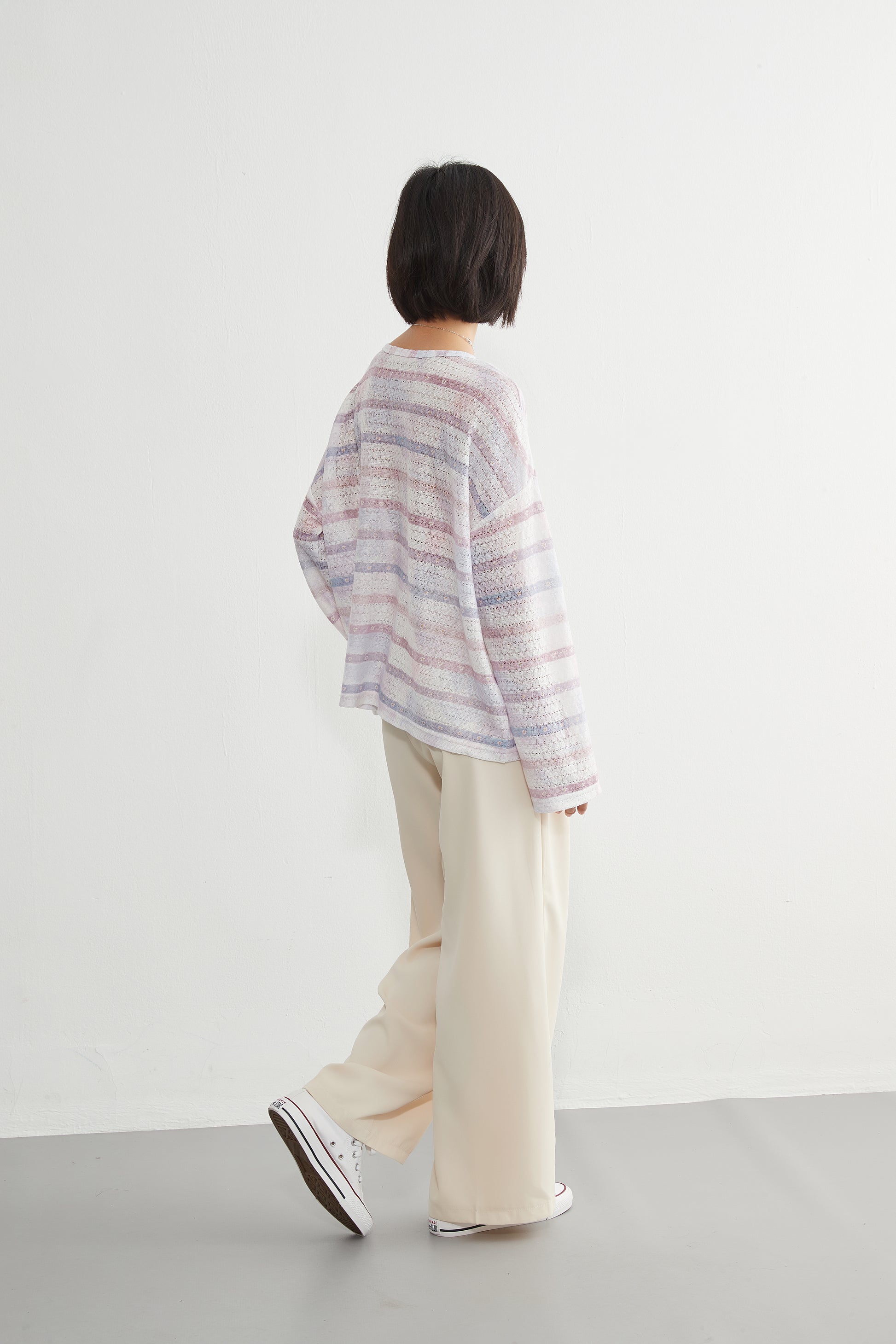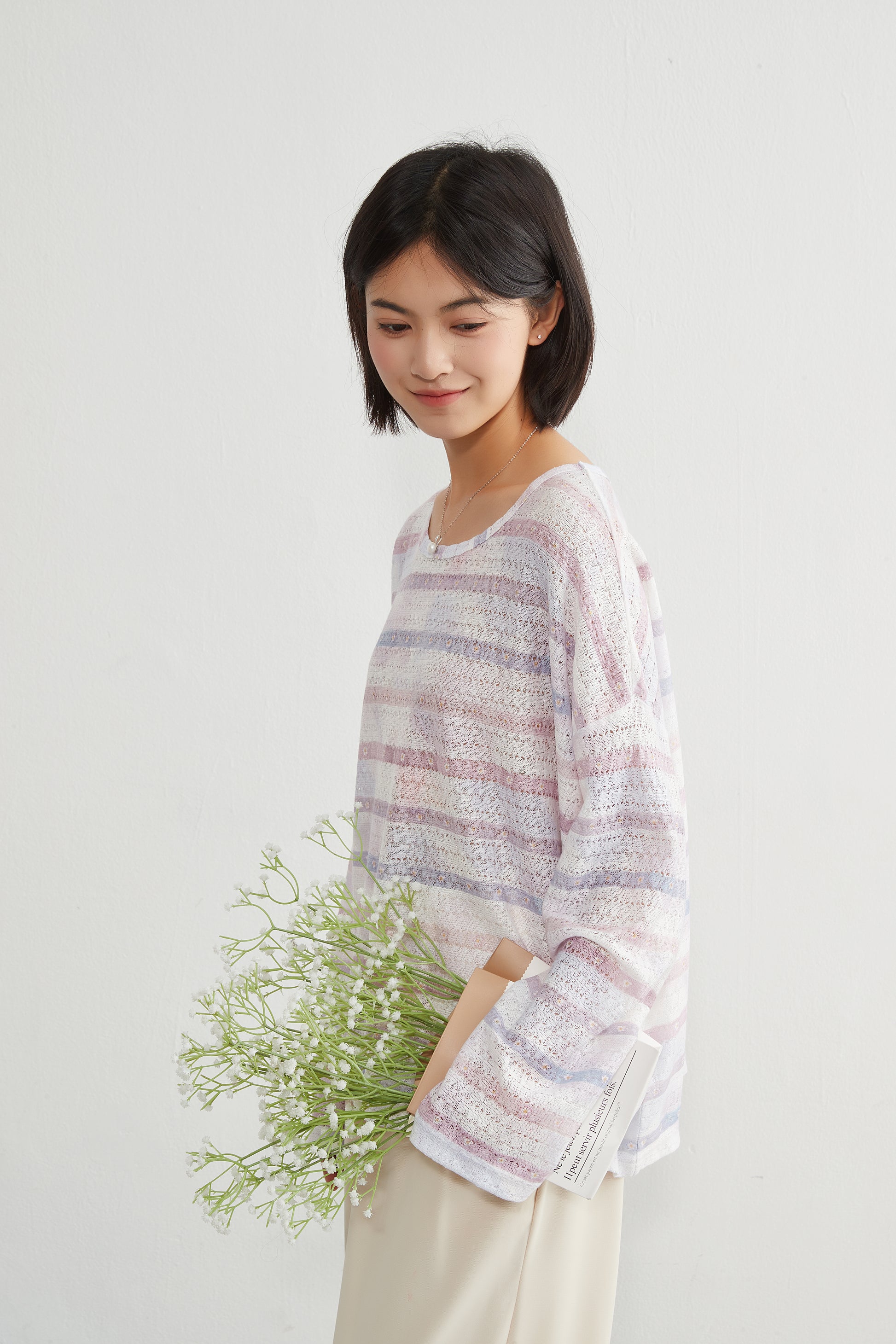 KNR645・ラッセル編みむら染め風小花プリント長袖ボーダープルオーバー