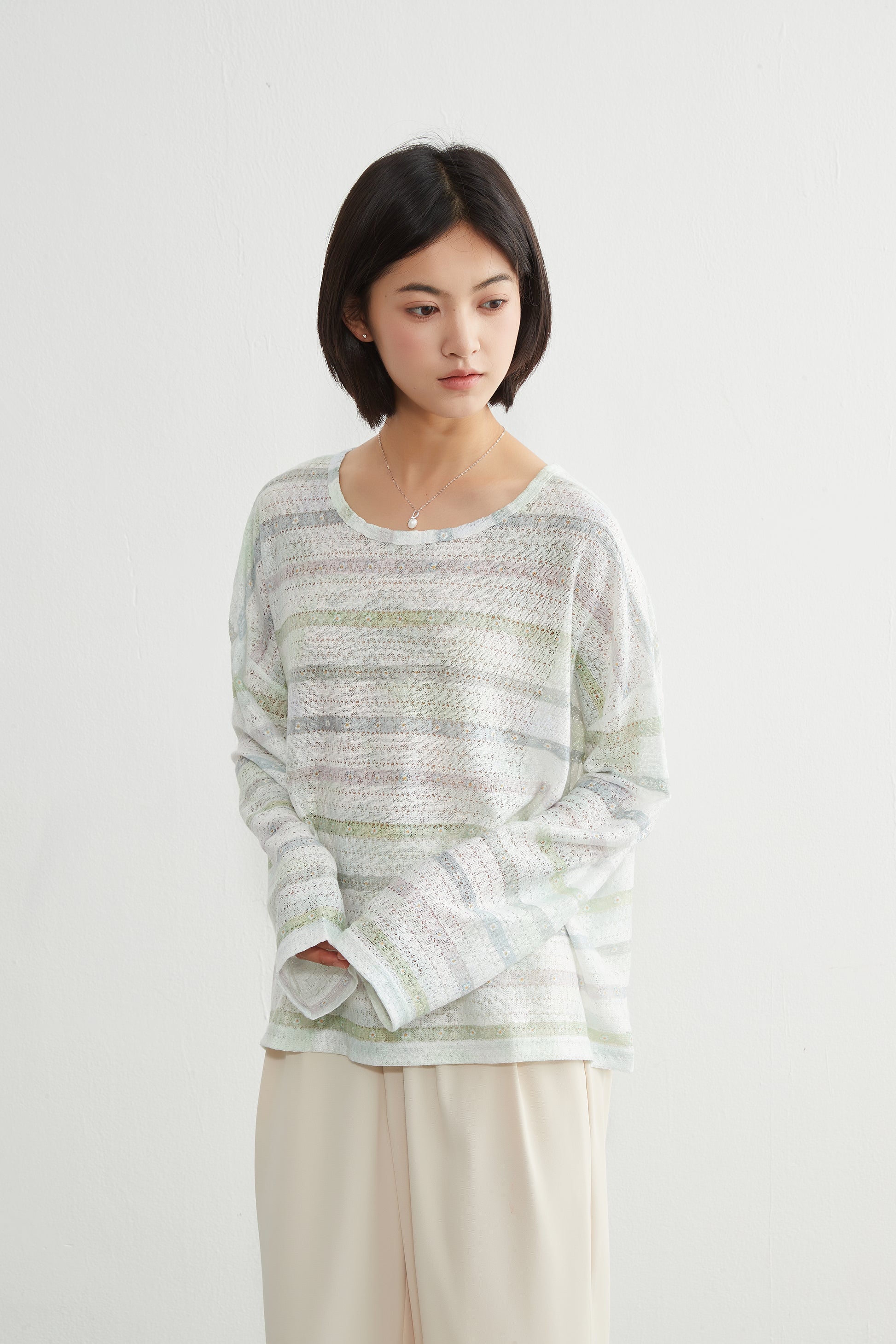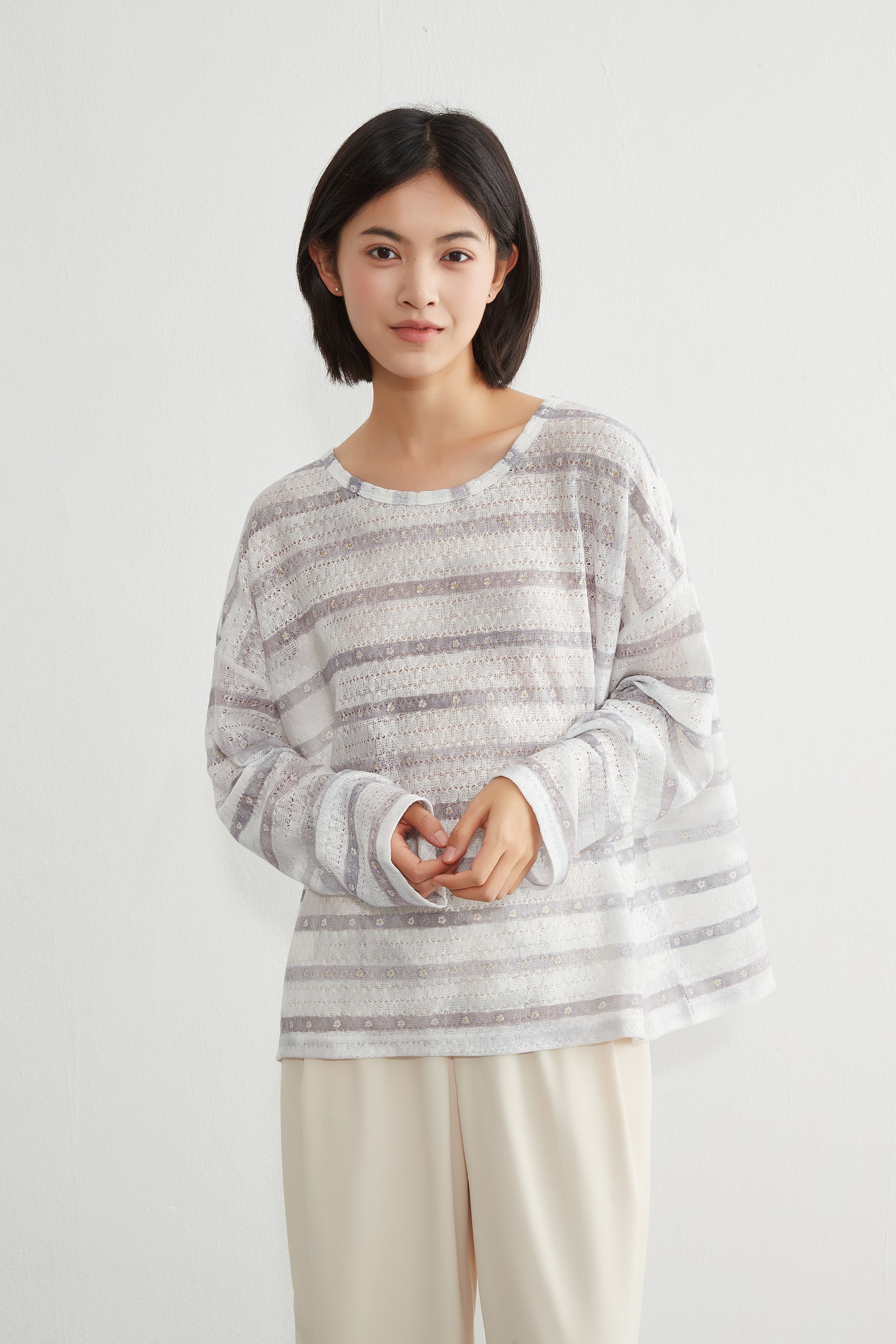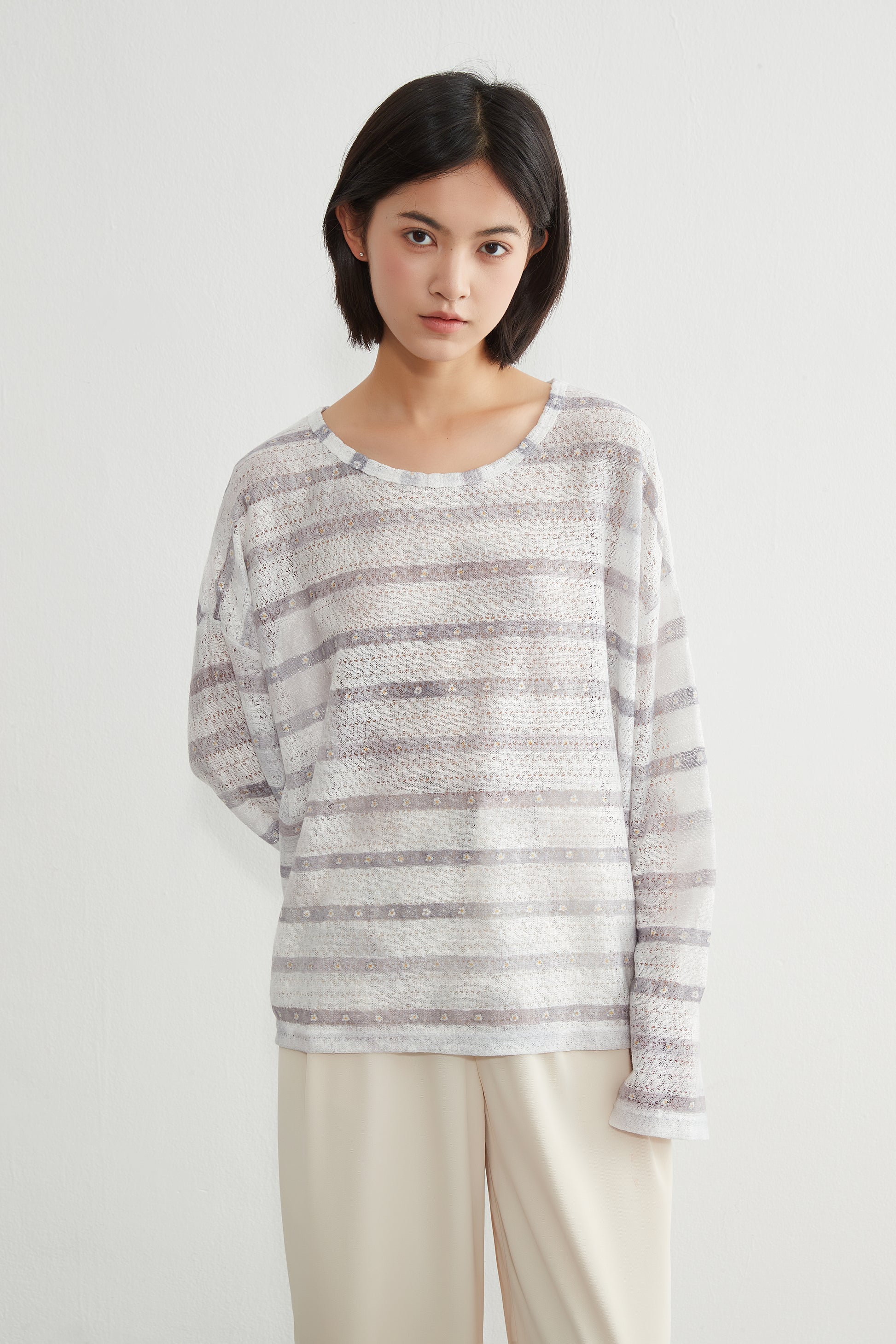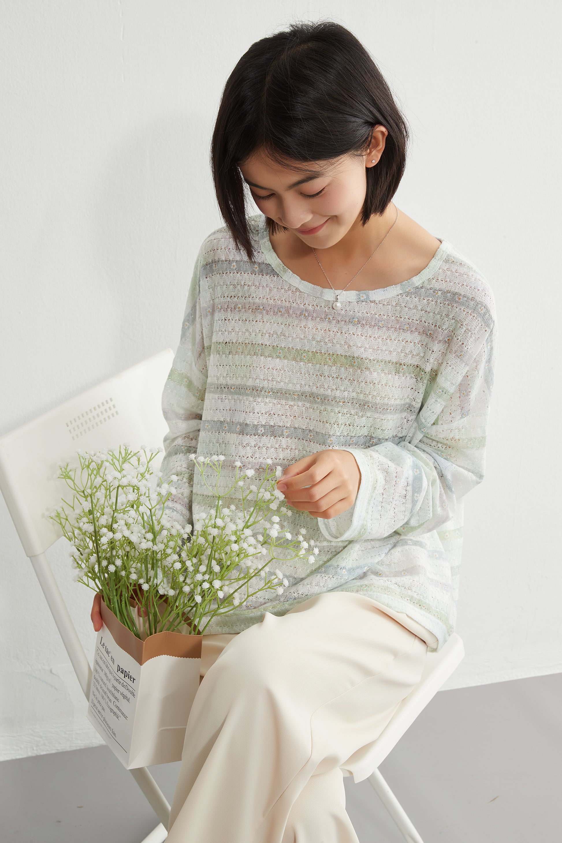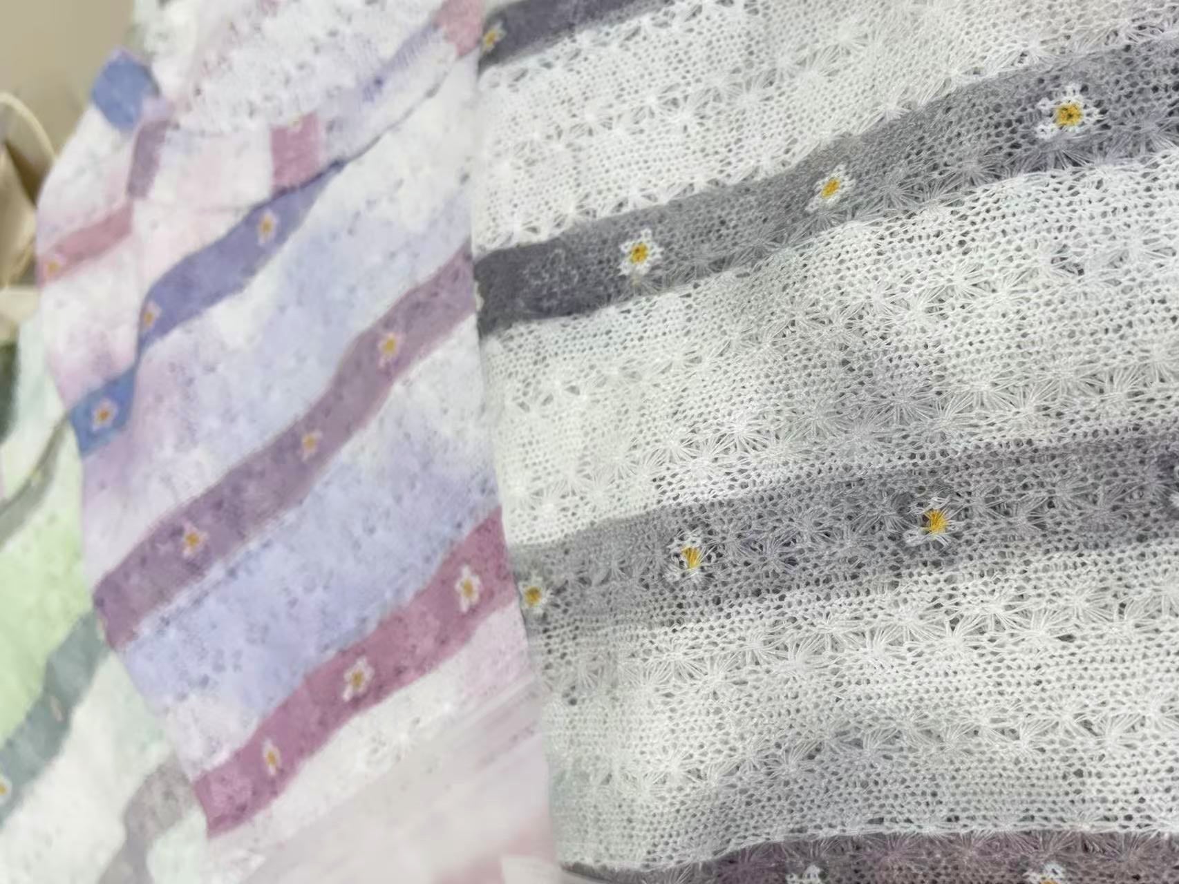 KNR645・ラッセル編みむら染め風小花プリント長袖ボーダープルオーバー