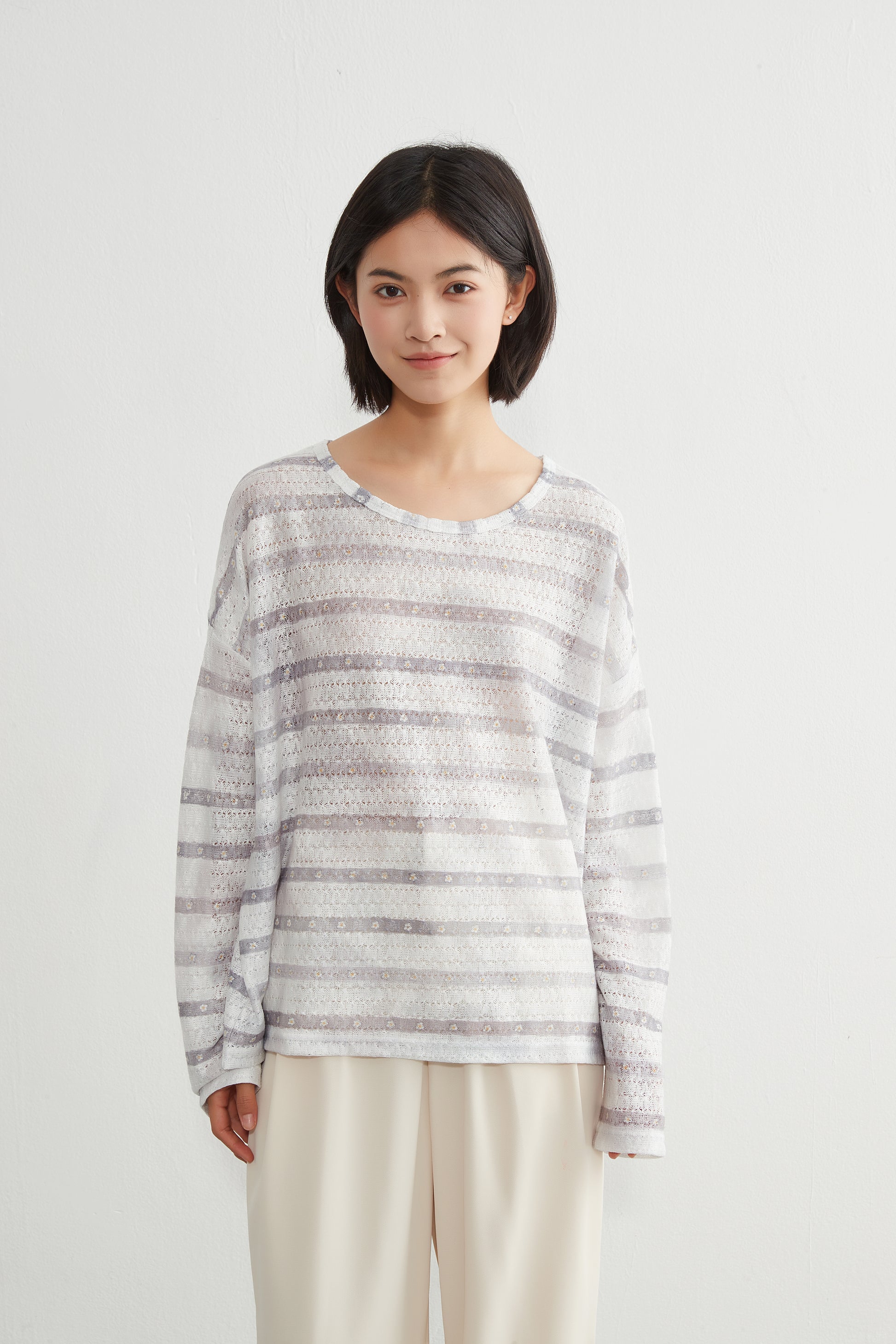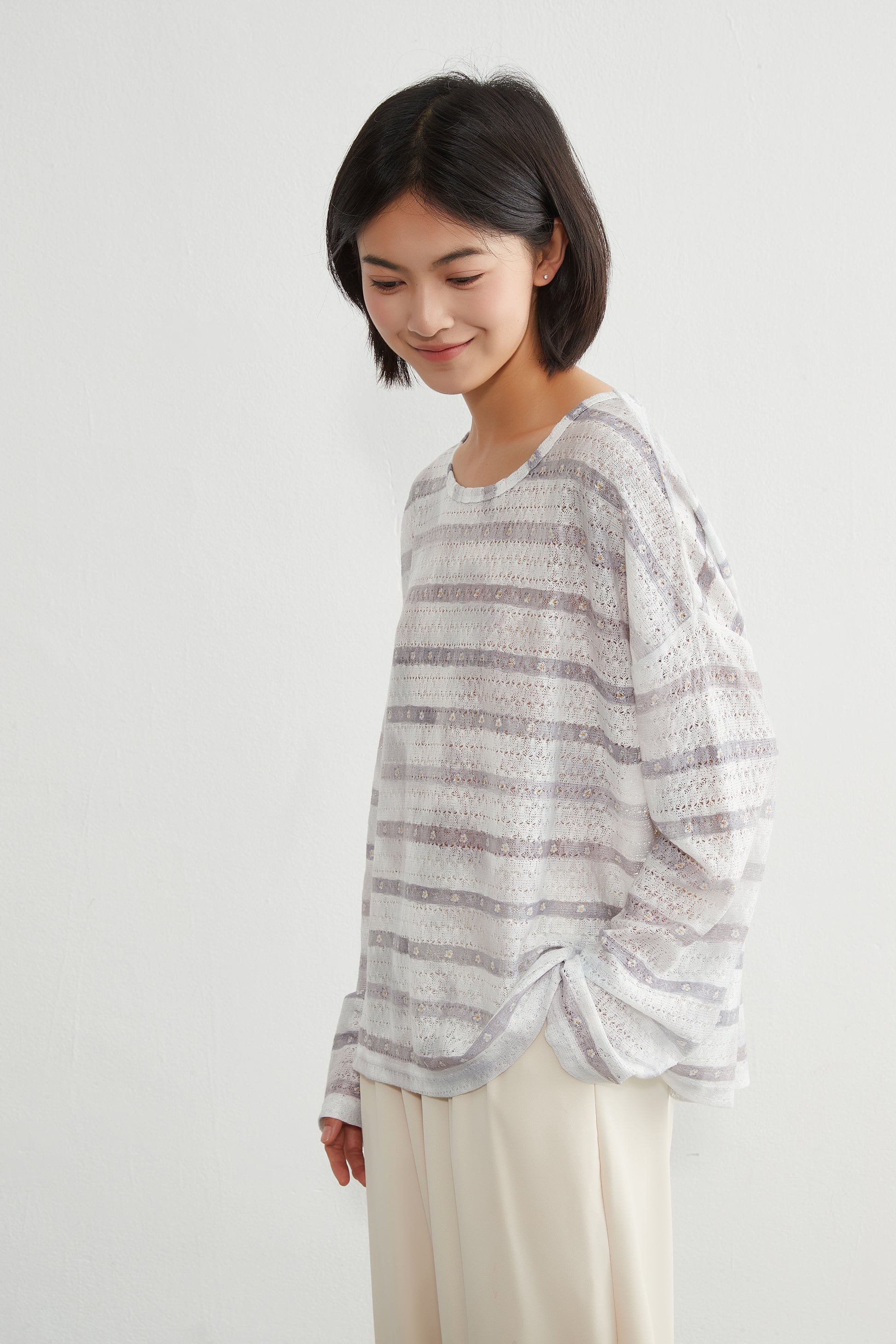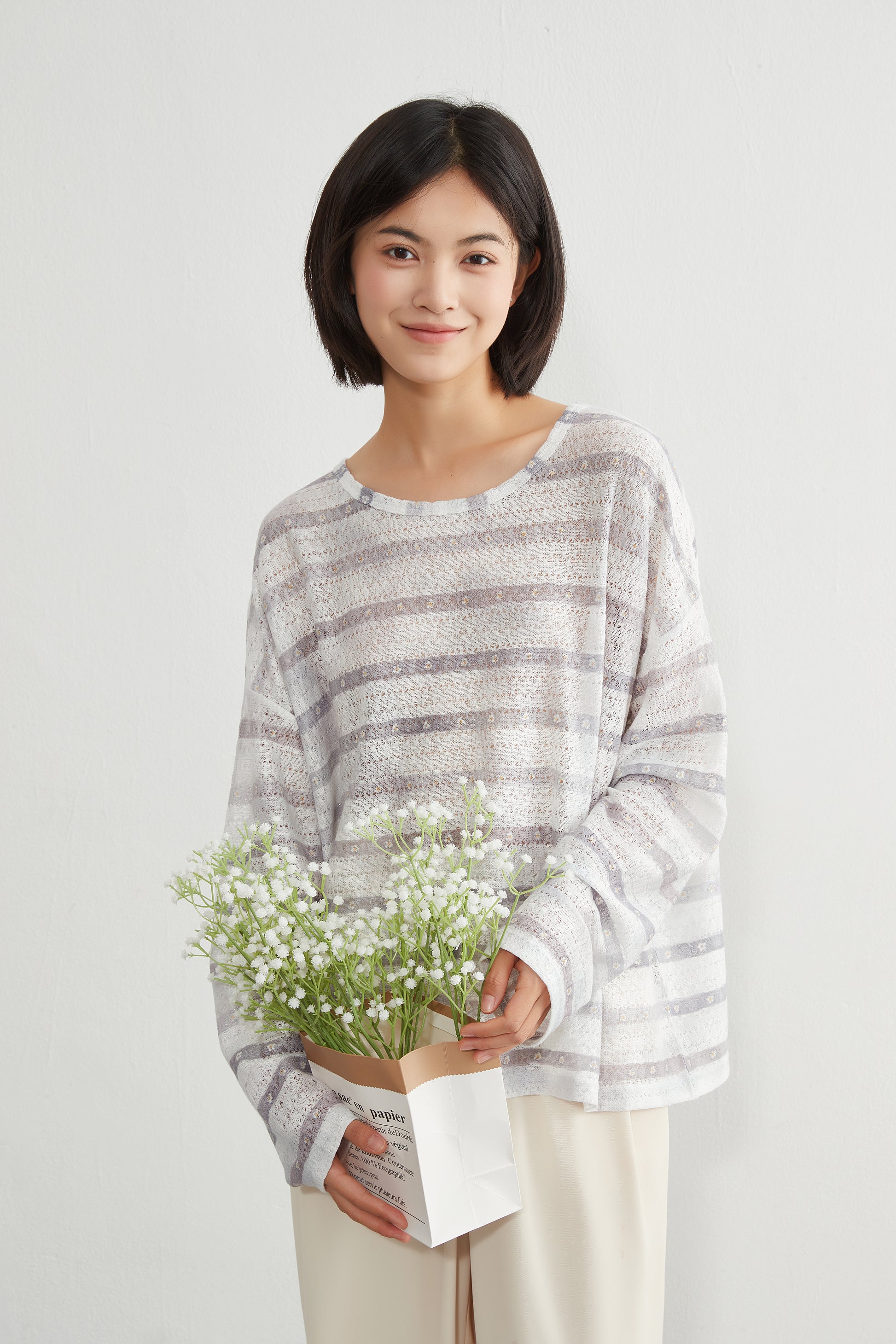 小花プリントを重ねたボーダー柄に全体的なむら染めを施した表情豊かなデザインが魅力の長袖プルオーバー。シンプルなシルエットながら、1枚で着映えする存在感のある一着です。