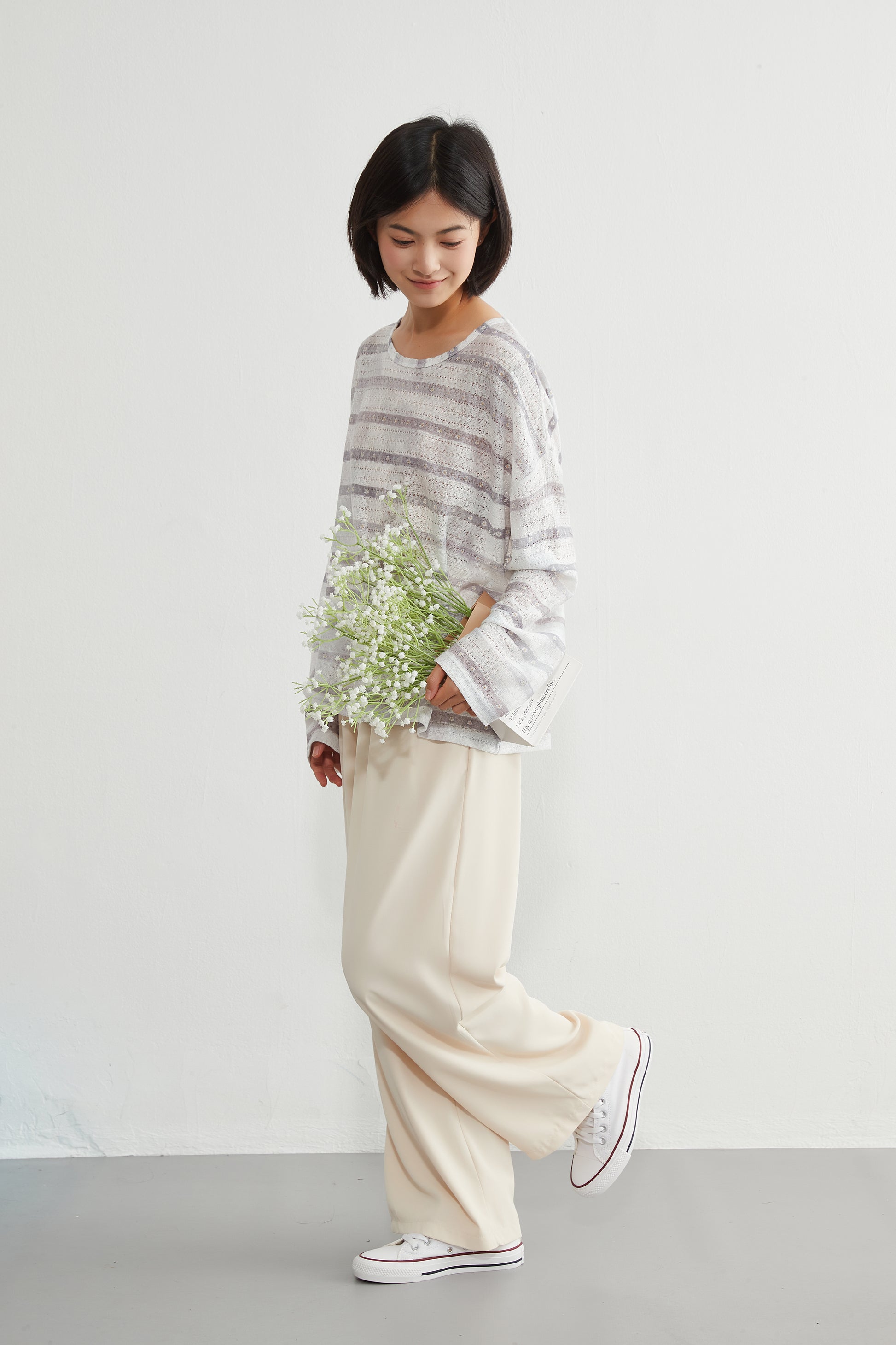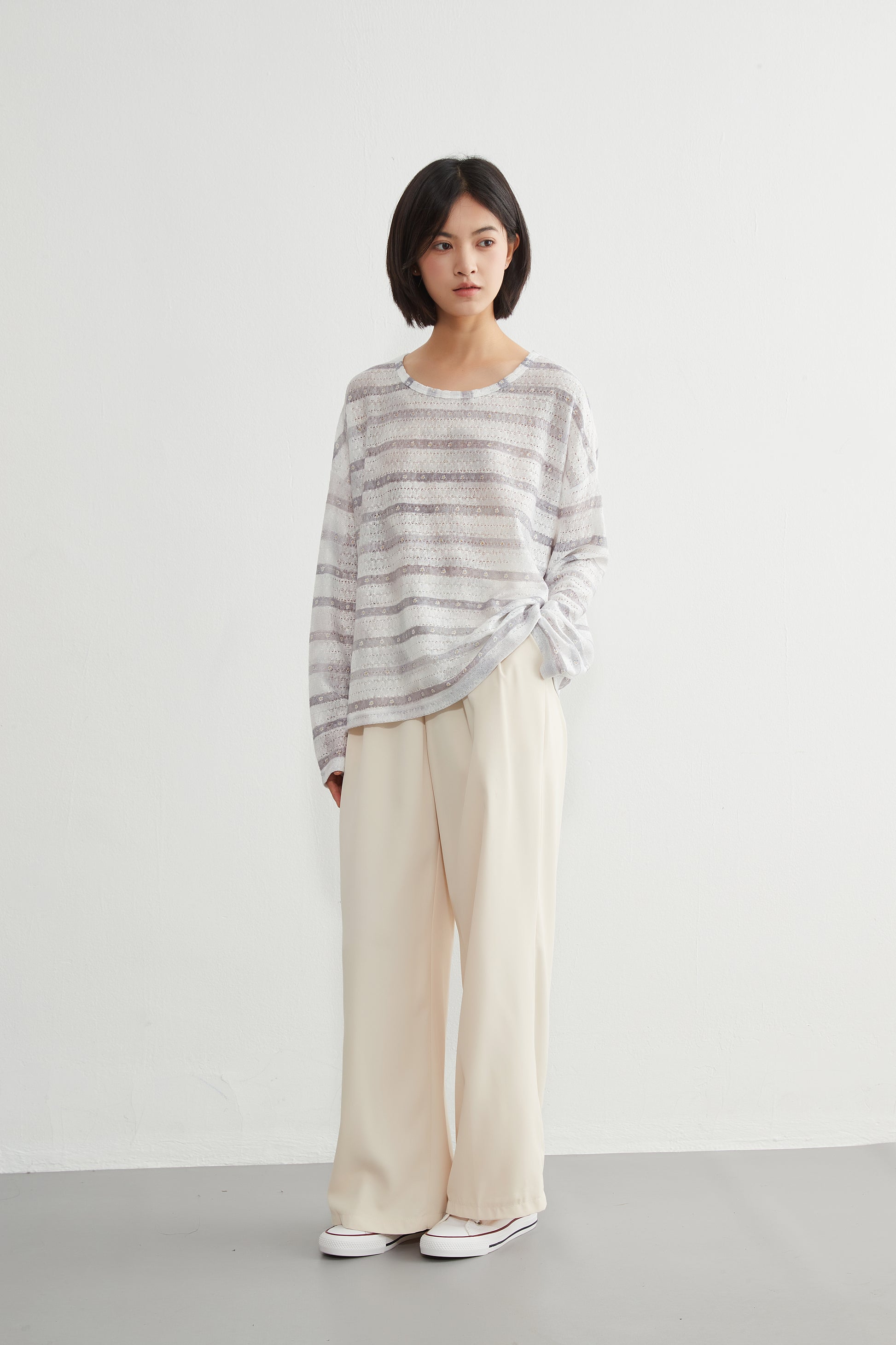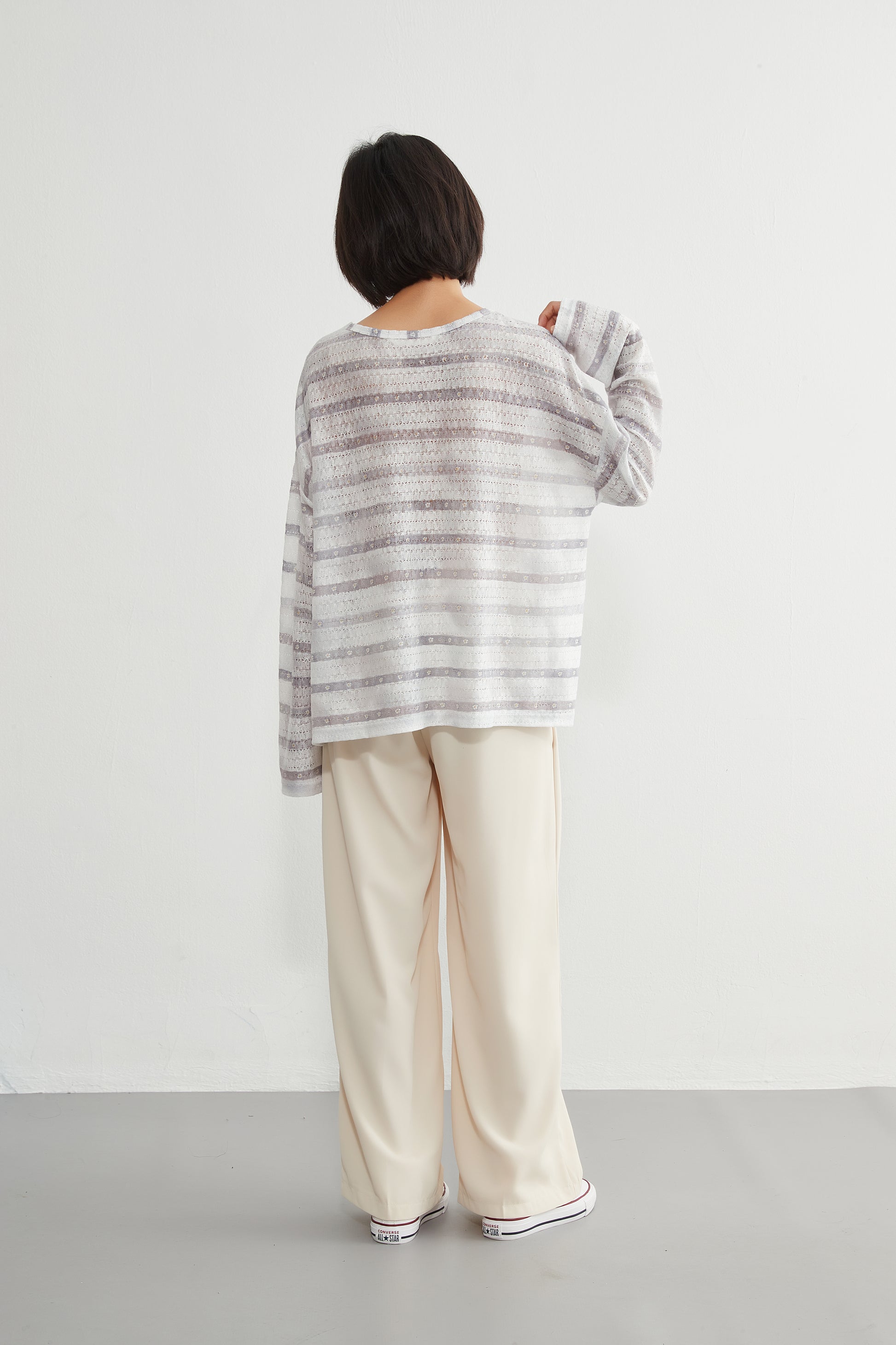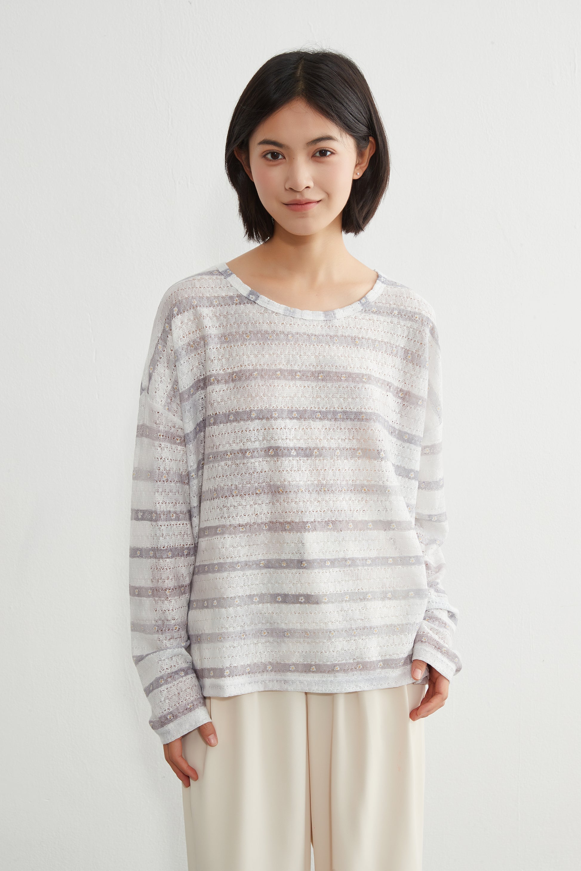 小花プリントを重ねたボーダー柄に全体的なむら染めを施した表情豊かなデザインが魅力の長袖プルオーバー。シンプルなシルエットながら、1枚で着映えする存在感のある一着です。