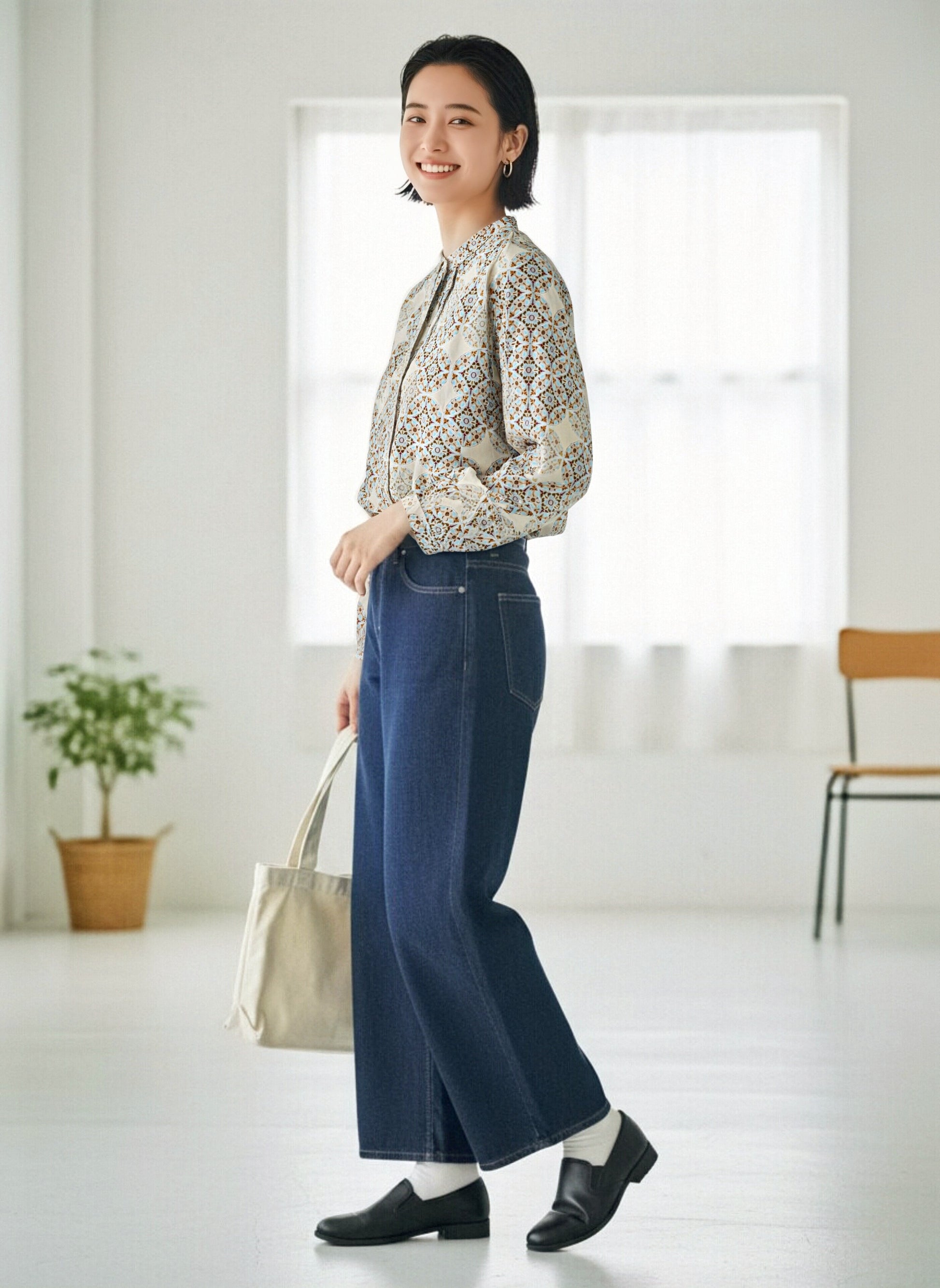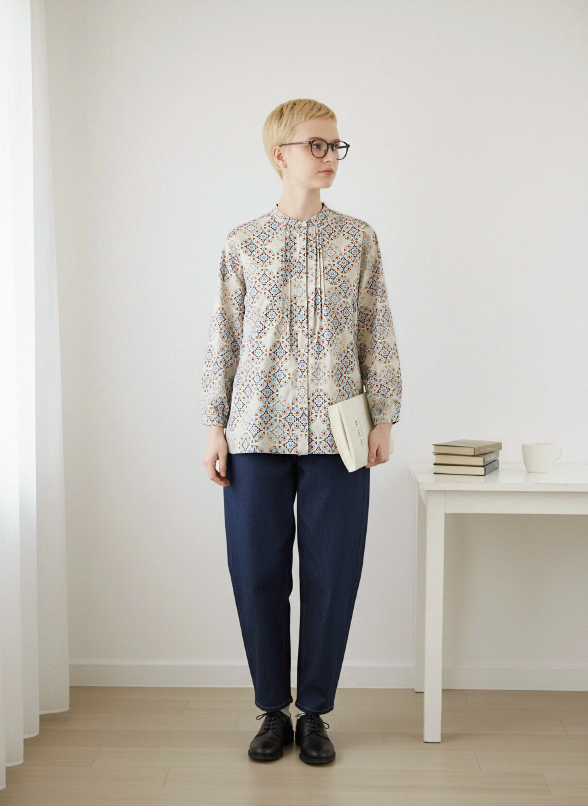 胸元のピンタックが縦のラインを強調してくれるので、フラットシューズでもスッキリとした立ち姿に。アンティークな柄が、いつもの通勤やお買い物シーンを一気に「洗練された休日」へと変えてくれます。
