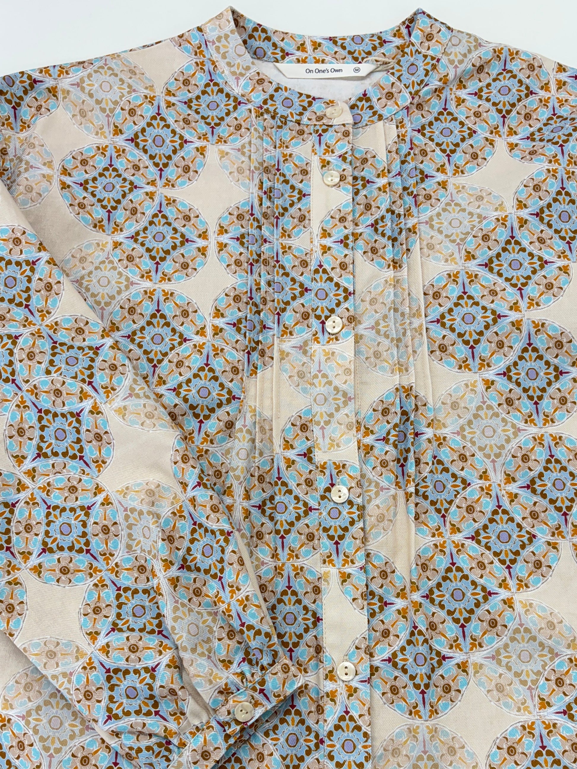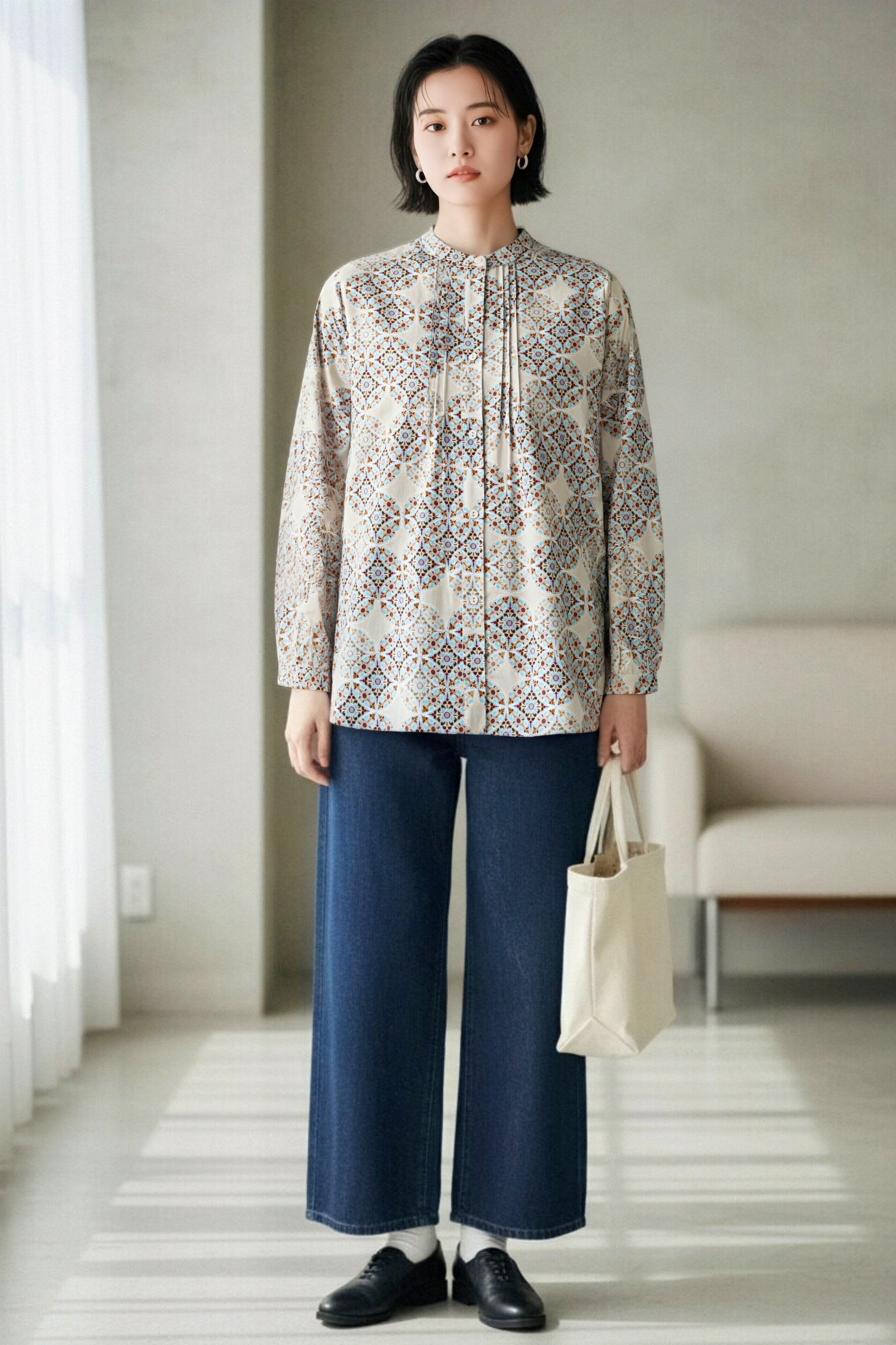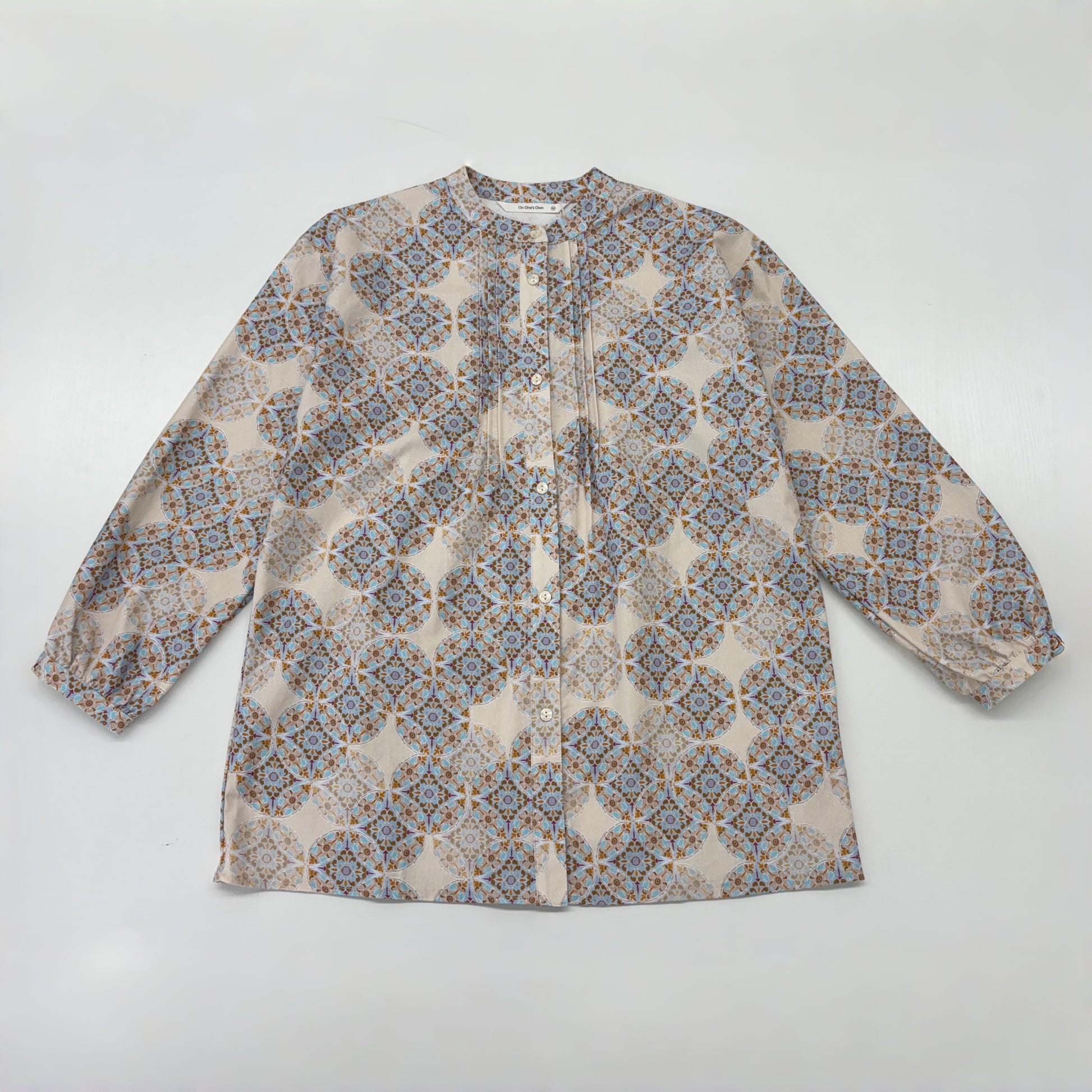 アンティーク調のモロッカン柄を全面にプリントした、存在感溢れる長袖ブラウス。胸元に贅沢に施されたピンタックが、柄の美しさをさらに引き立て、立体的なシルエットを生み出します。スタンドカラーのデザインが全体の印象を引き締め、カジュアルからきれいめまで幅広く対応します。