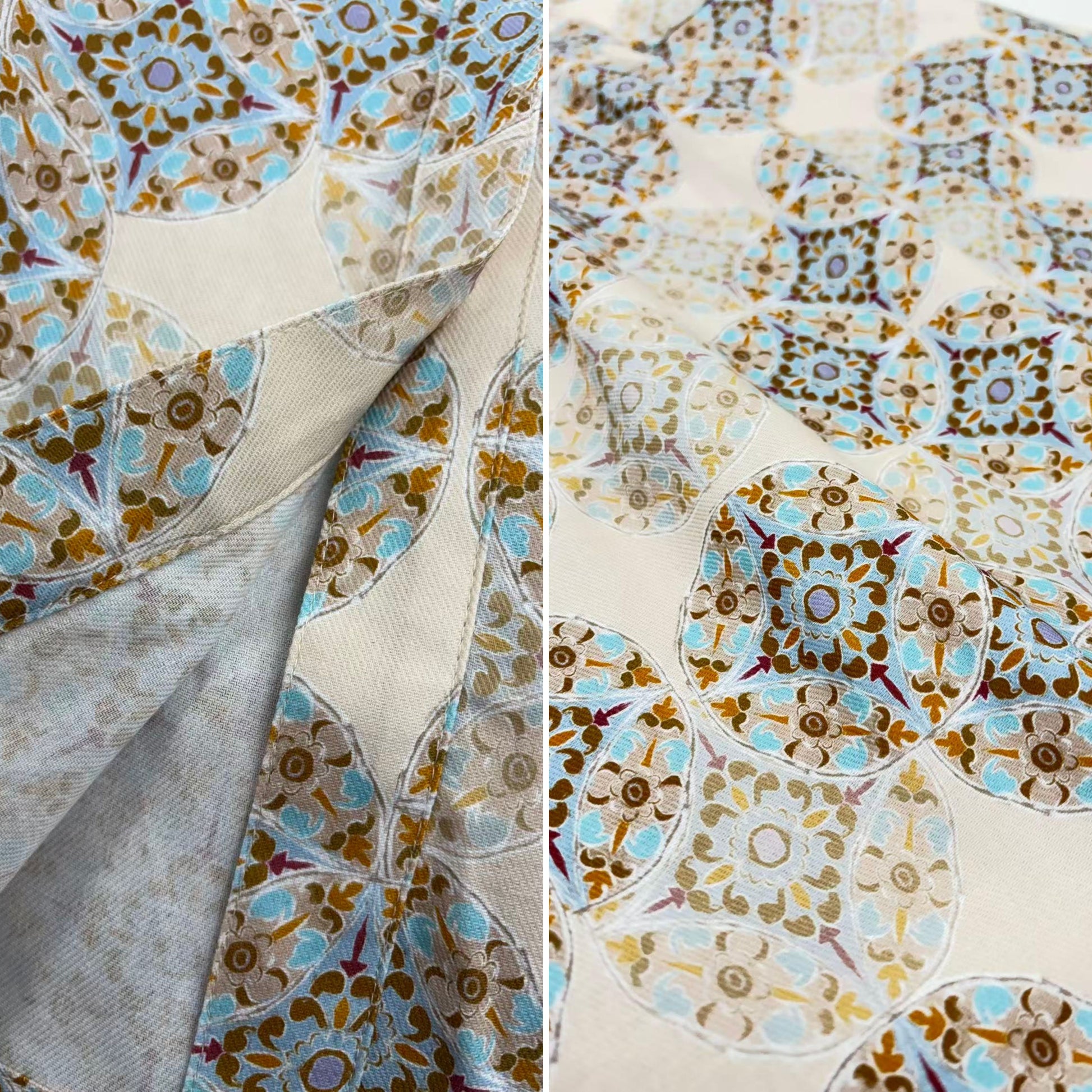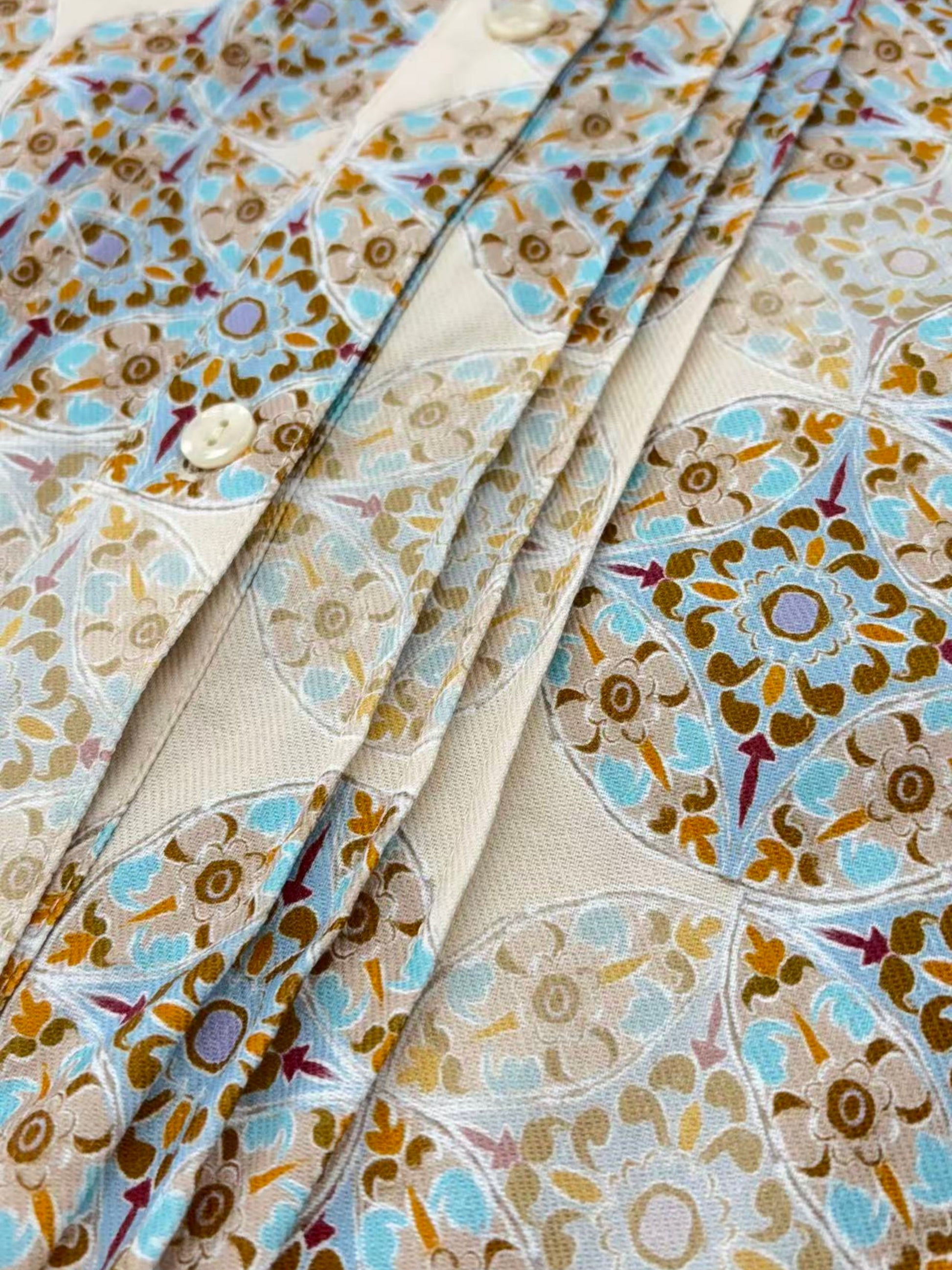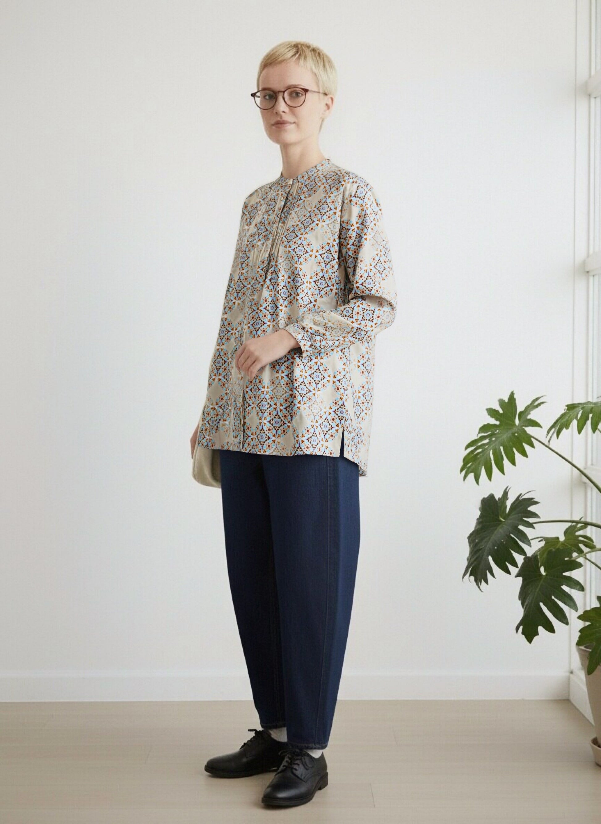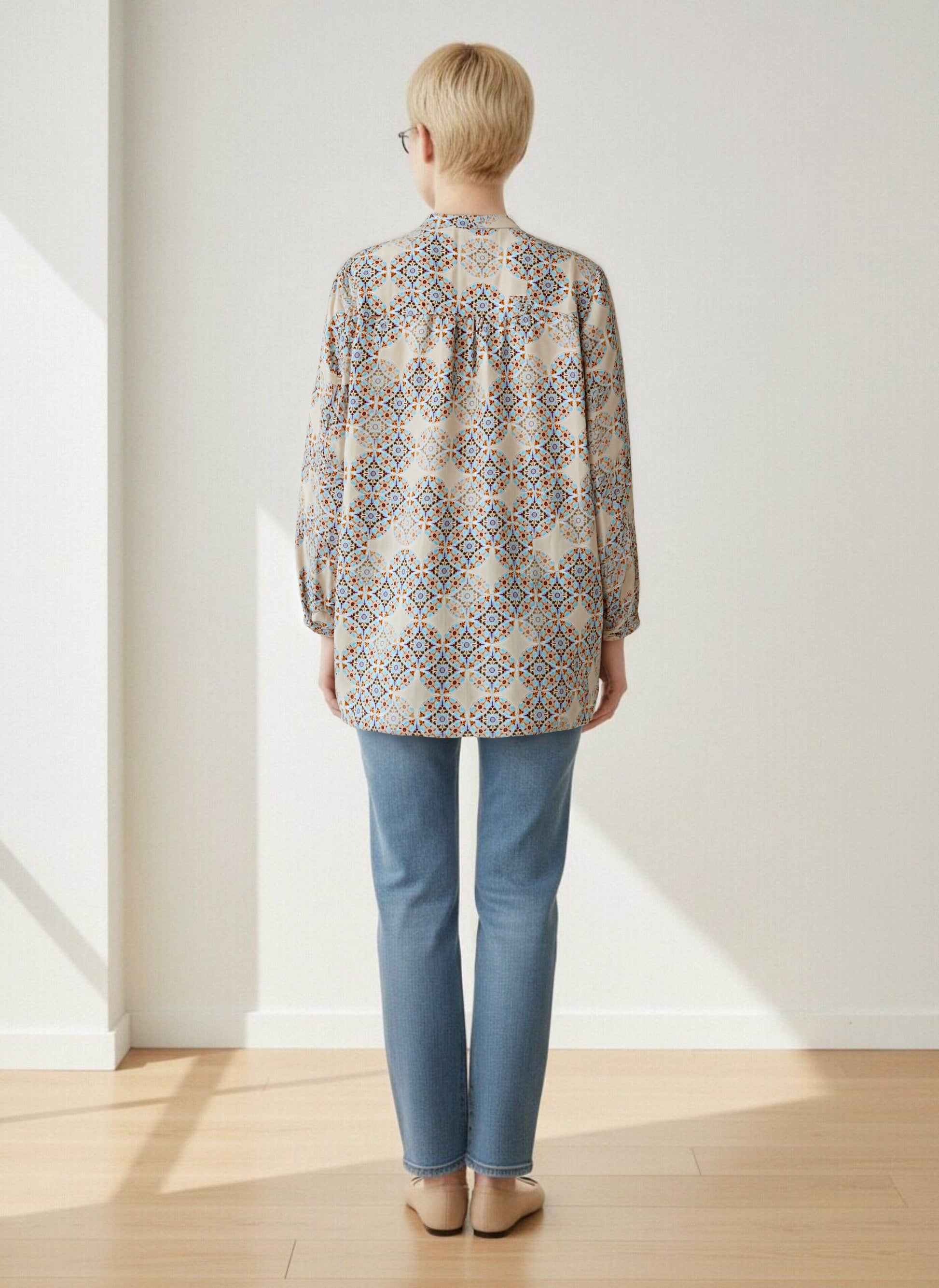 アンティーク調のモロッカン柄を全面にプリントした、存在感溢れる長袖ブラウス。胸元に贅沢に施されたピンタックが、柄の美しさをさらに引き立て、立体的なシルエットを生み出します。スタンドカラーのデザインが全体の印象を引き締め、カジュアルからきれいめまで幅広く対応します。