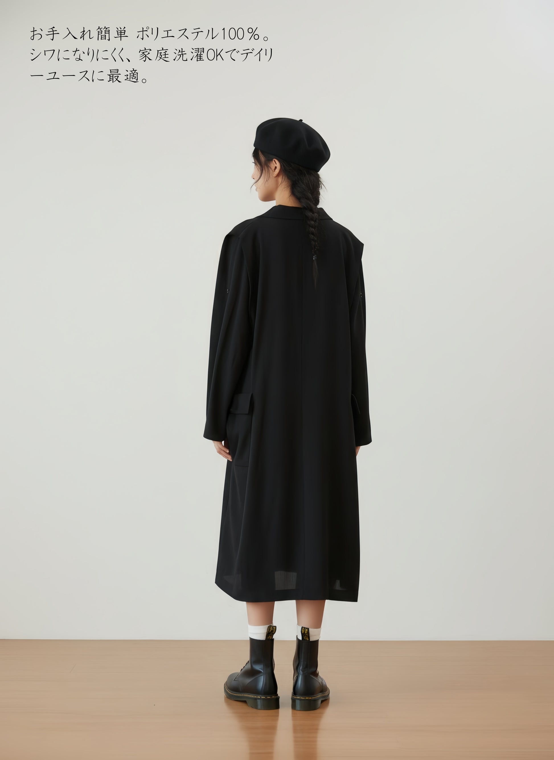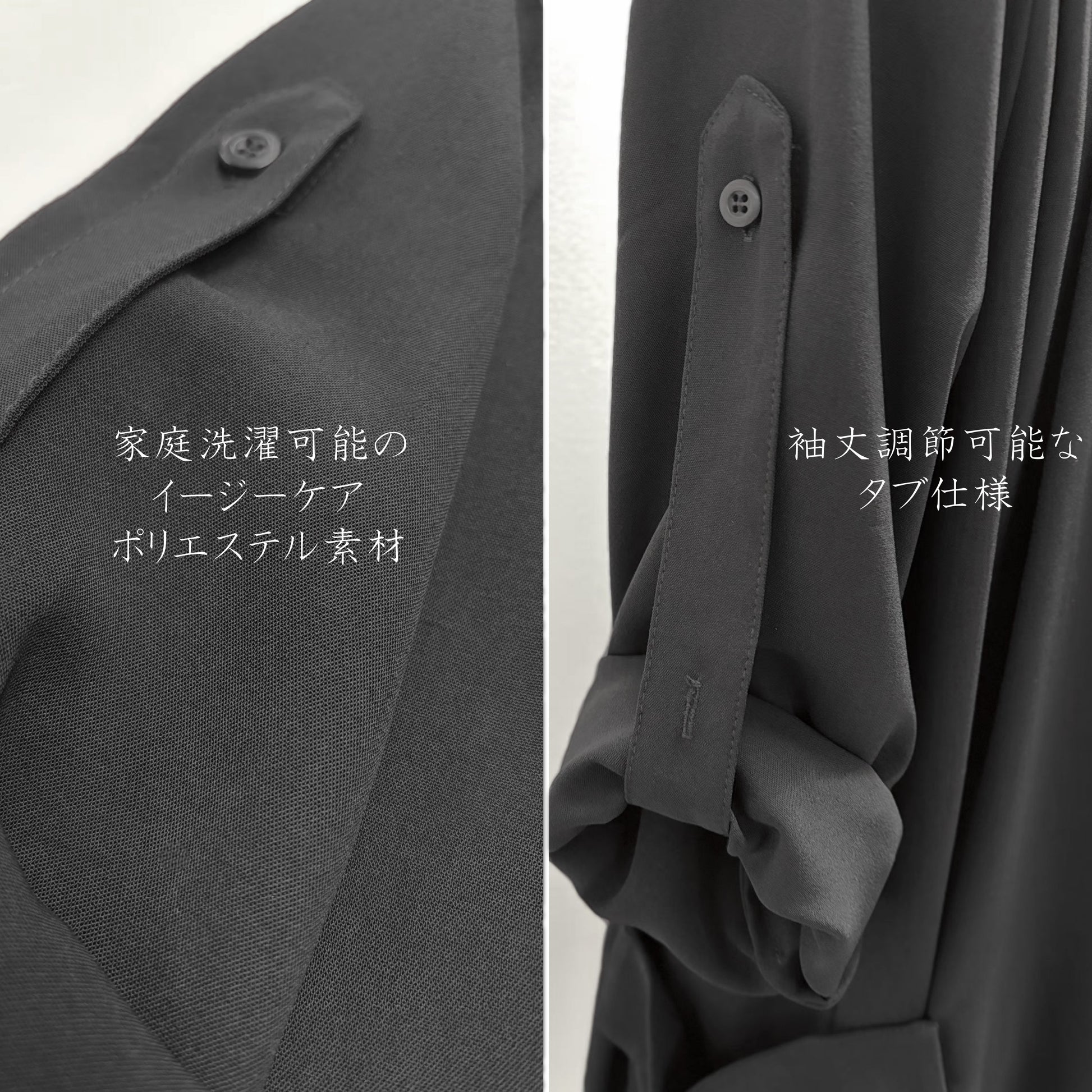お手入れ簡単素材 素材はポリエステル100%で、シワになりにくく、ご家庭の洗濯機で洗えるため、デイリーユースに最適です。