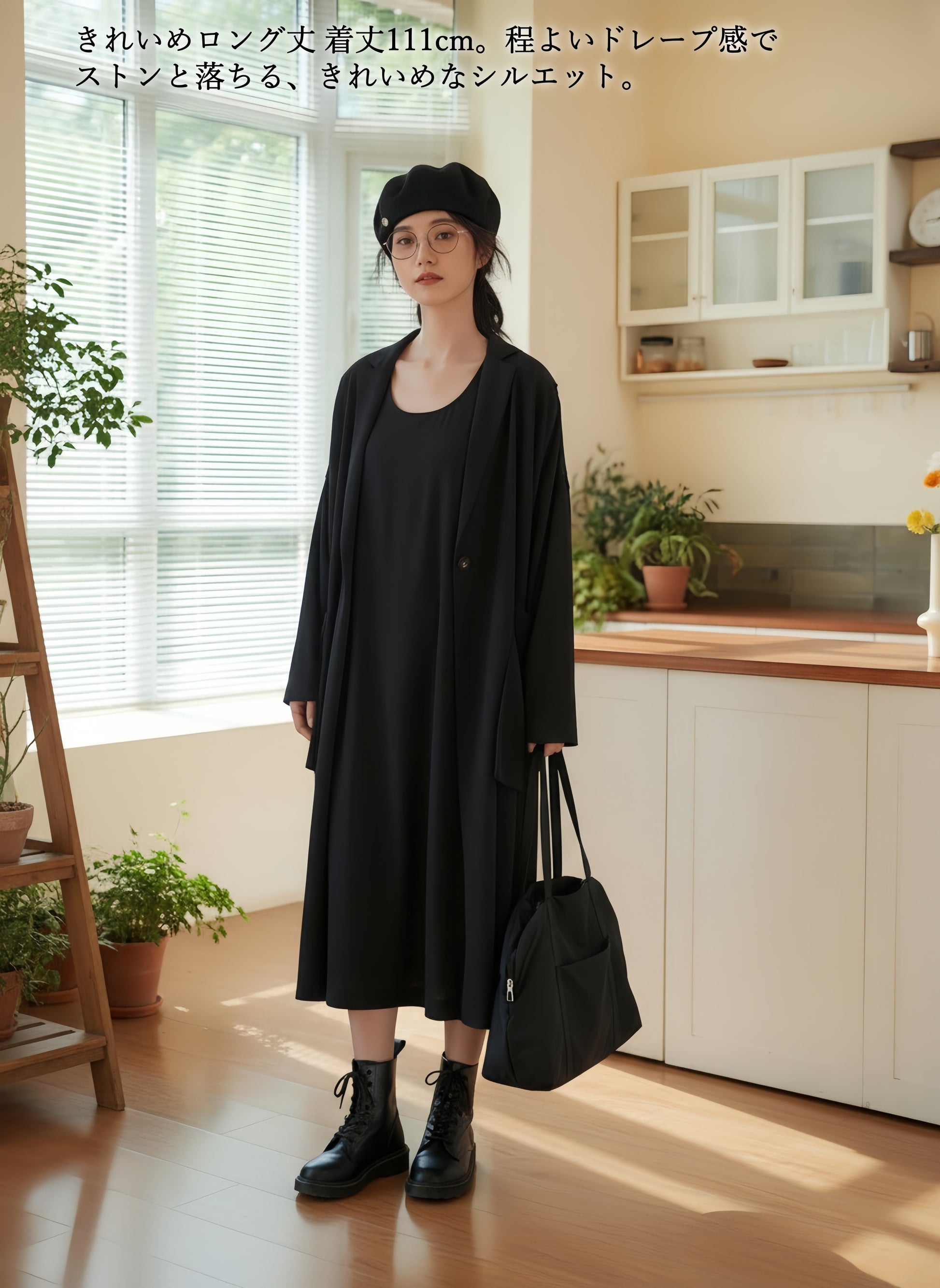 きれいめなロング丈 着丈111cmのロング丈と長袖デザインで、きれいめに着こなせます。