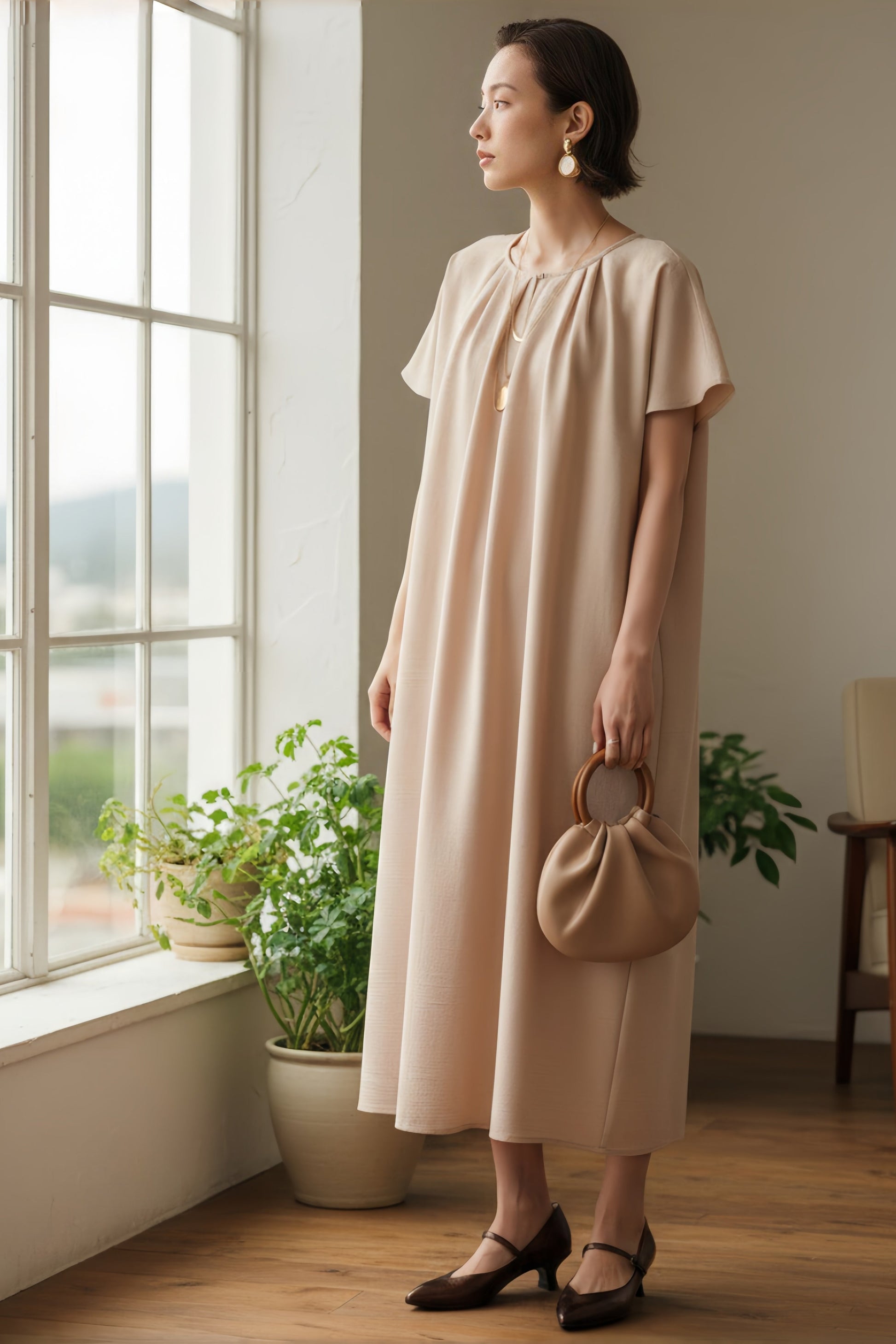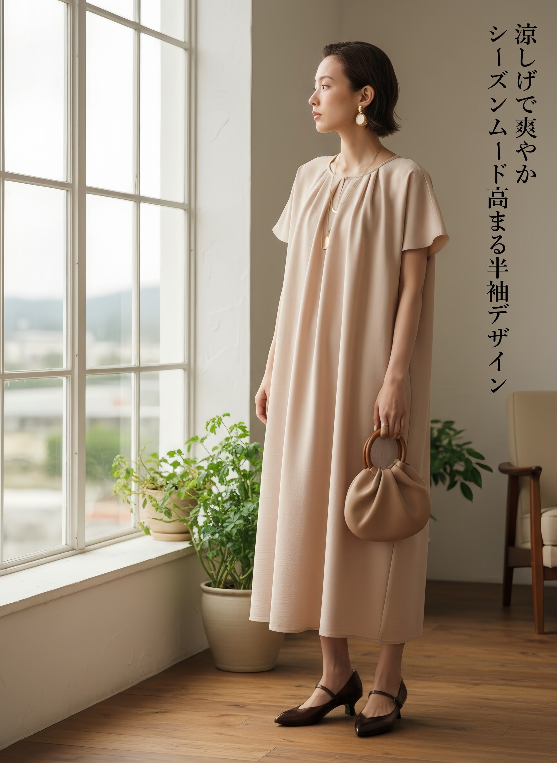 この半袖タックワンピース・ゆとりシルエット・ライン入り素材ワンピは、その着まわしの利くデザインと快適な素材で、様々な場面で活躍すること間違いなしです。自由なファッションの楽しさを存分に味わってください。