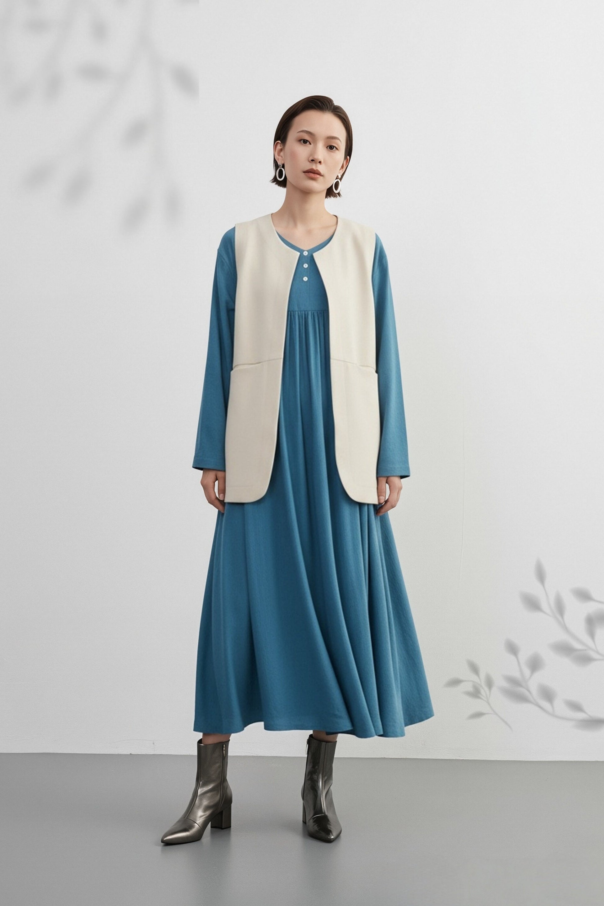 飾りボタンギャザーロング丈リネンMIX長袖ワンピース