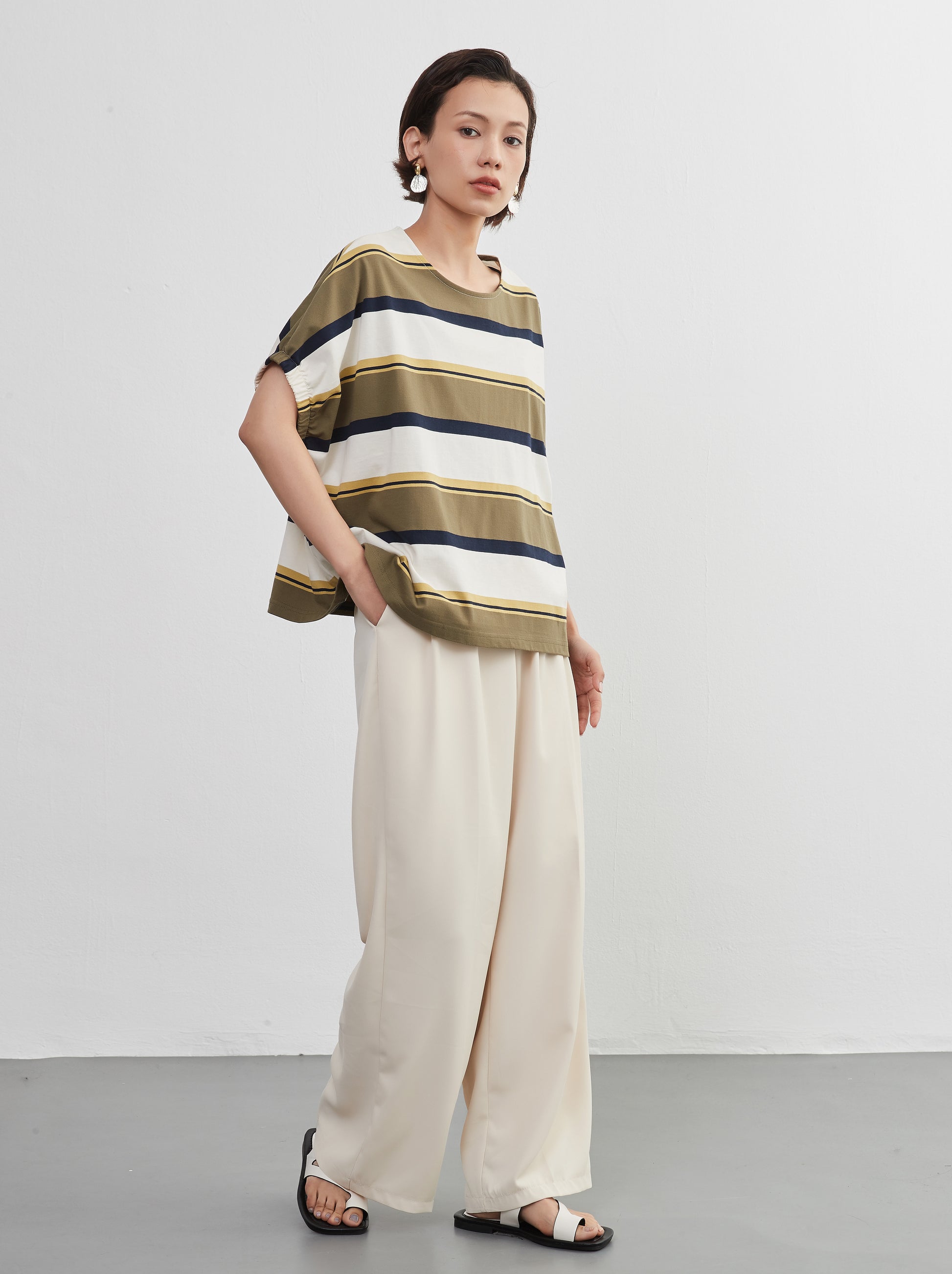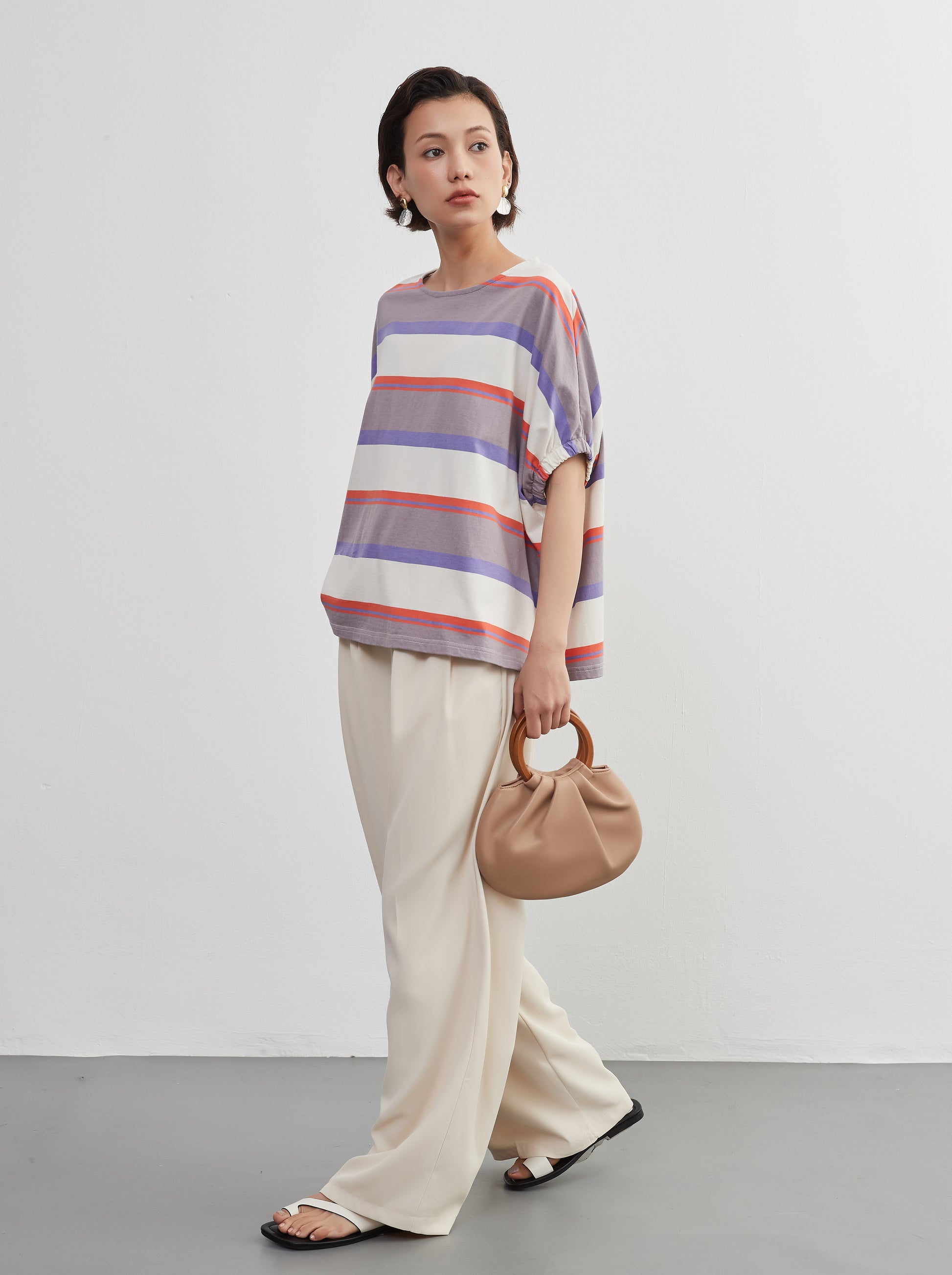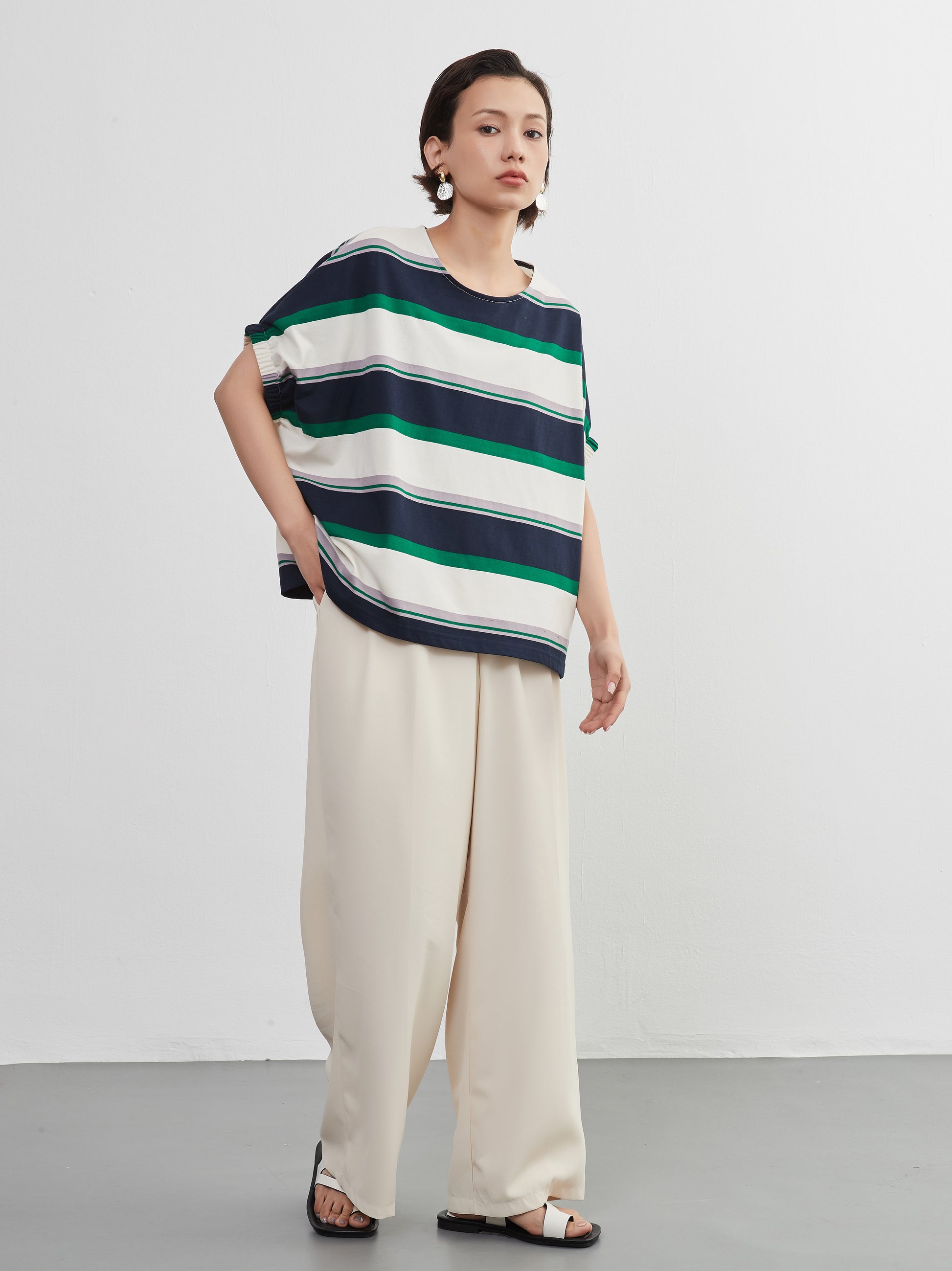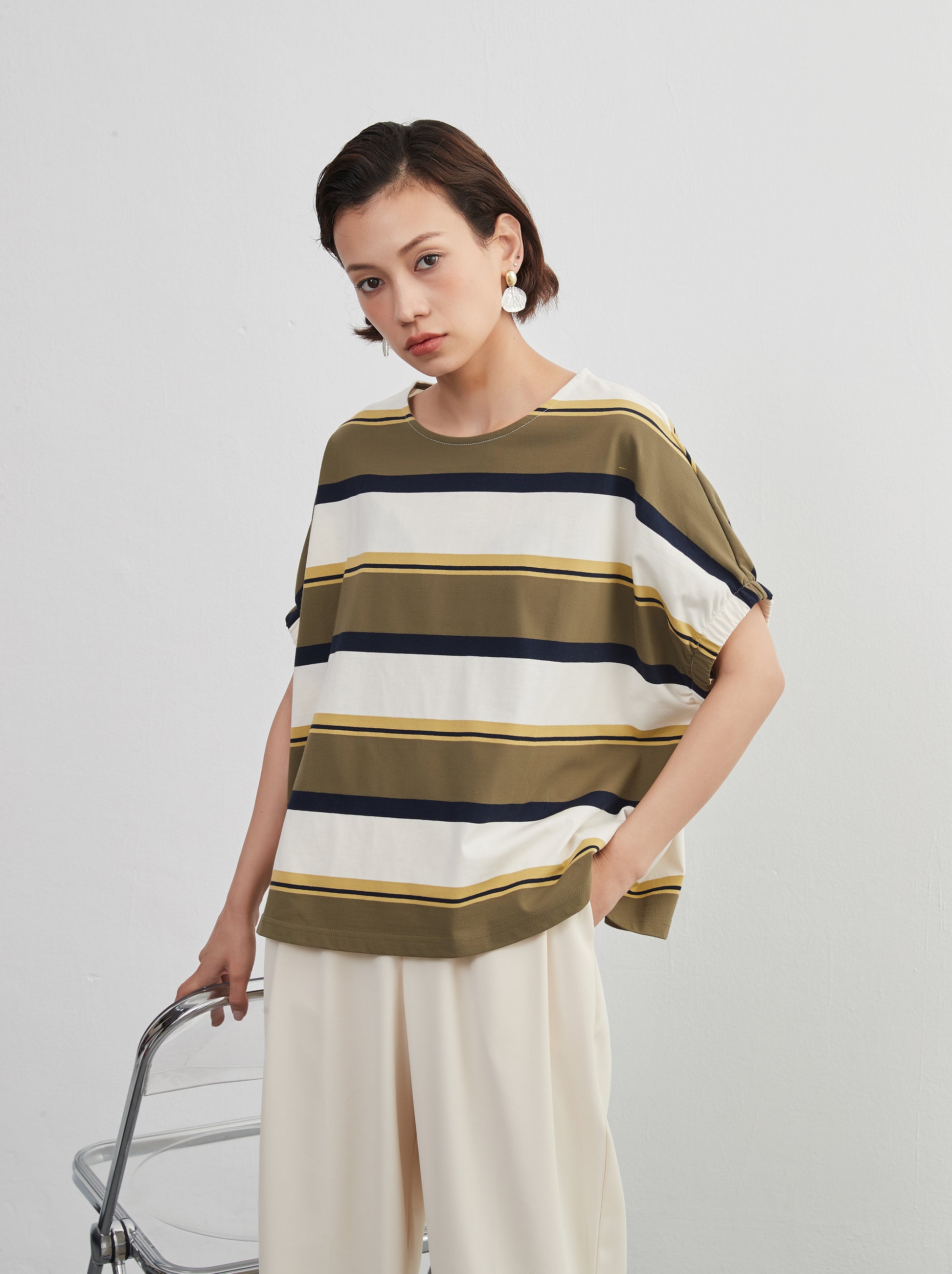 夏の定番、爽やかな半袖ボーダーTシャツが、新しいスタイルで登場。綿100%の心地よい肌触りと、トレンド感漂うドルマンスリーブが特徴の、軽やかでおしゃれなトップスです。