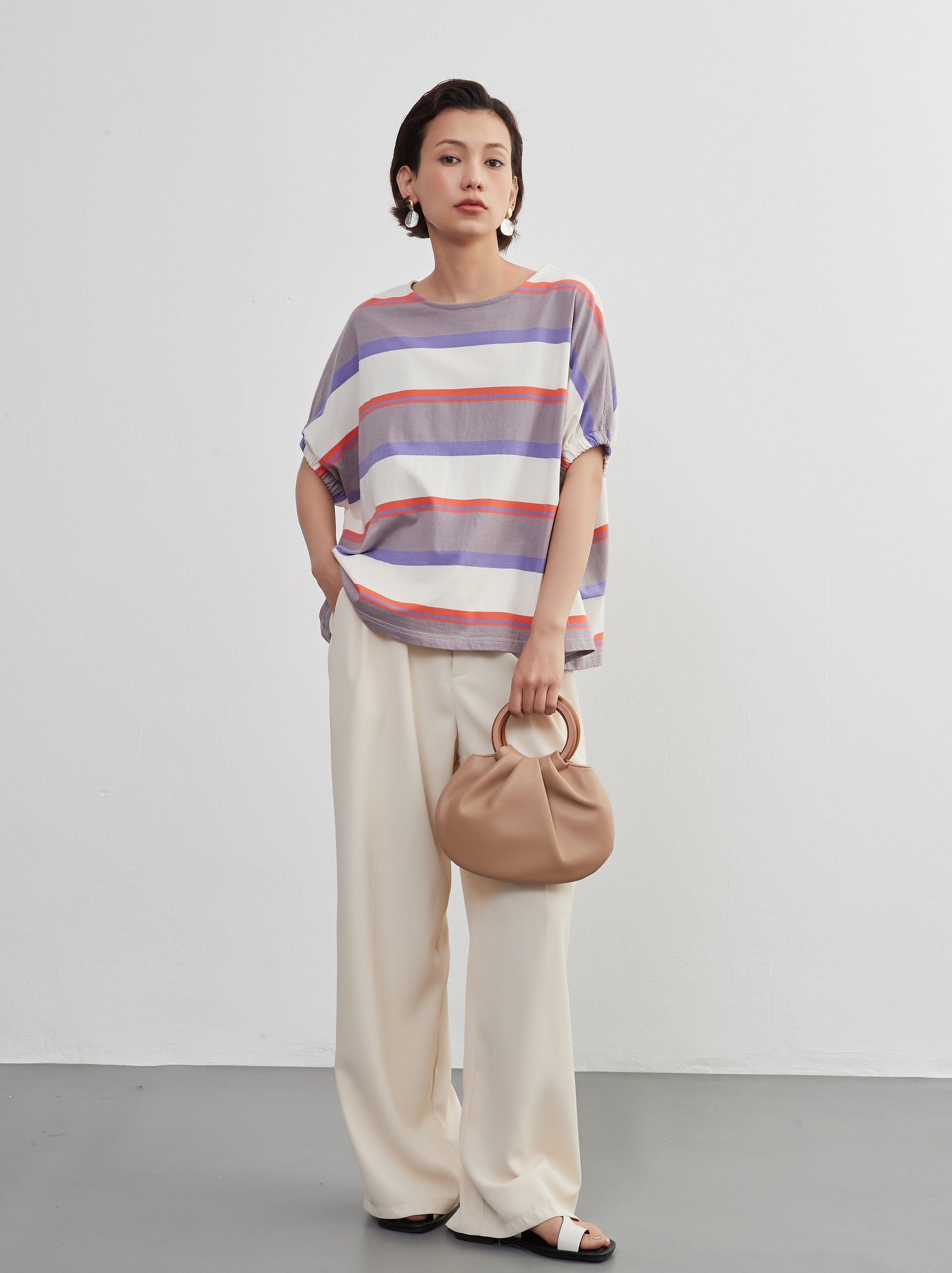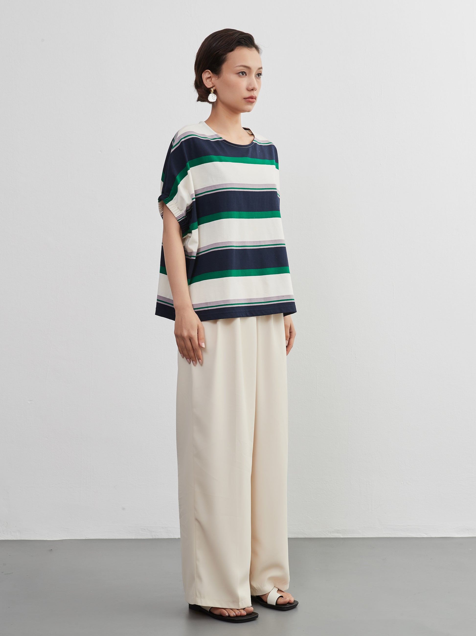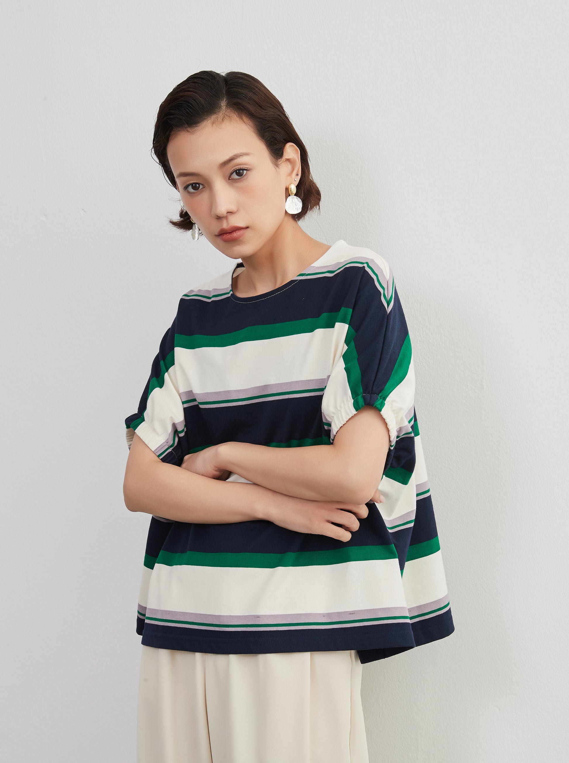 夏の定番、爽やかな半袖ボーダーTシャツが、新しいスタイルで登場。綿100%の心地よい肌触りと、トレンド感漂うドルマンスリーブが特徴の、軽やかでおしゃれなトップスです。