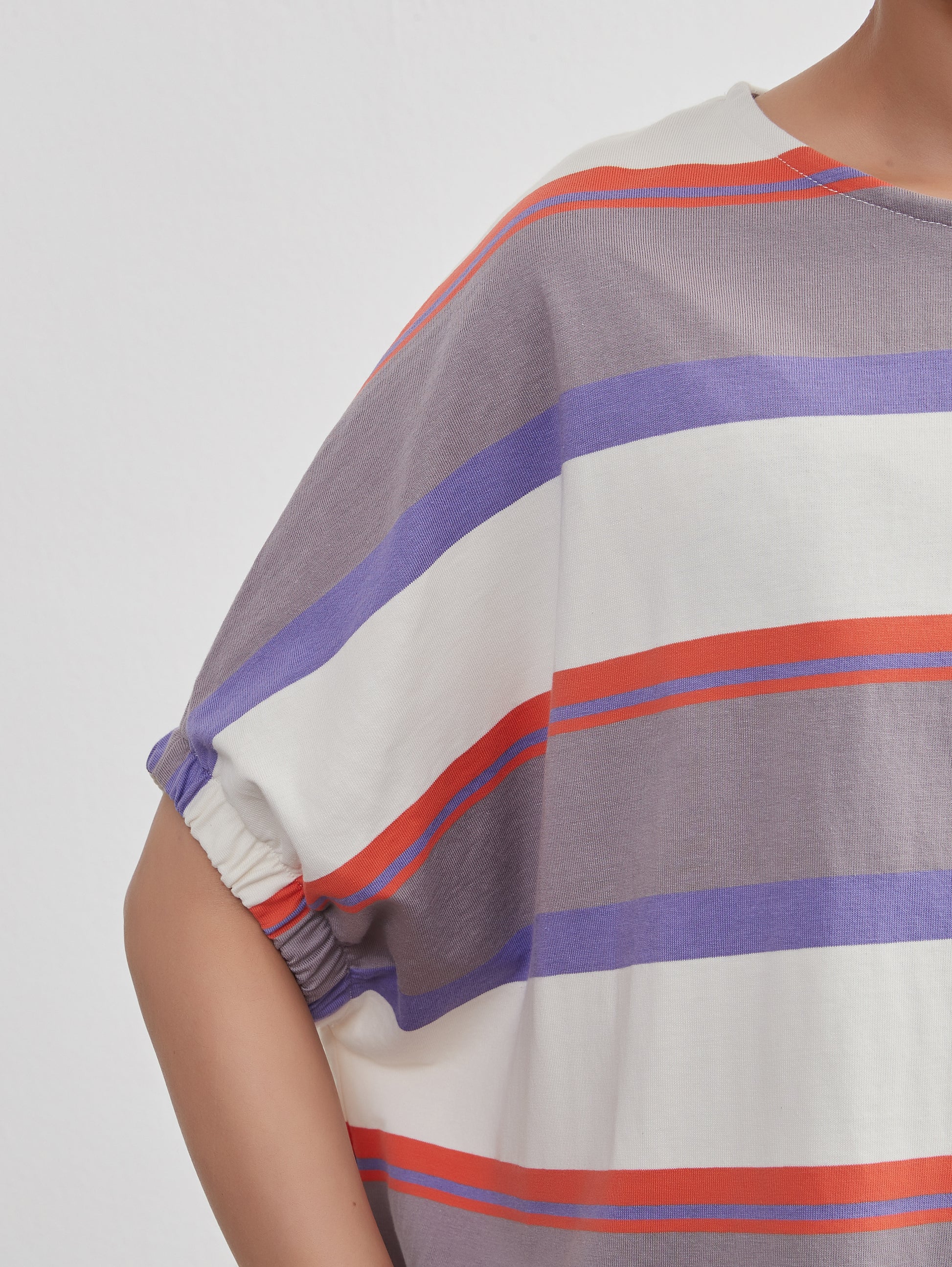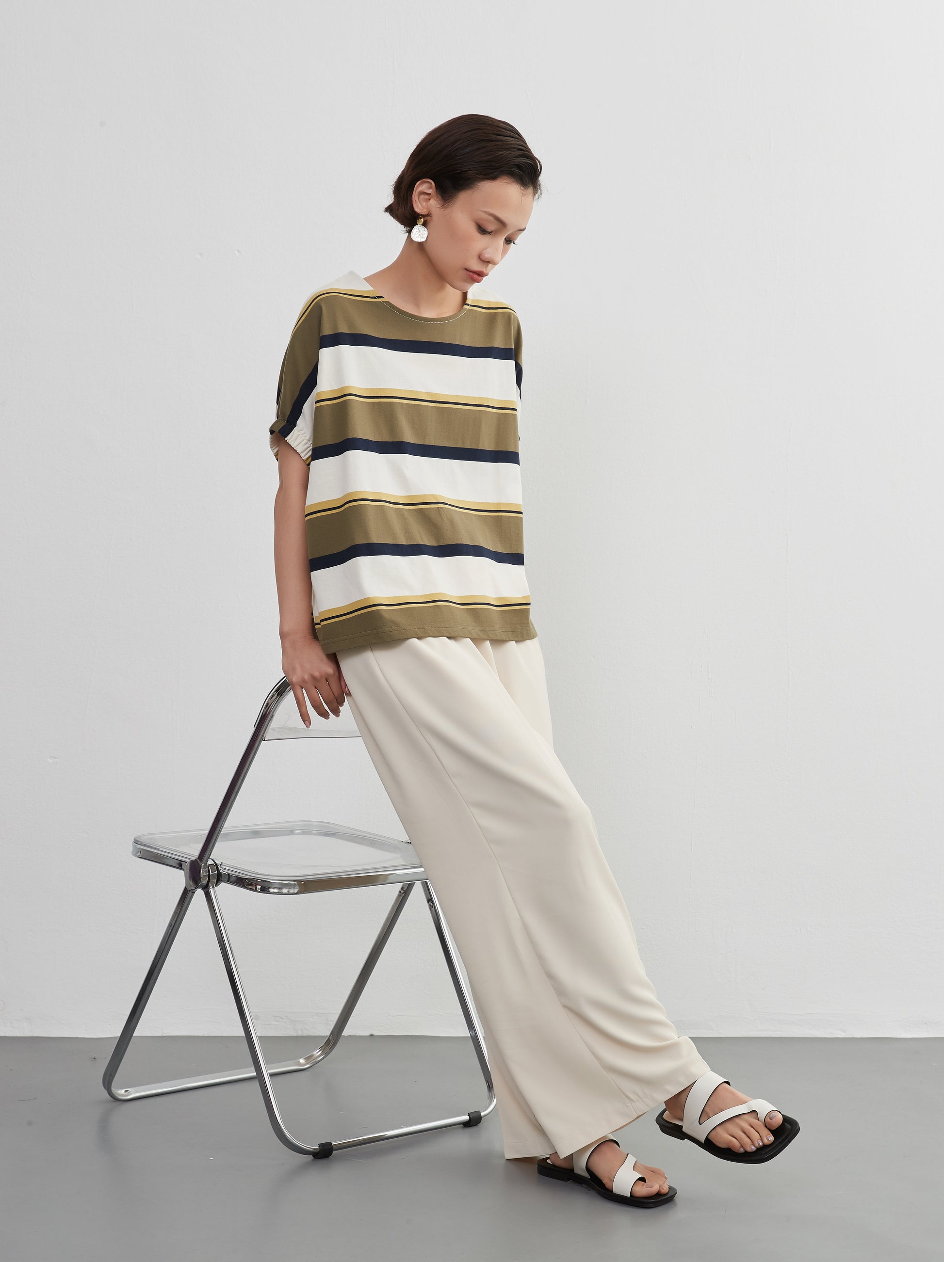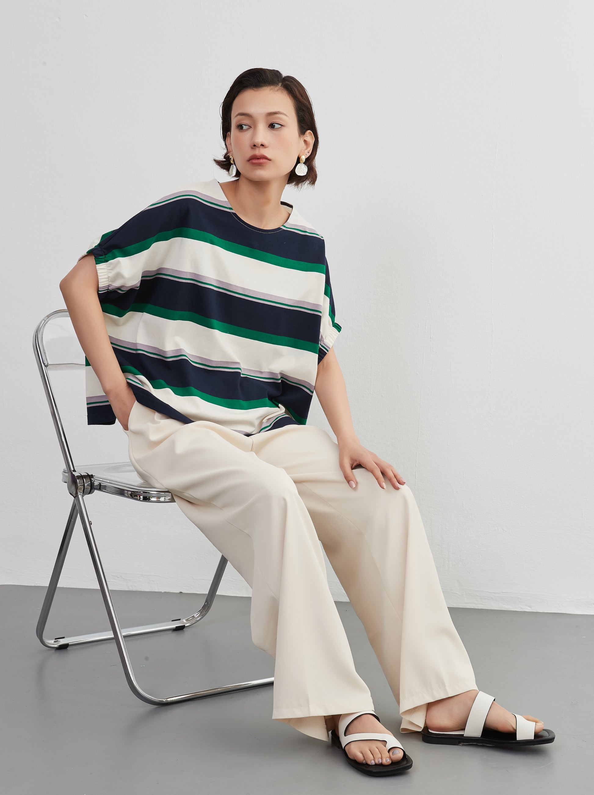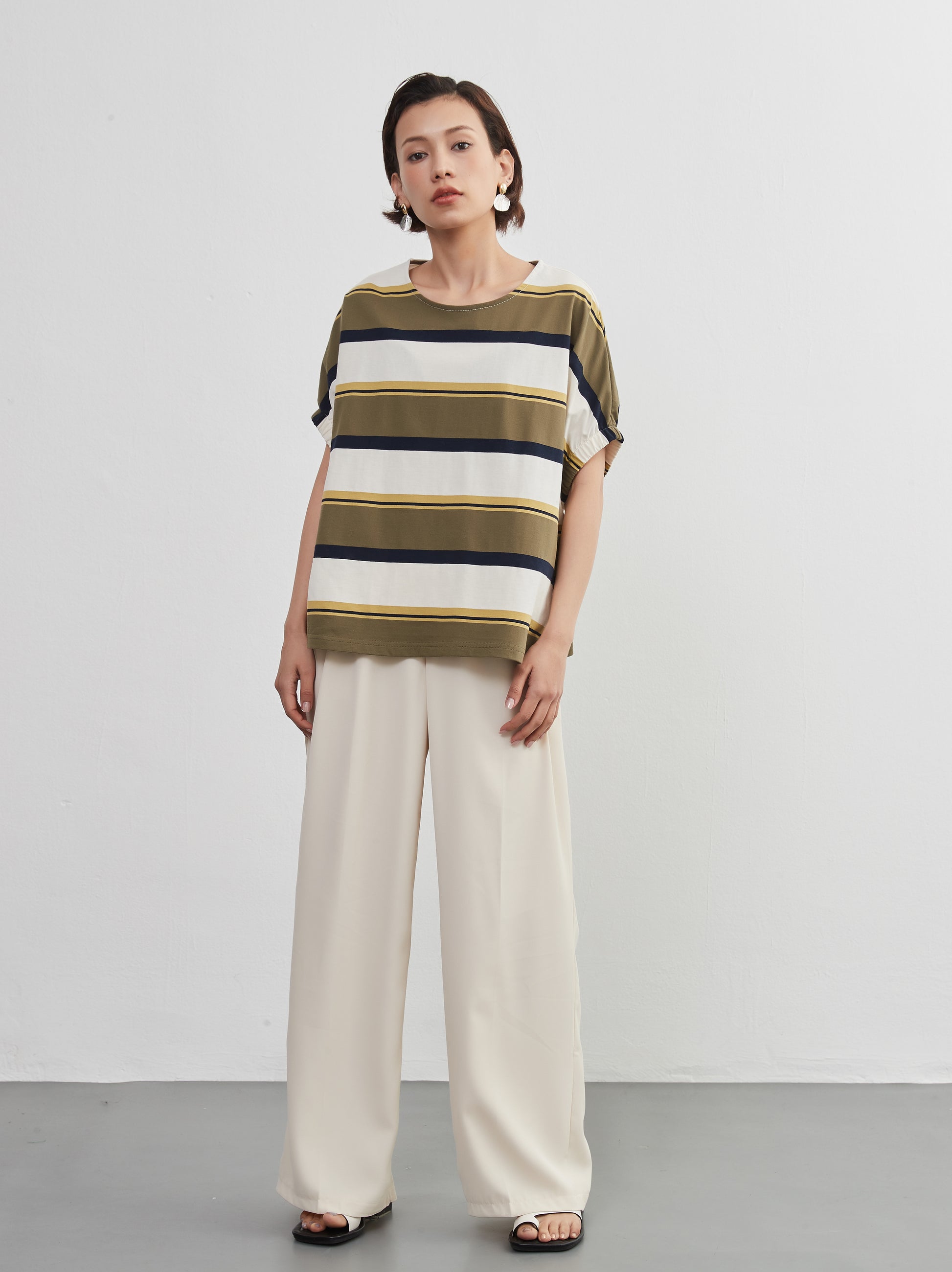 夏の定番、爽やかな半袖ボーダーTシャツが、新しいスタイルで登場。綿100%の心地よい肌触りと、トレンド感漂うドルマンスリーブが特徴の、軽やかでおしゃれなトップスです。