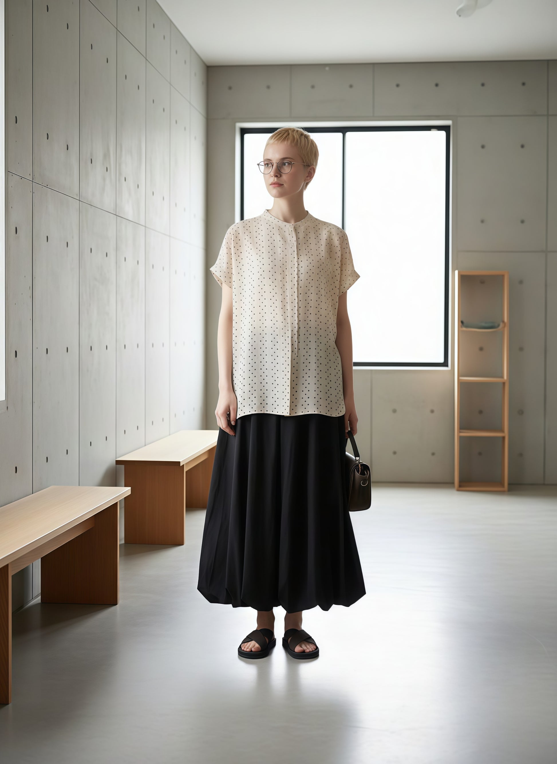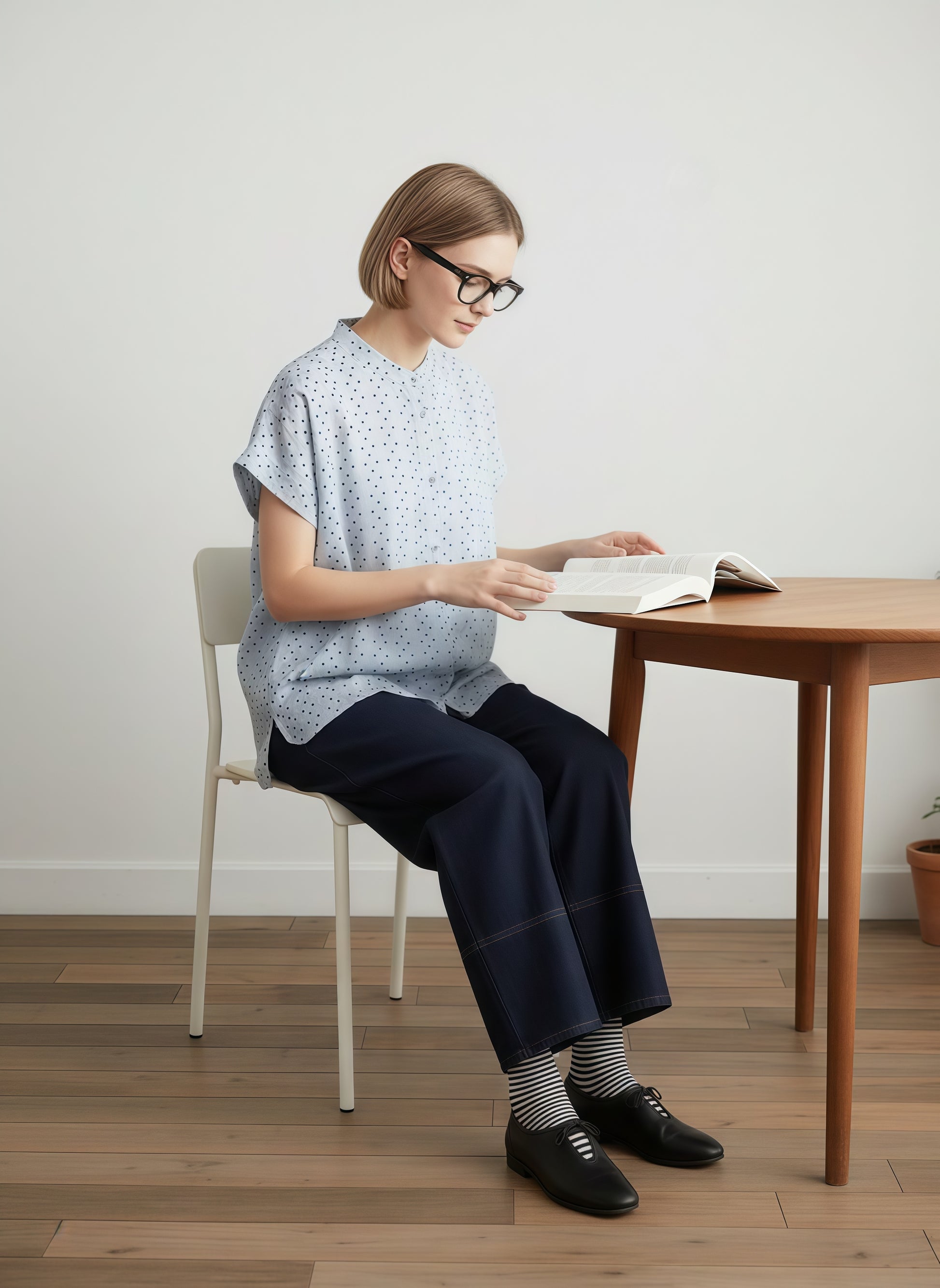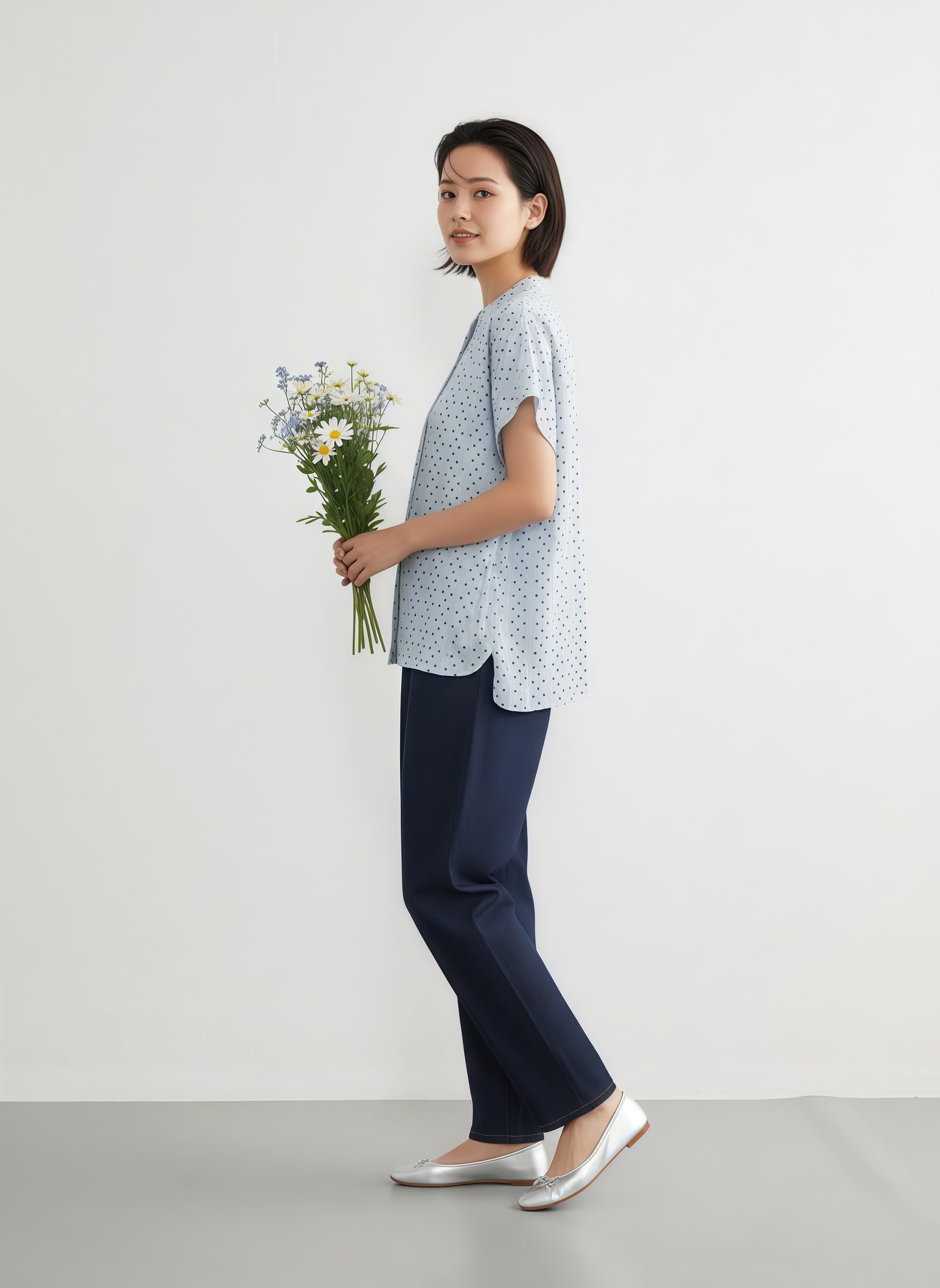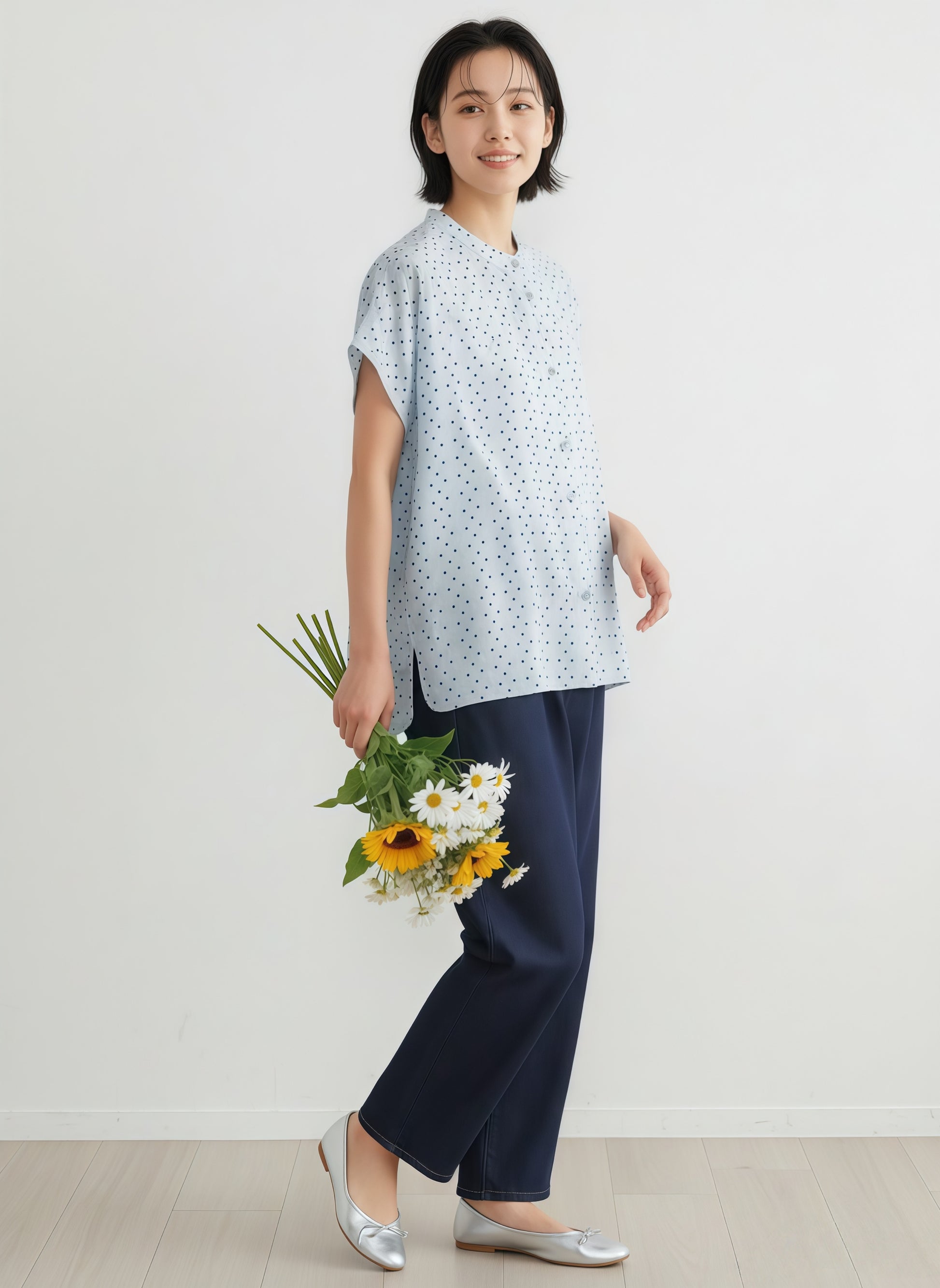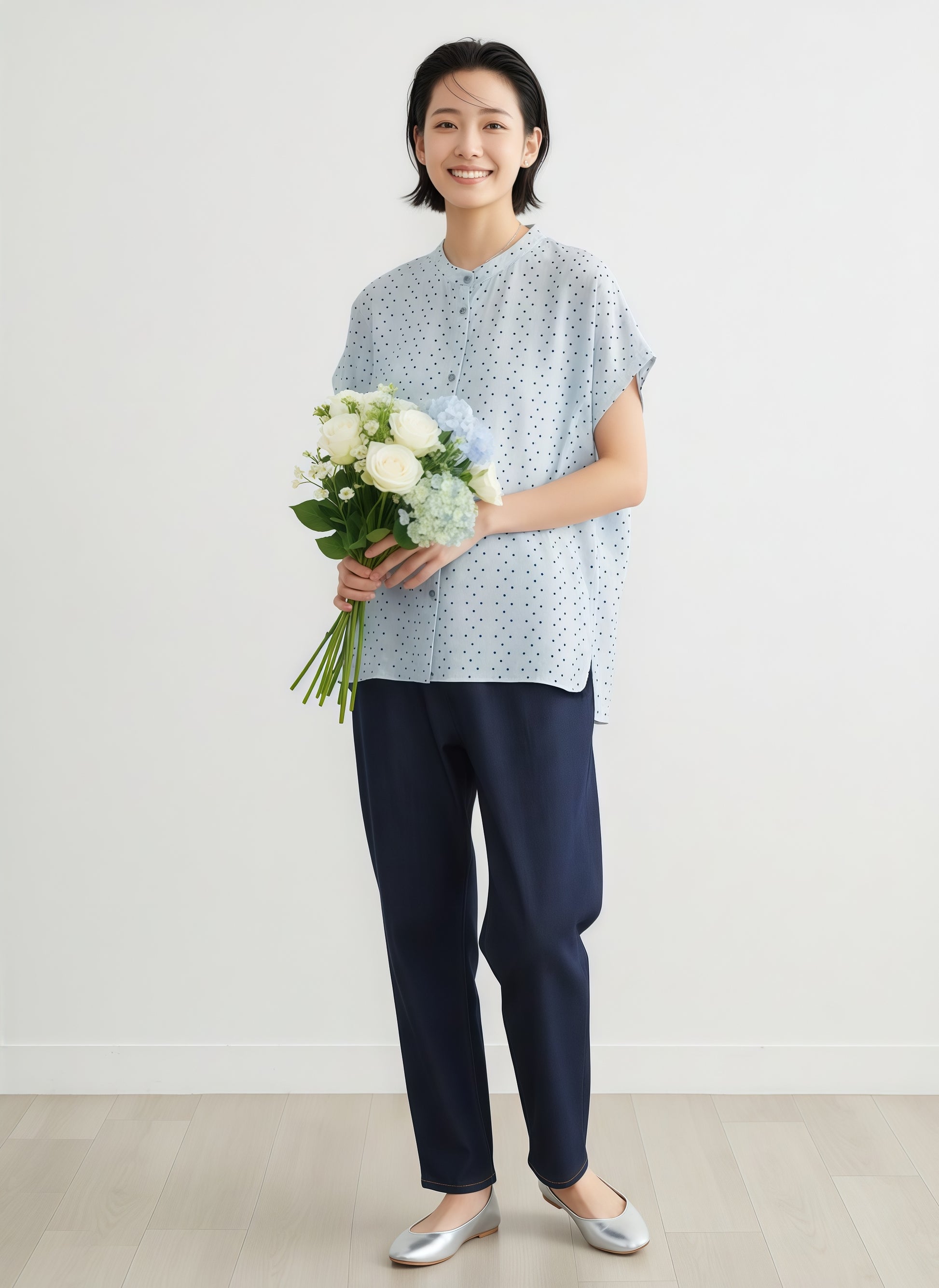 ほんのりと透け感のある軽やかな素材が、夏のオフィスシーンに涼しげな清潔感を与えます。