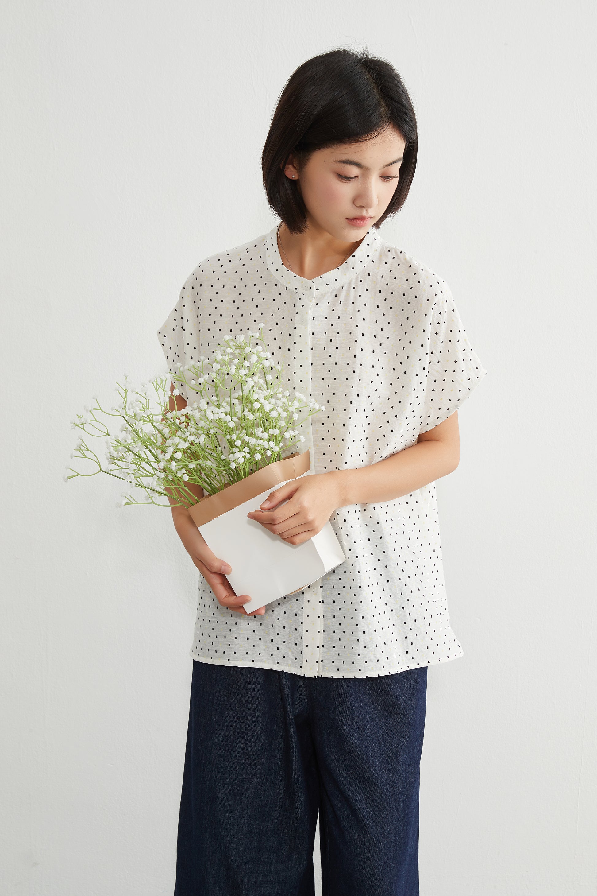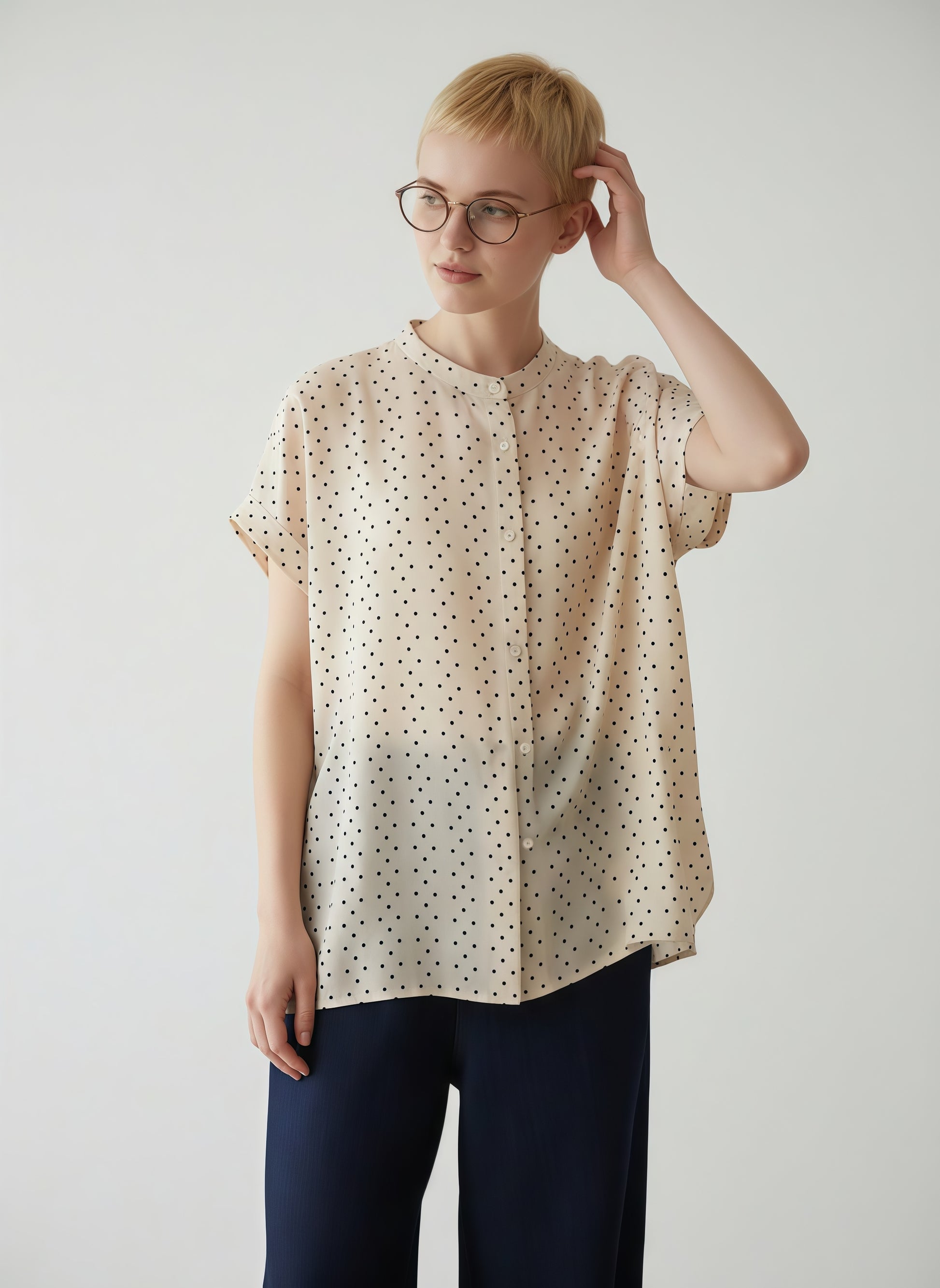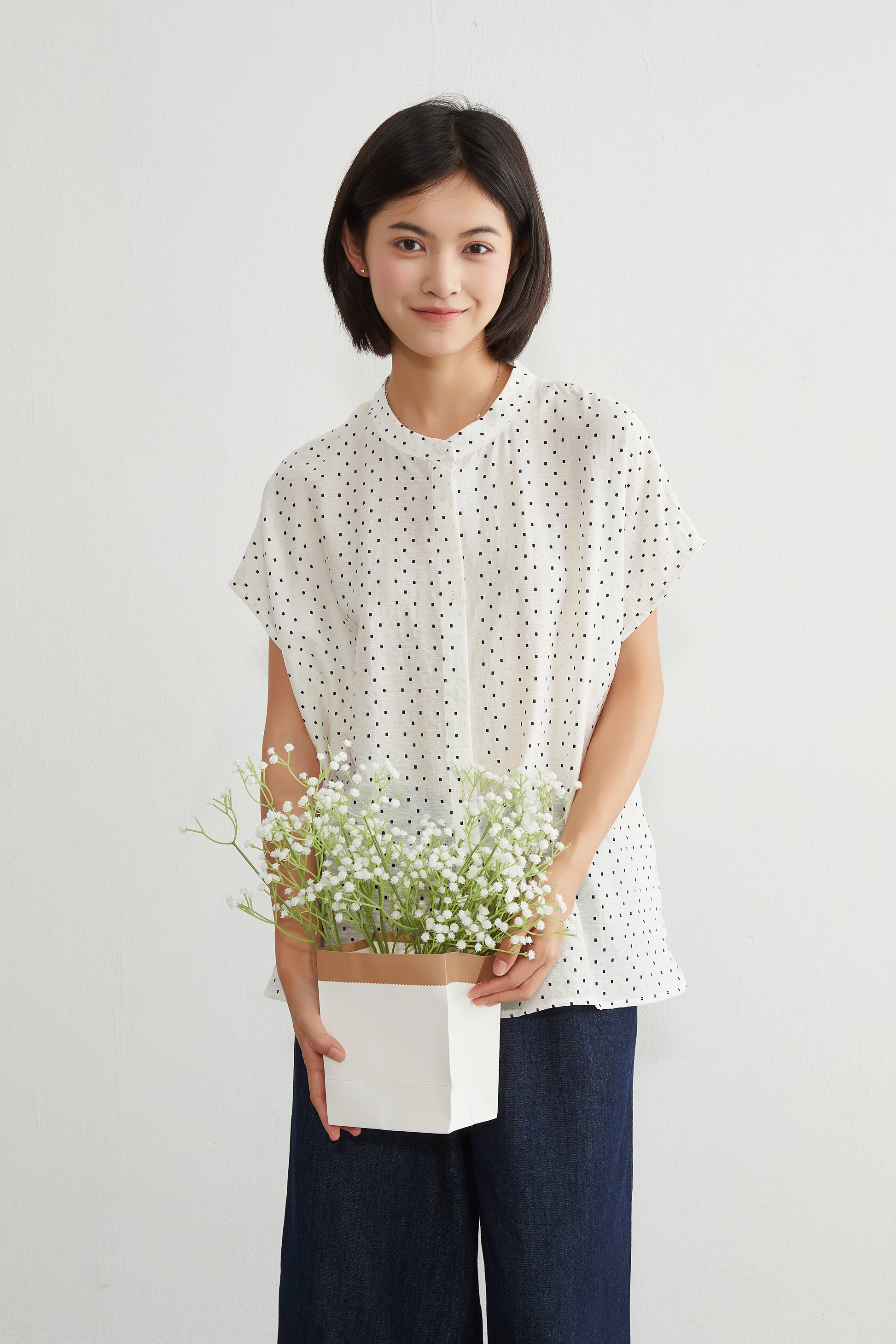 ほどよいゆとりと抜け感が魅力のBOXYシルエットに、小さなスクエア柄をプリントした半袖ブラウス。リラックス感のあるルーズフィットながら、すっきりと見えるシンプルなデザインで、定番として着回しやすい一枚です。