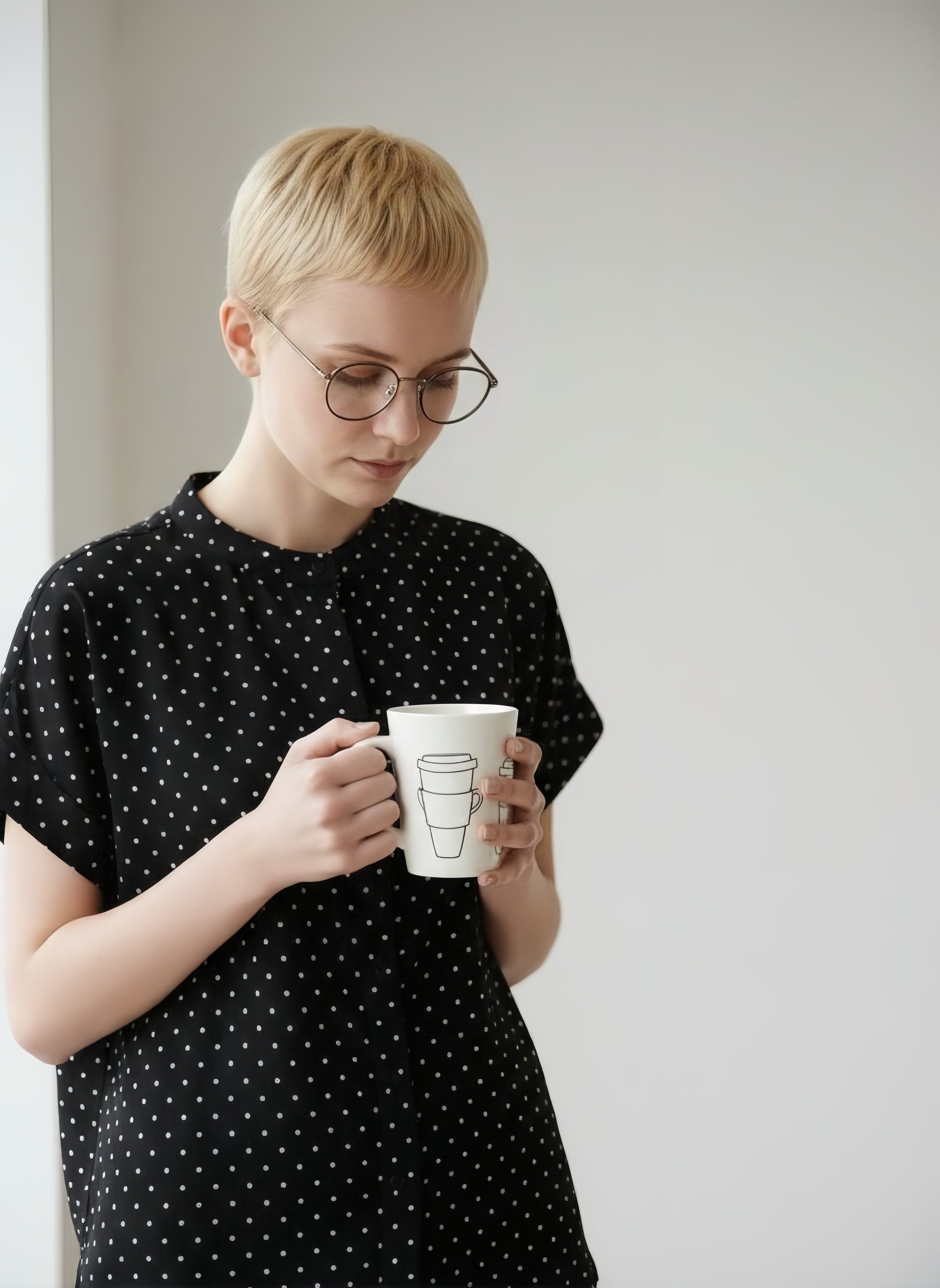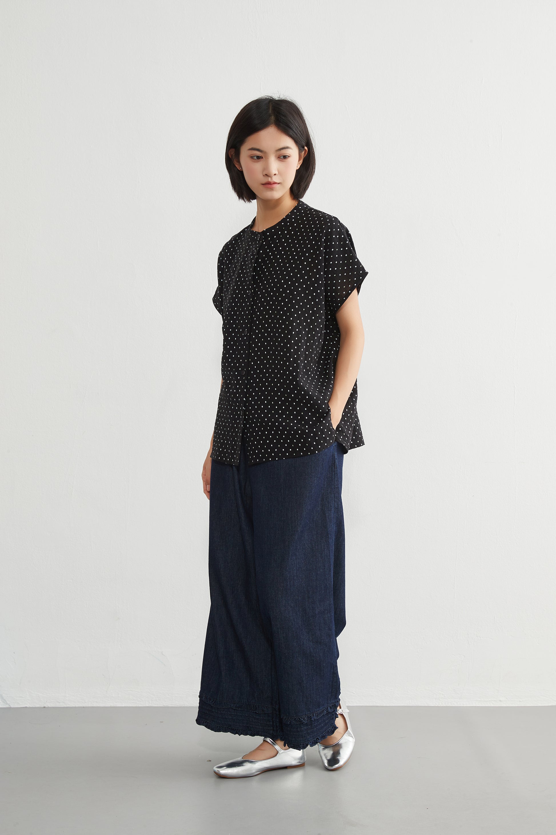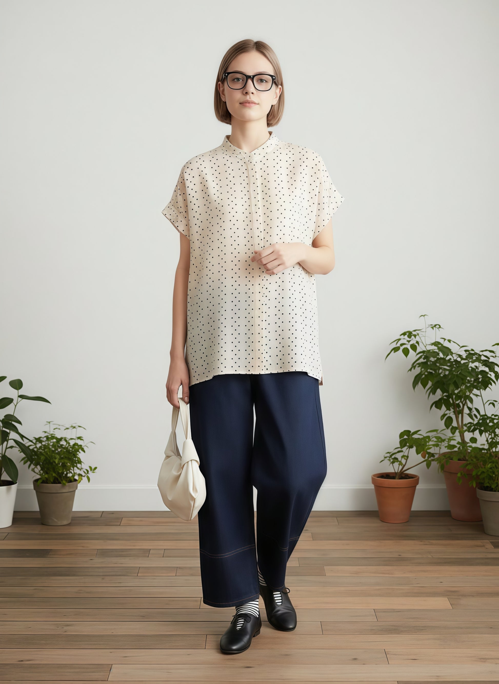 ほどよいゆとりと抜け感が魅力のBOXYシルエットに、小さなスクエア柄をプリントした半袖ブラウス。リラックス感のあるルーズフィットながら、すっきりと見えるシンプルなデザインで、定番として着回しやすい一枚です。