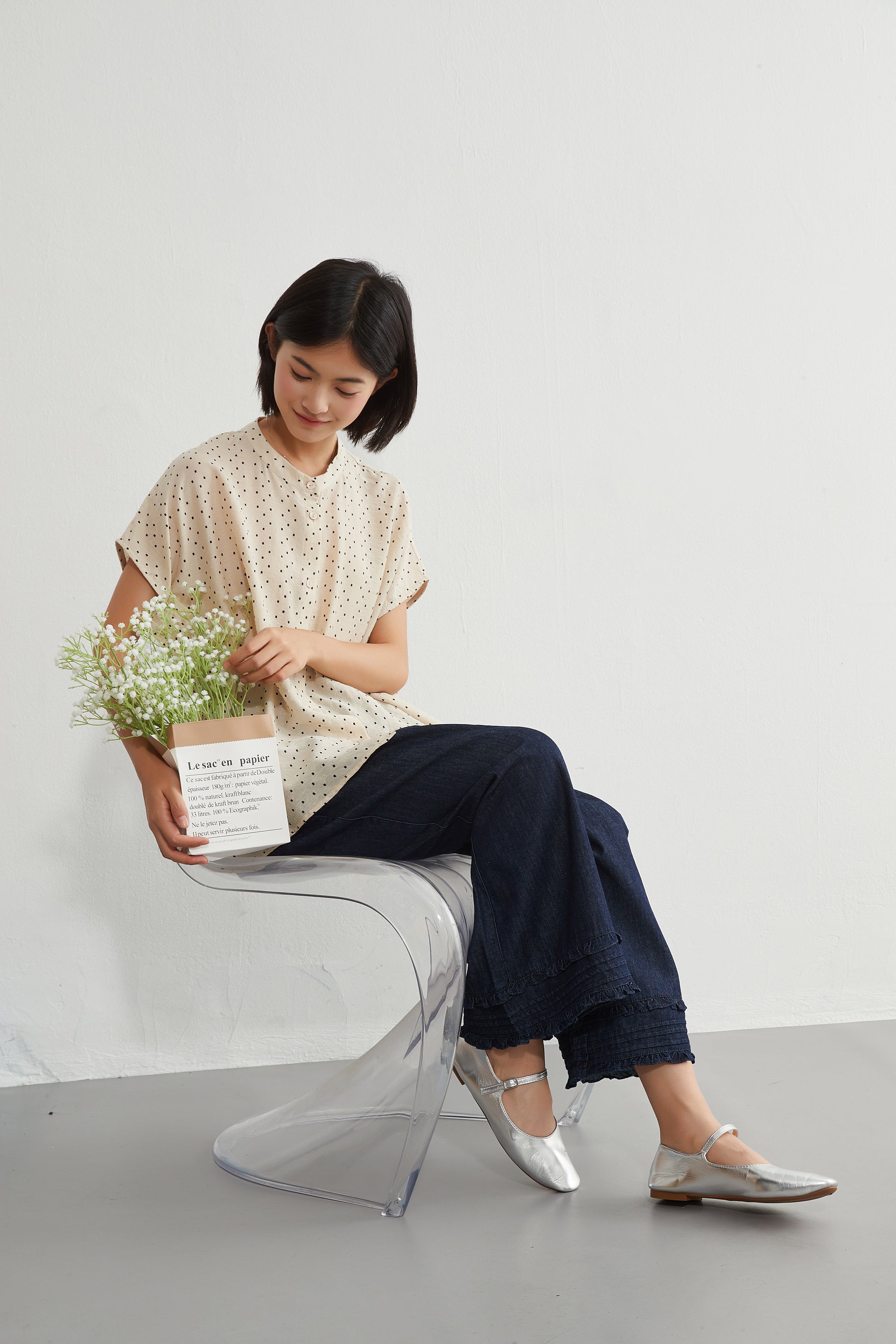 定番のデニムパンツと合わせるだけで、ブラウスのシャリ感のある素材感とスクエア柄が引き立ちます。