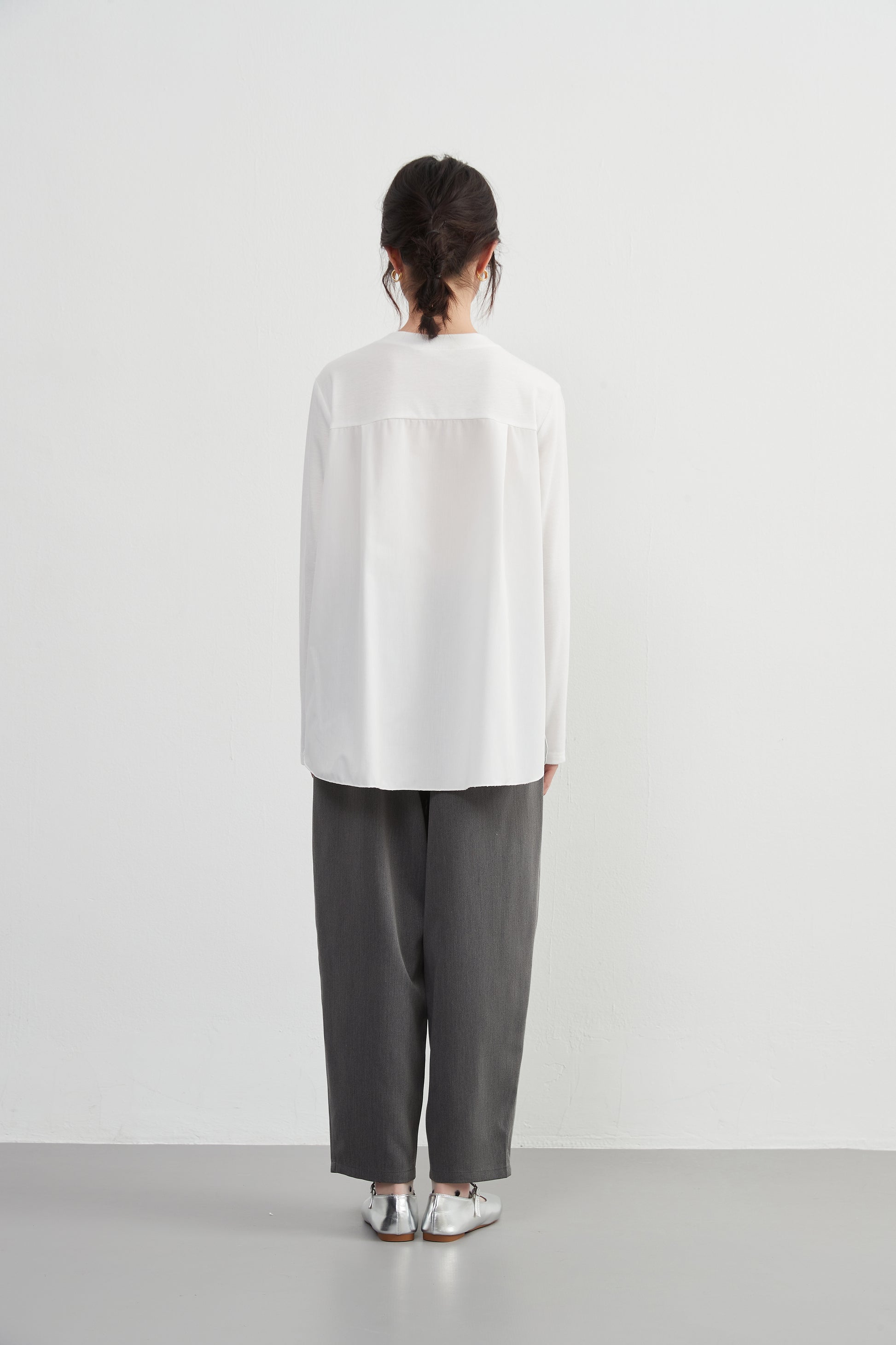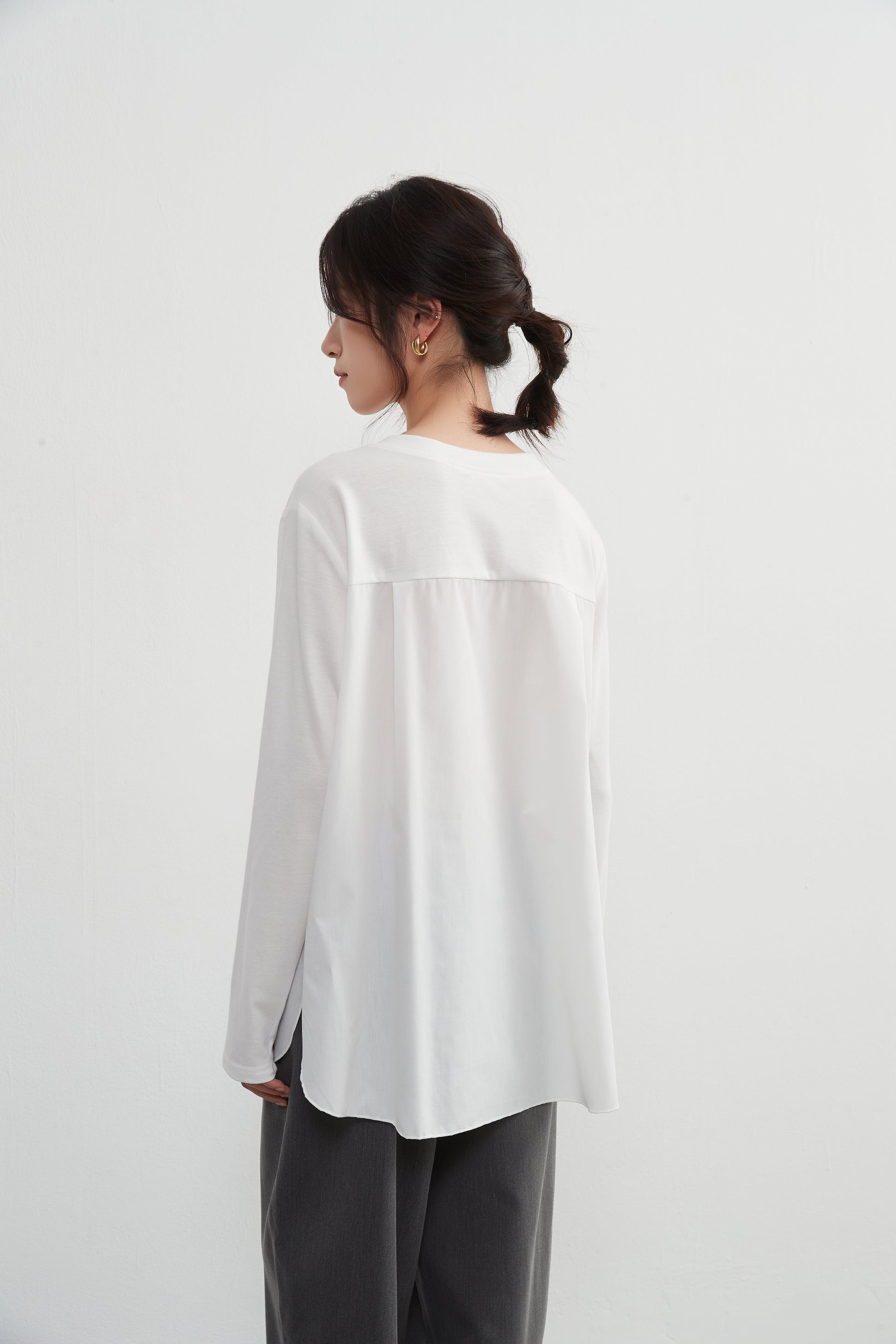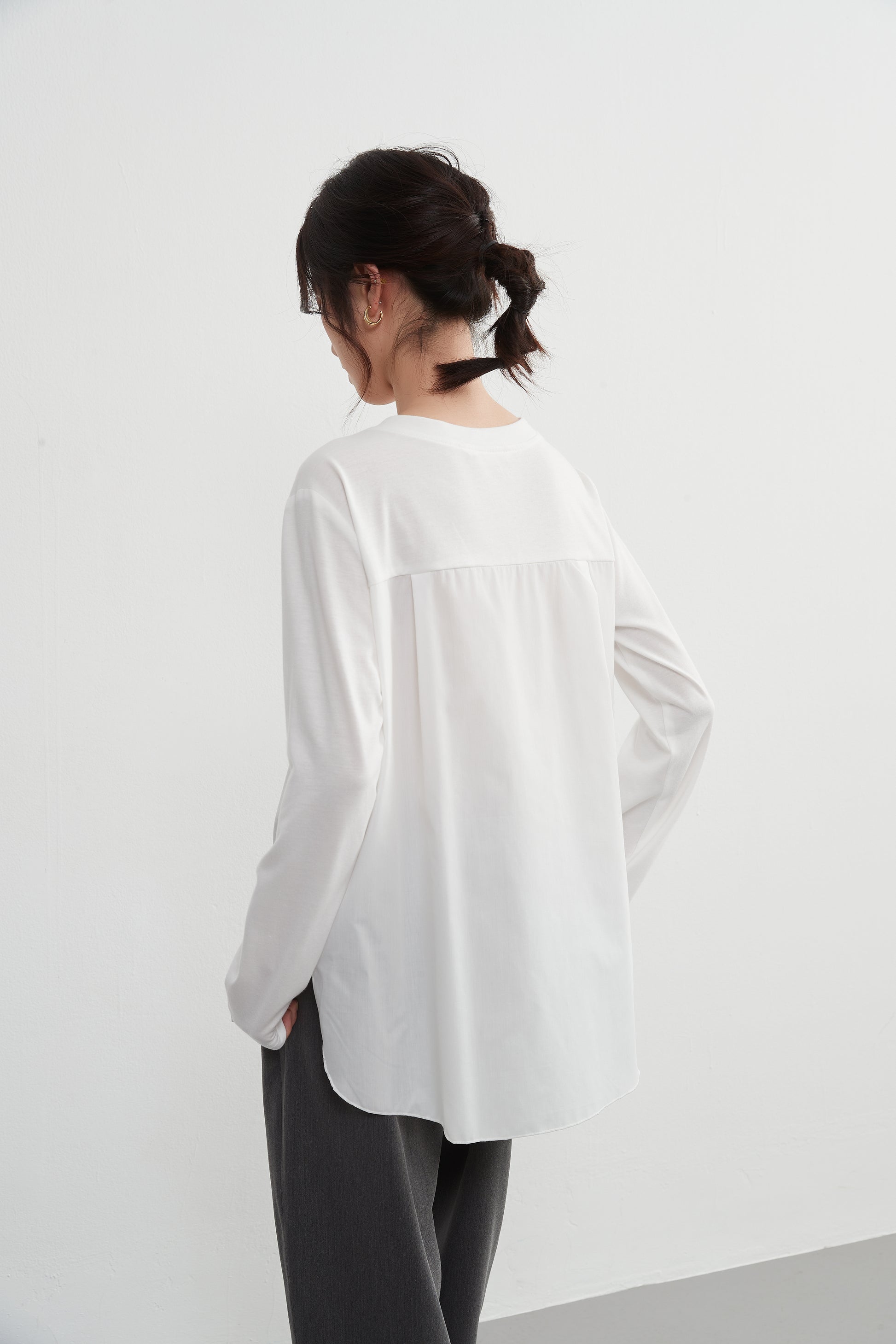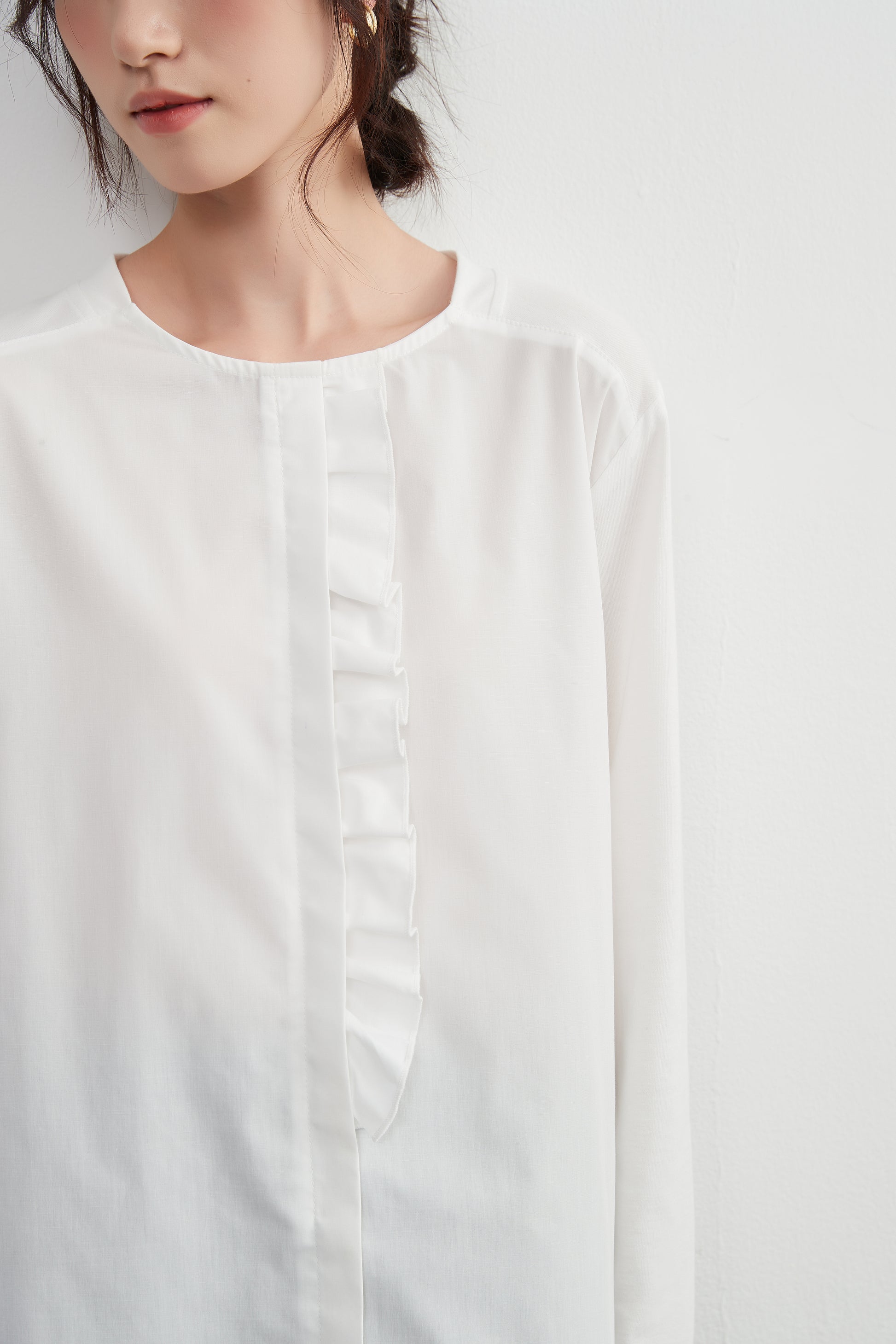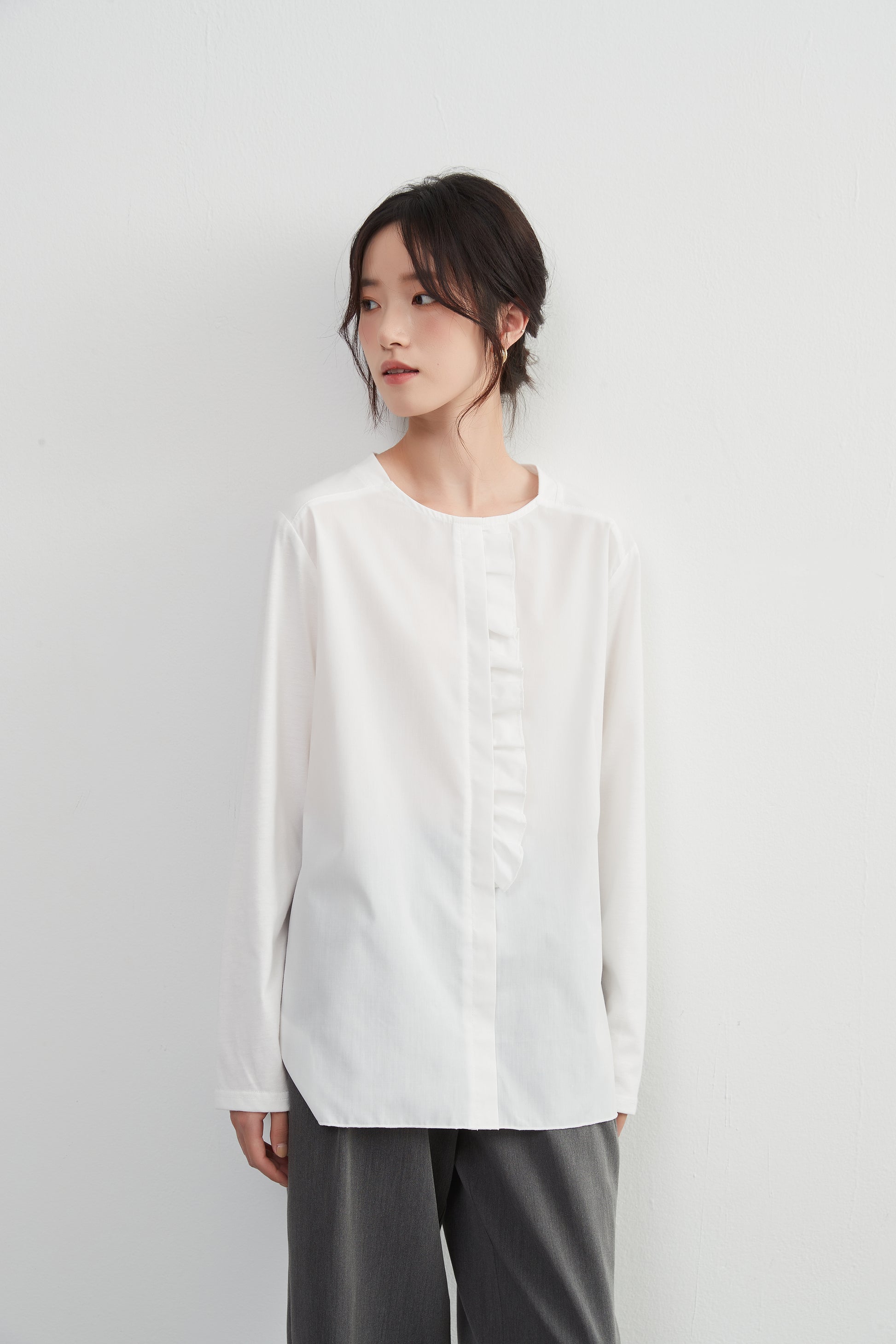 フリルデザインの前立てがかわいく決まるこのプルオーバートップは、布帛とカットソーのドッキングデザインです。程よい甘めのディテールとシンプルさが一体化しており、スタイリッシュかつフェミニンな印象を与えます。春秋のシーズンにぴったりな定番アイテムです。