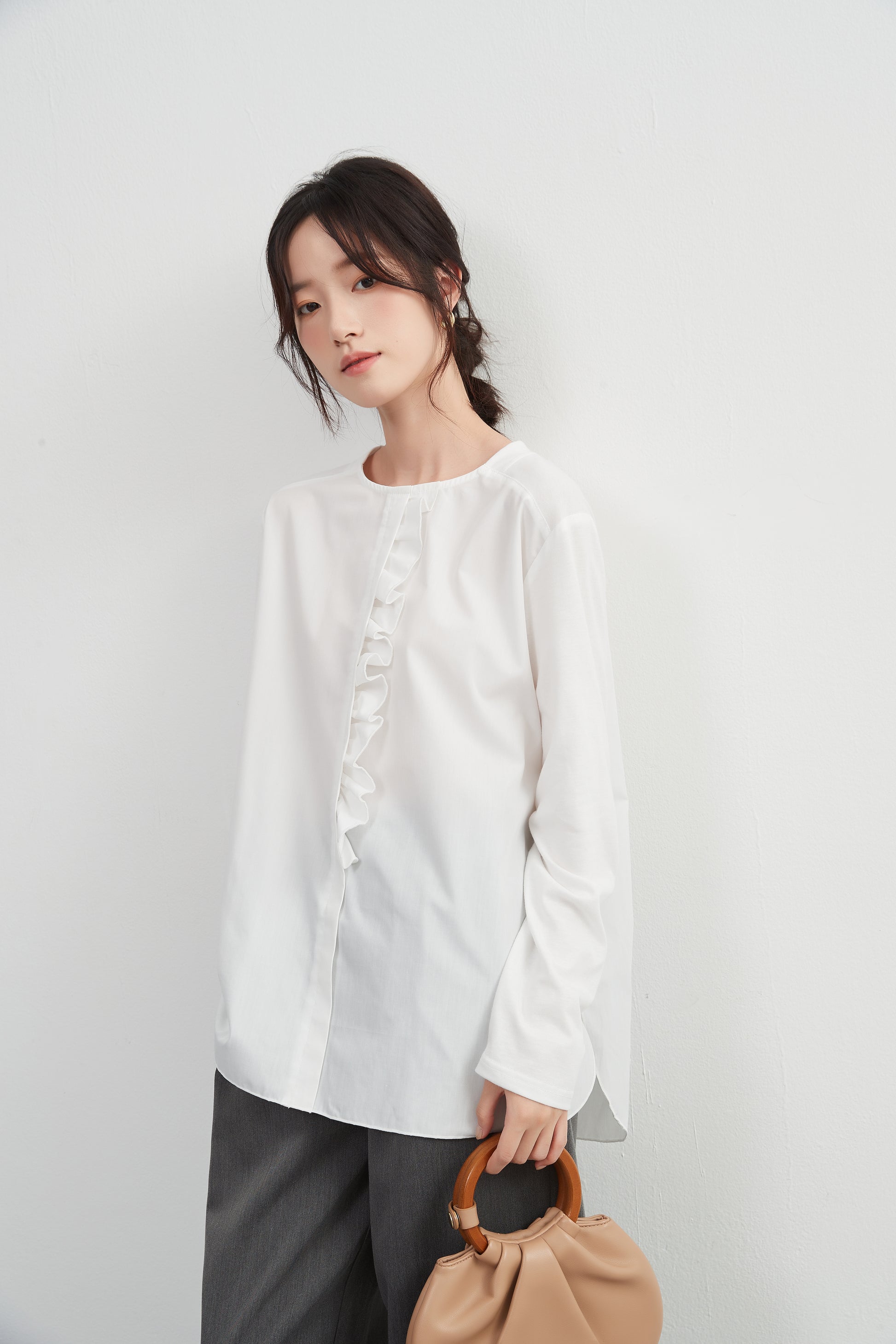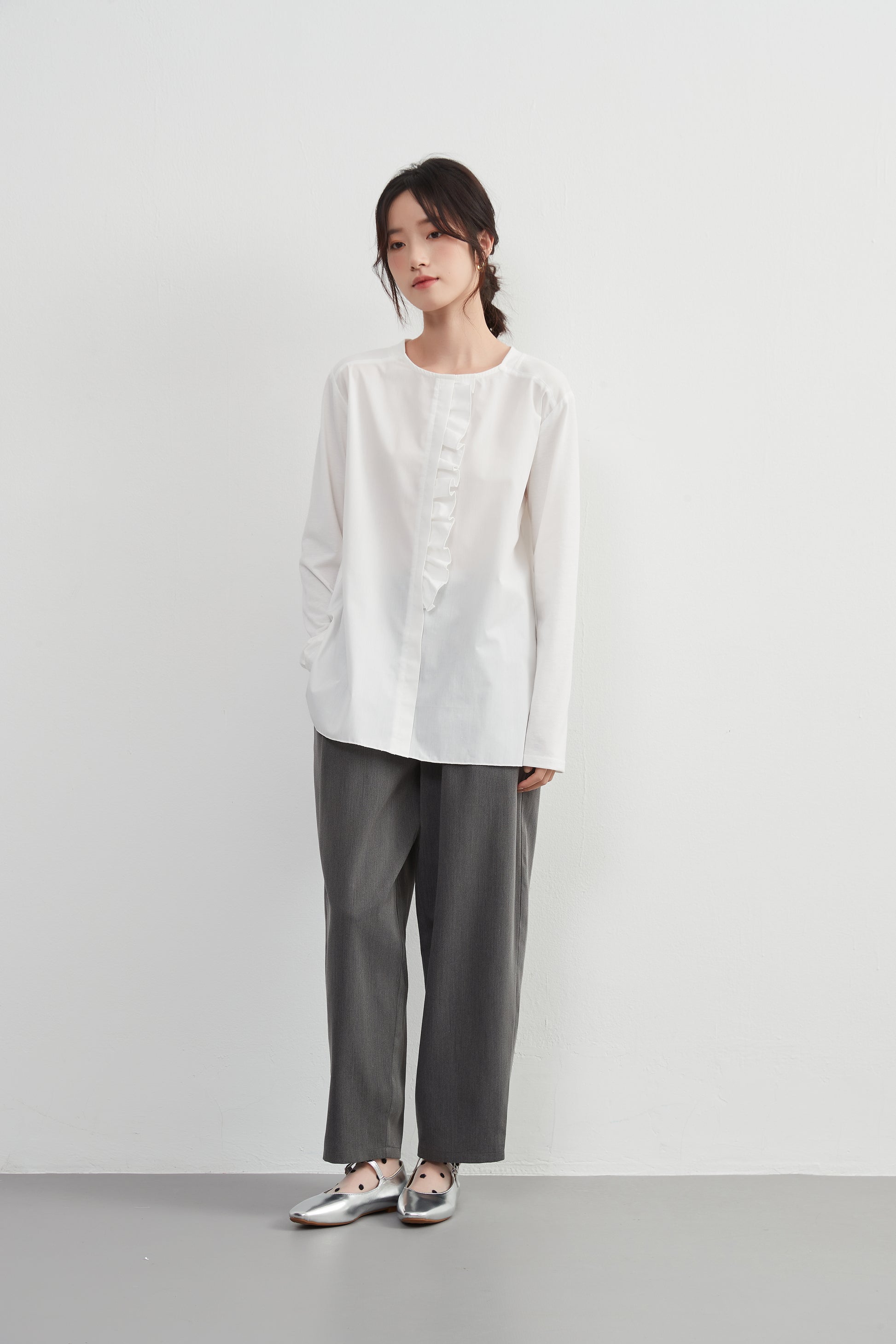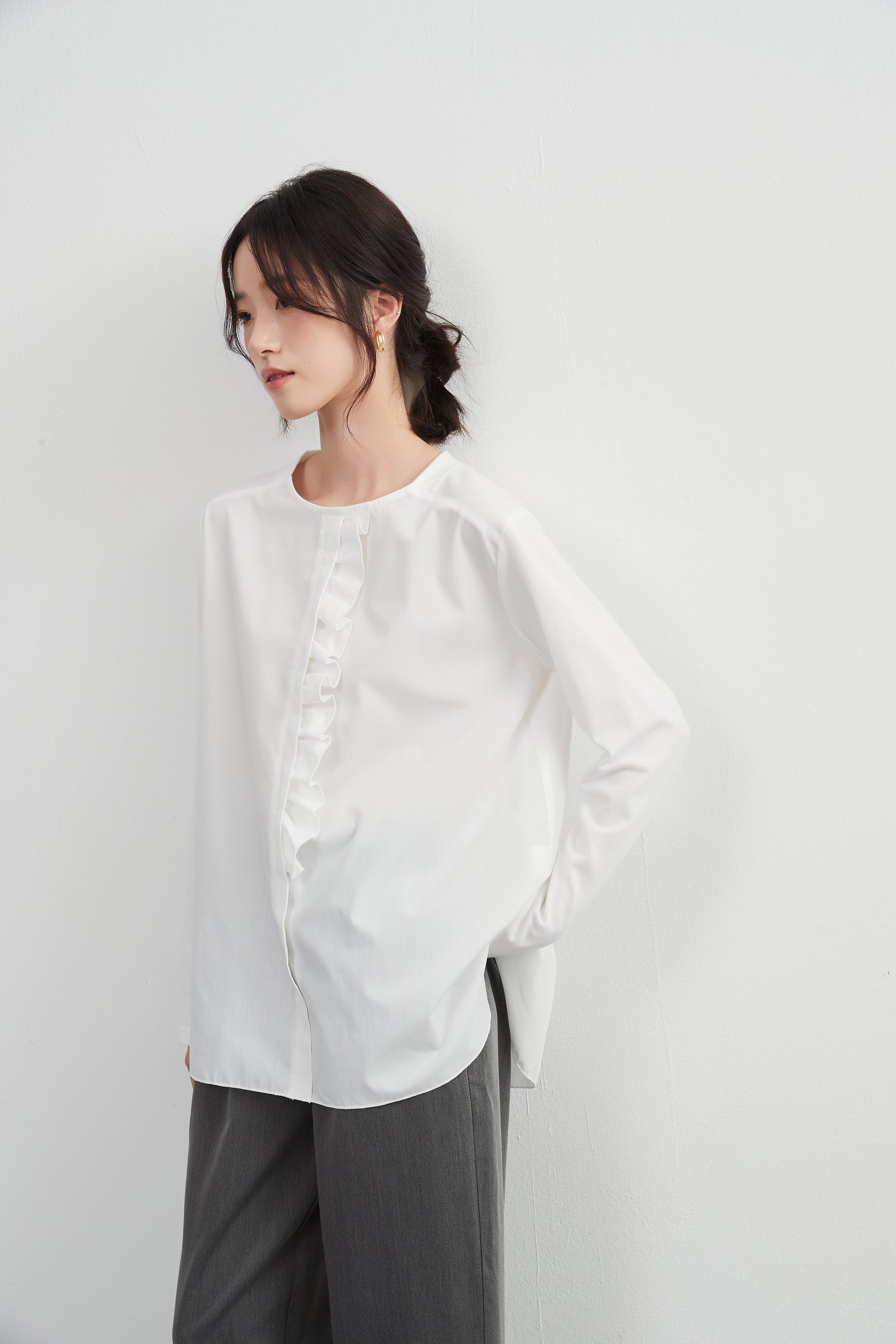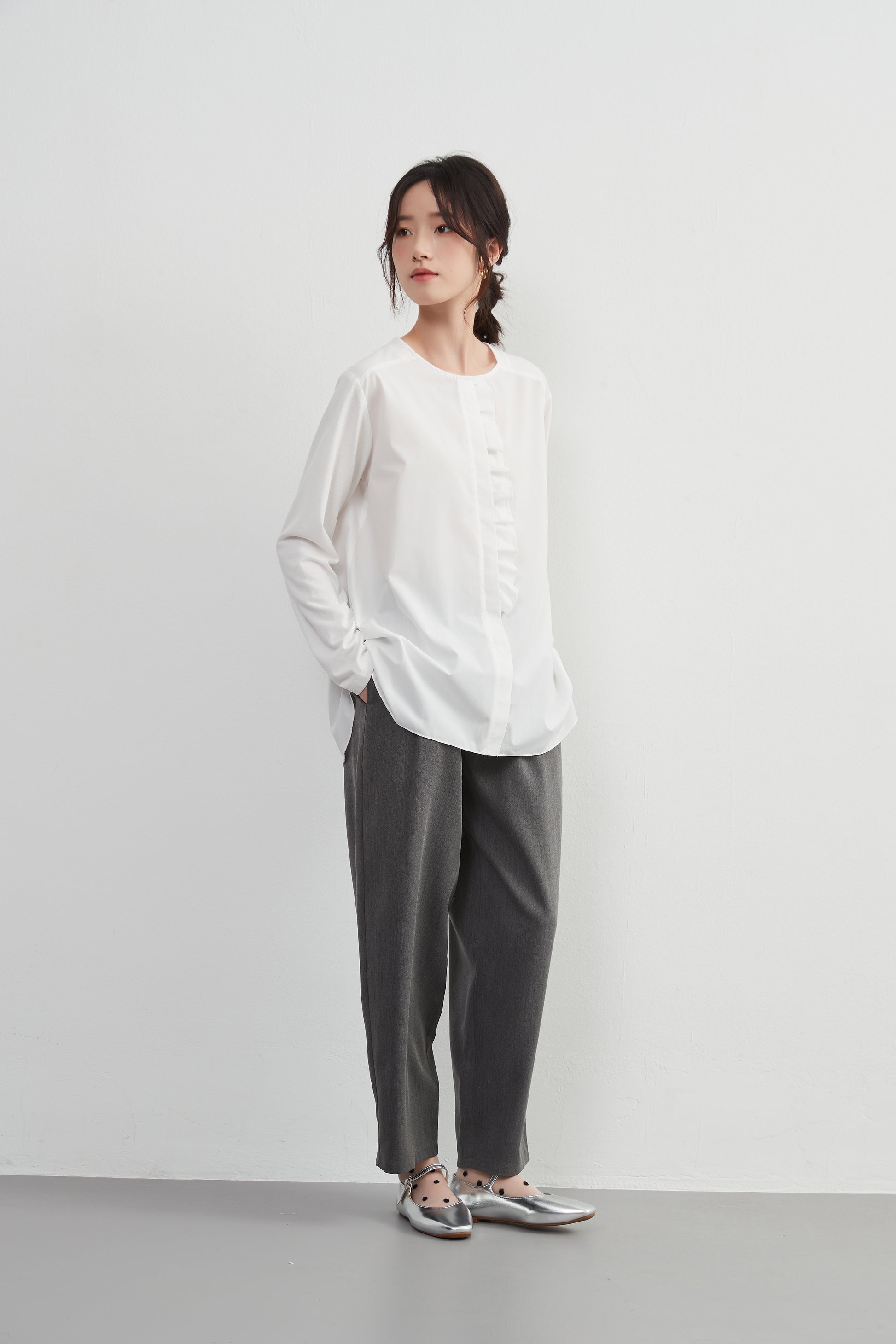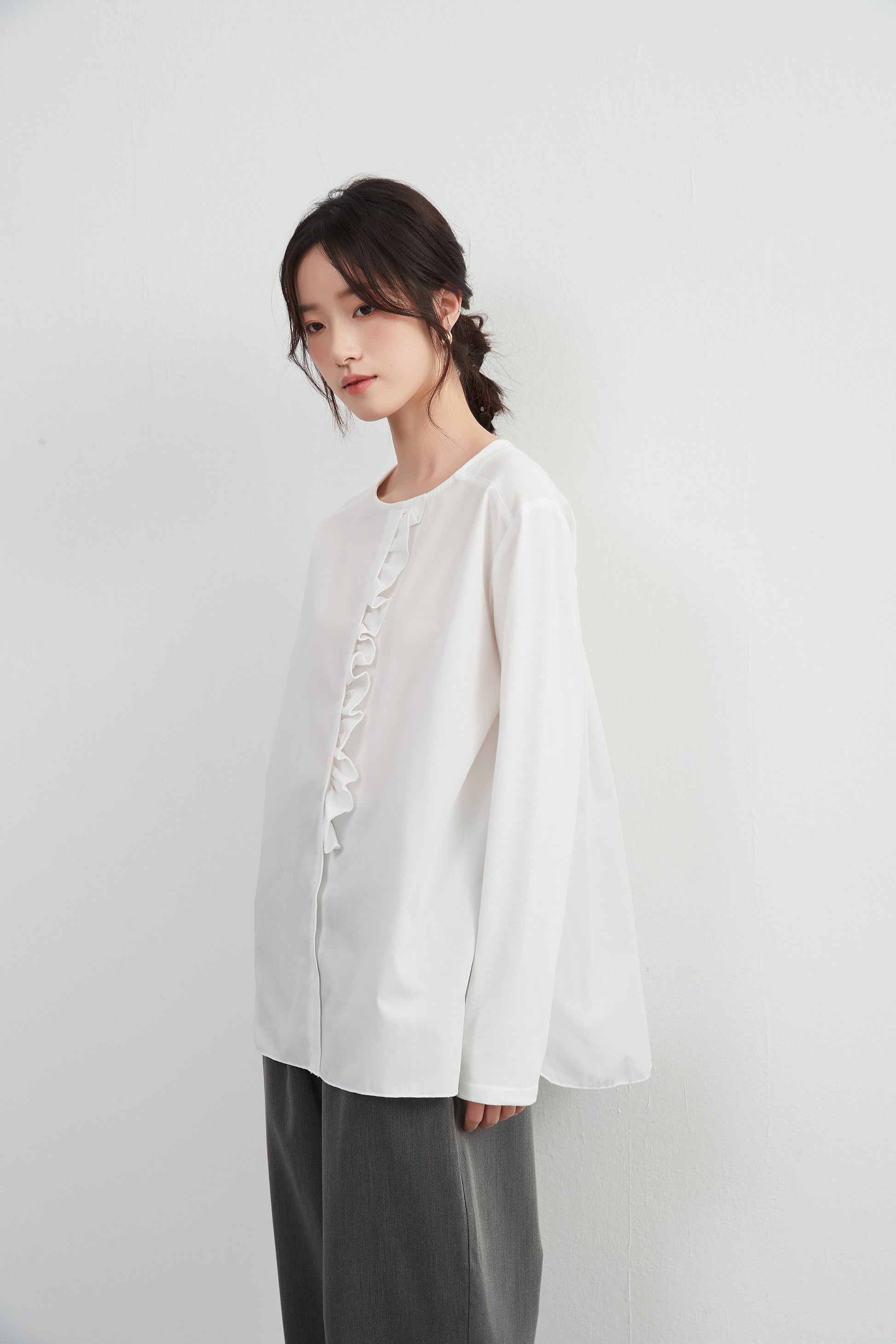 このトップスは、シンプルなボトムスと合わせることで、フリル前立てのデザインを引き立てることができます。デニムパンツやスリムフィットのチノパンツと合わせて、カジュアルなスタイルを楽しむのも良いでしょう。スカートと合わせることで、よりフェミニンなコーディネートも可能です。足元にはバレエシューズやローファーを選んで、上品な印象をプラスしましょう。