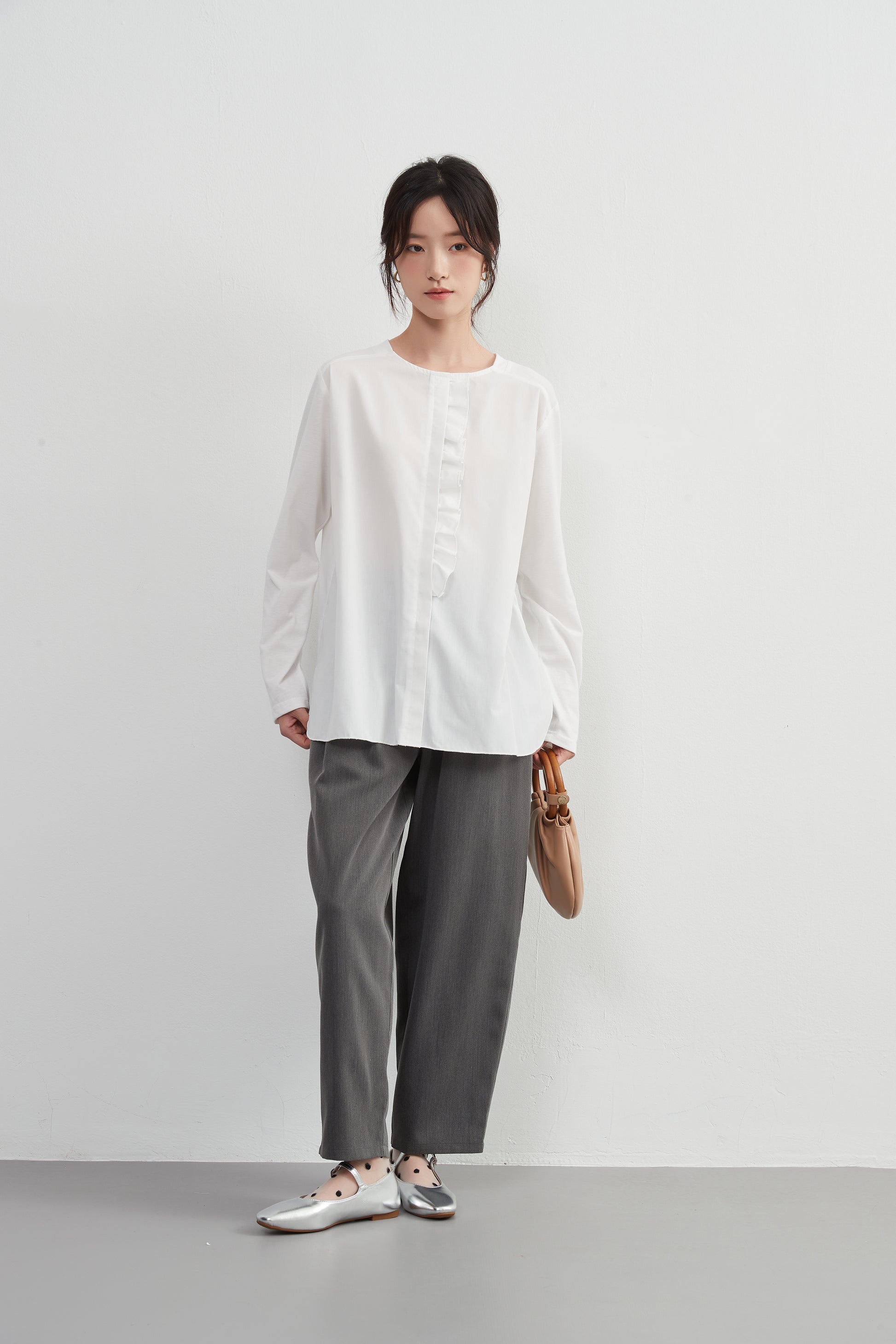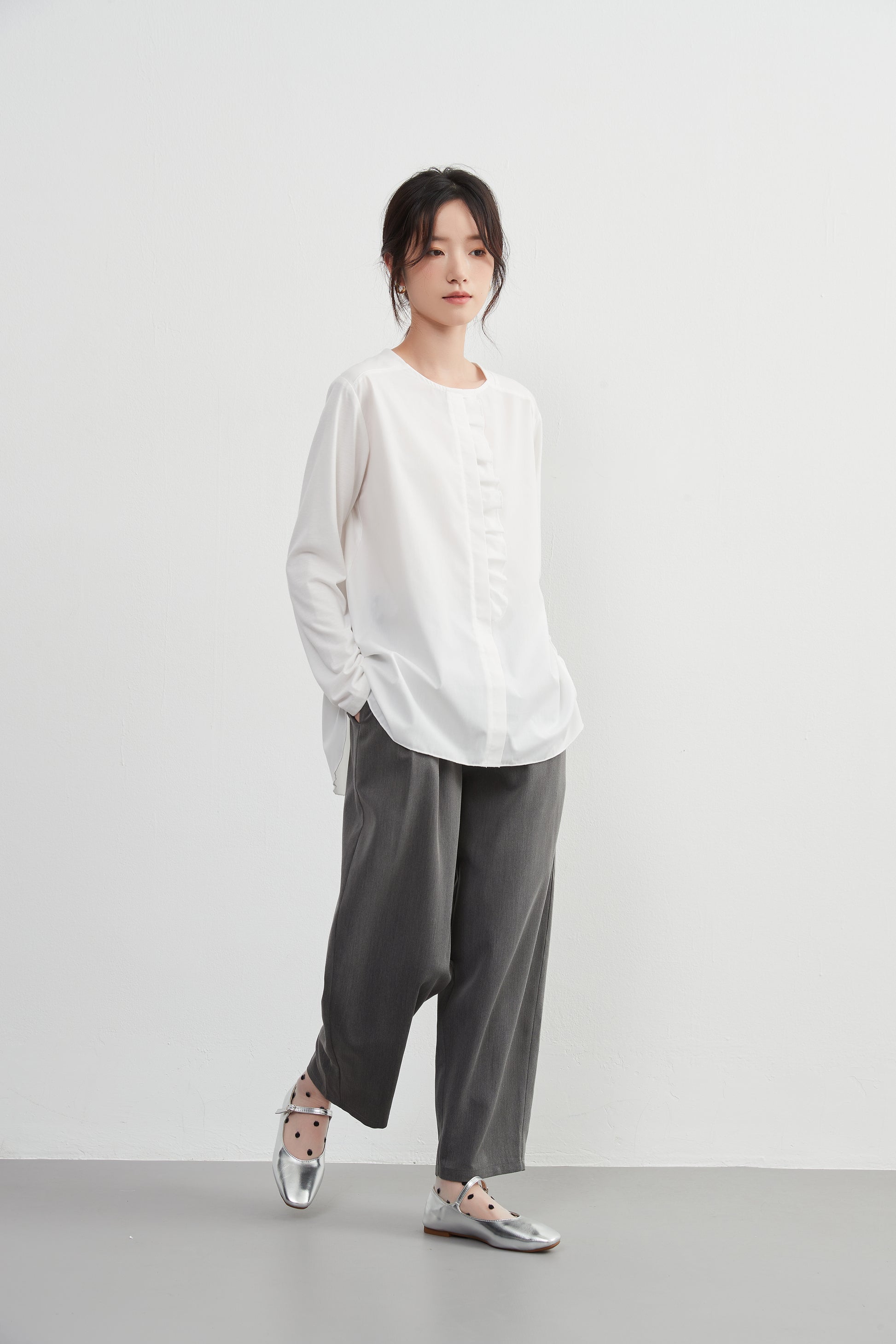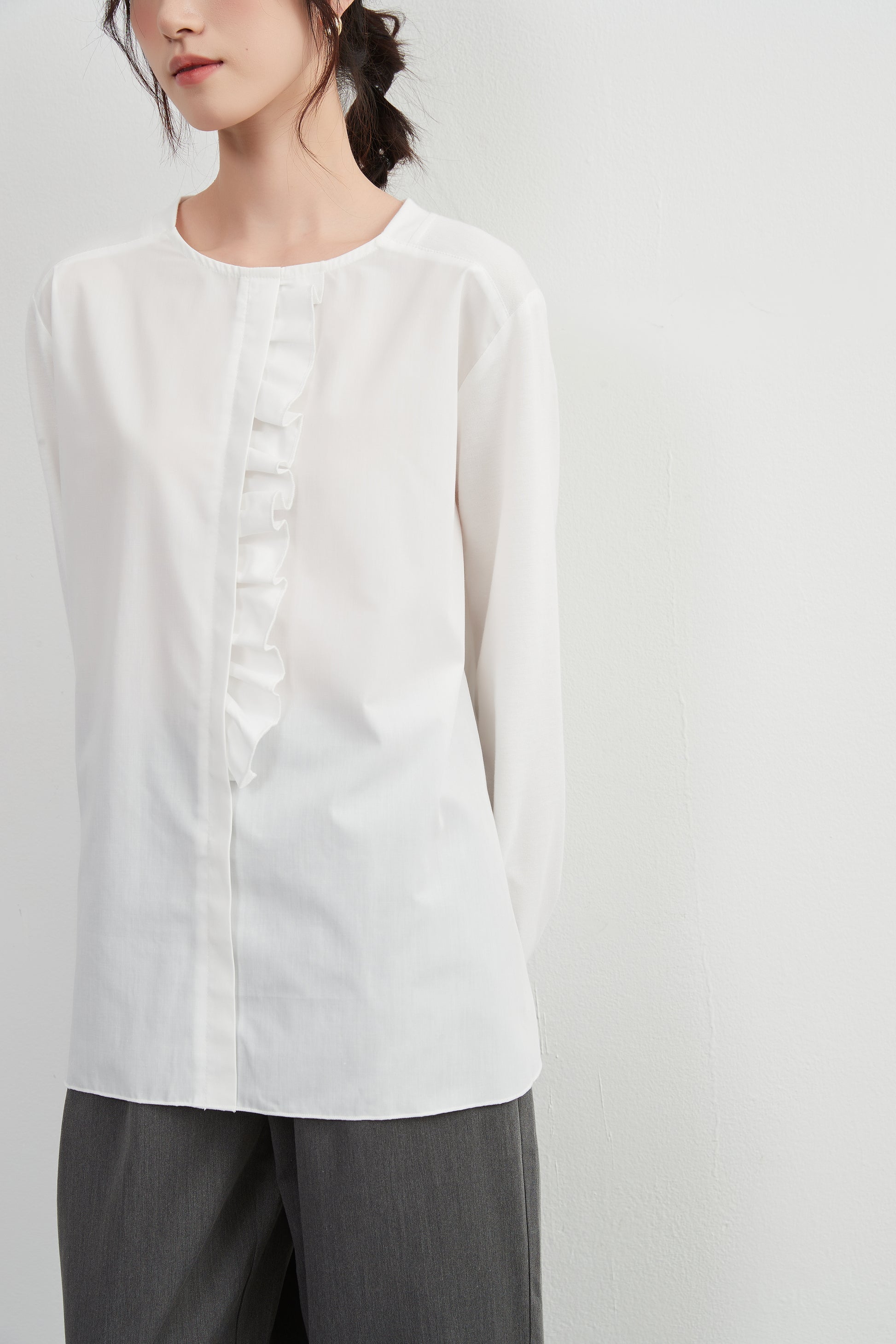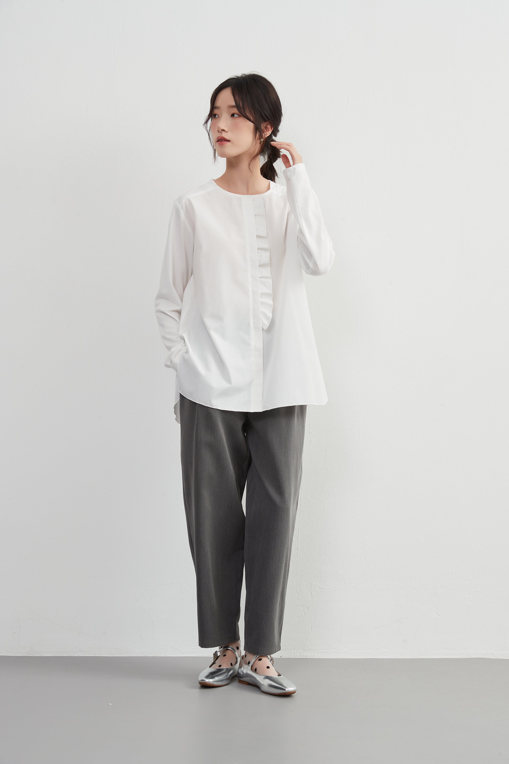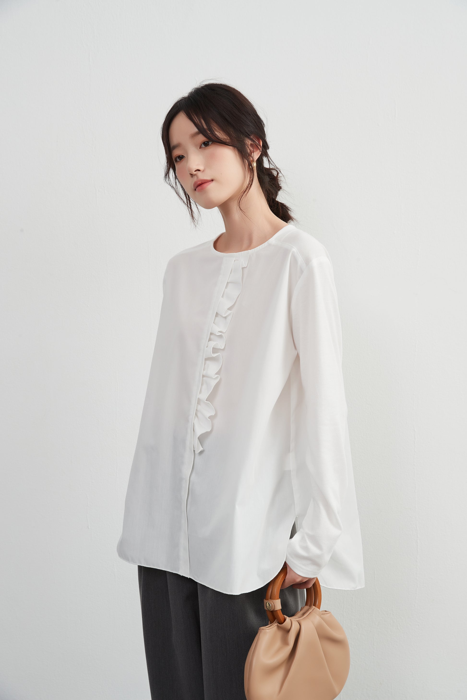 このトップスは、シンプルなボトムスと合わせることで、フリル前立てのデザインを引き立てることができます。デニムパンツやスリムフィットのチノパンツと合わせて、カジュアルなスタイルを楽しむのも良いでしょう。スカートと合わせることで、よりフェミニンなコーディネートも可能です。足元にはバレエシューズやローファーを選んで、上品な印象をプラスしましょう。