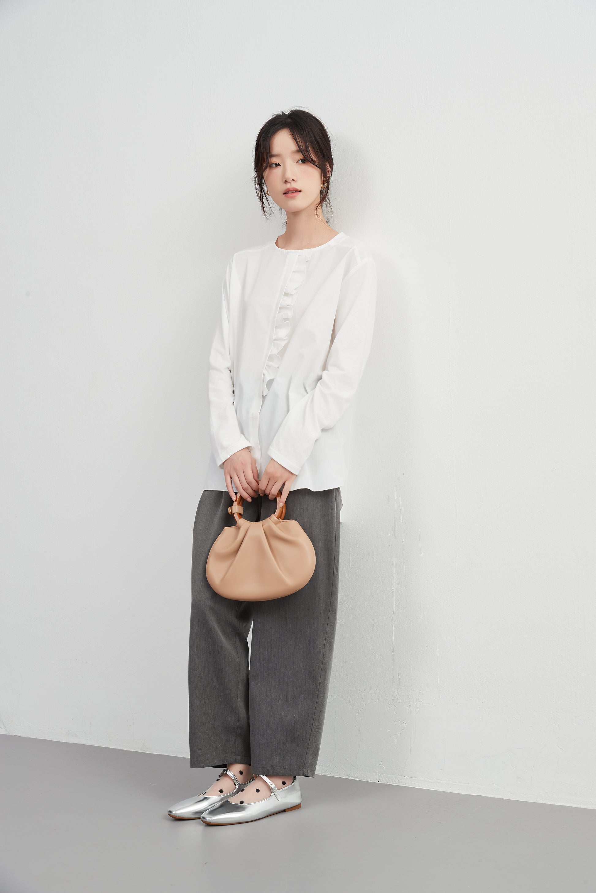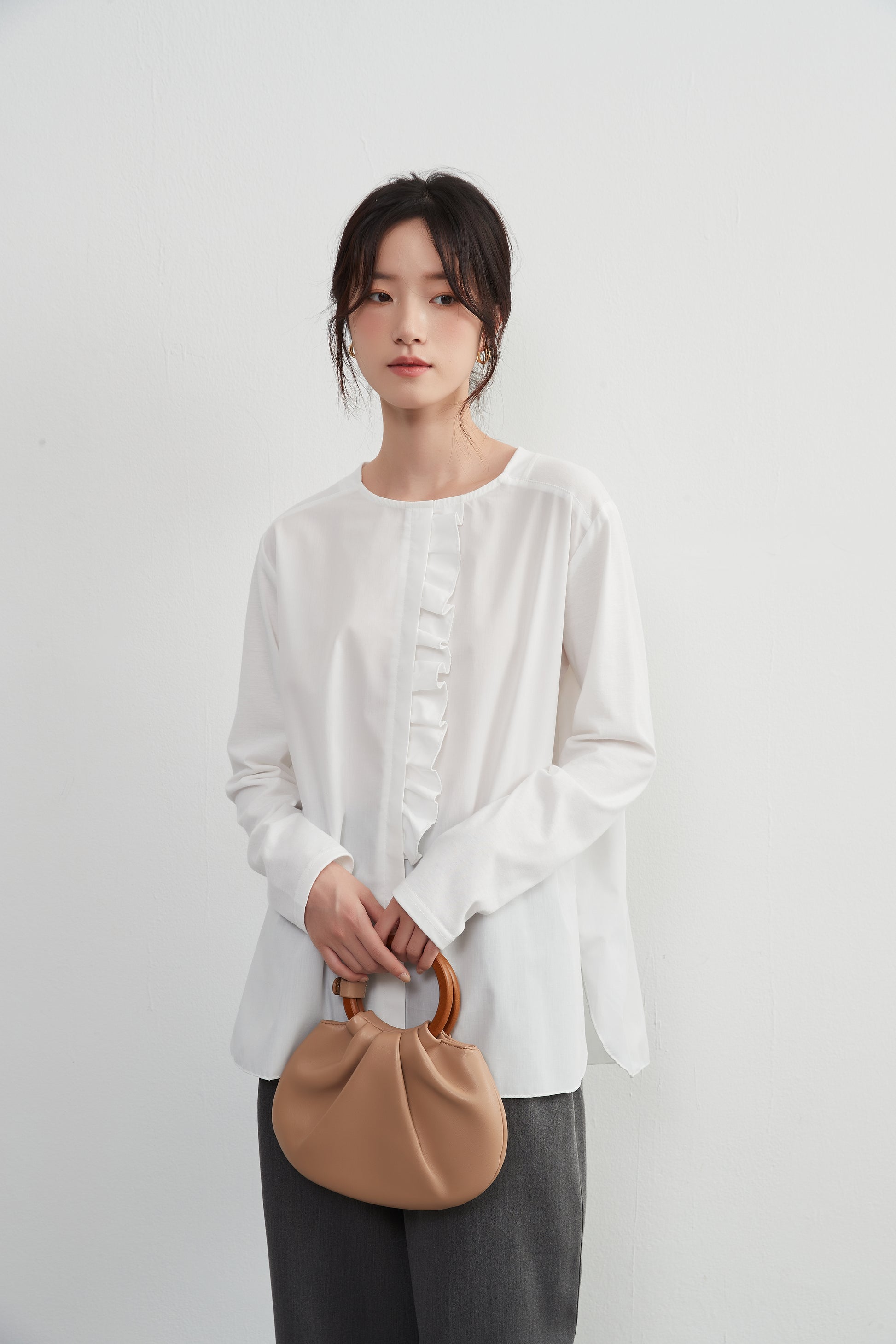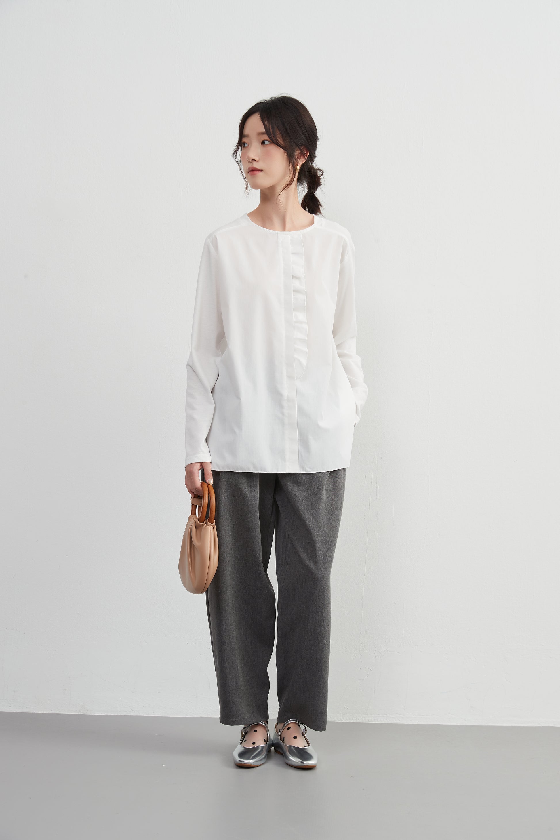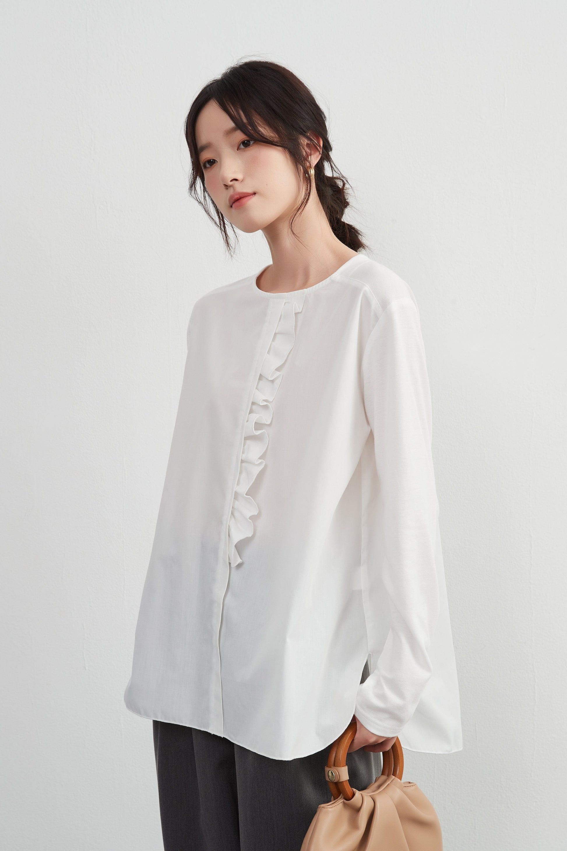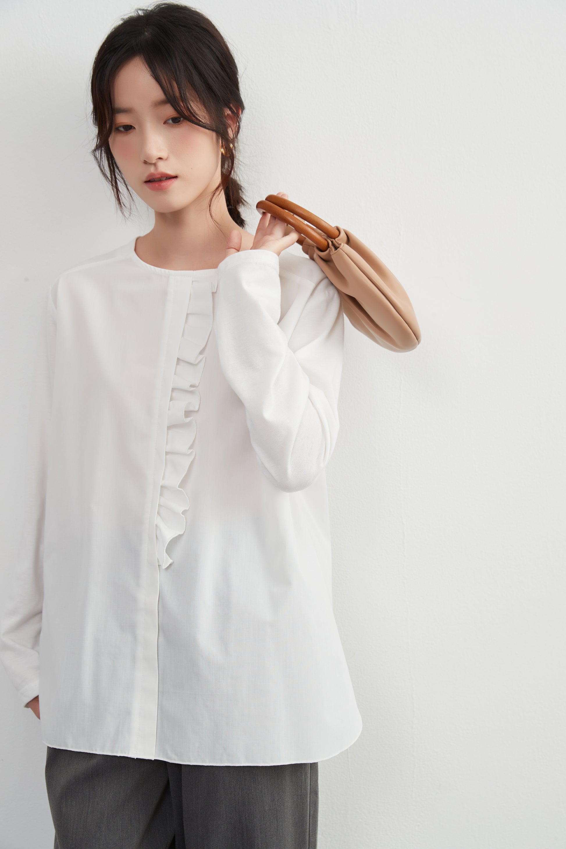 このトップスは、シンプルなボトムスと合わせることで、フリル前立てのデザインを引き立てることができます。デニムパンツやスリムフィットのチノパンツと合わせて、カジュアルなスタイルを楽しむのも良いでしょう。スカートと合わせることで、よりフェミニンなコーディネートも可能です。足元にはバレエシューズやローファーを選んで、上品な印象をプラスしましょう。