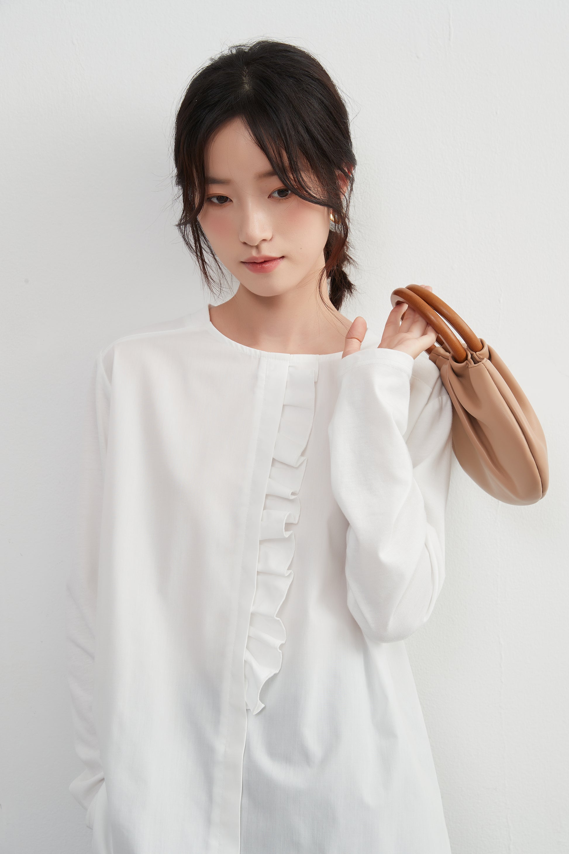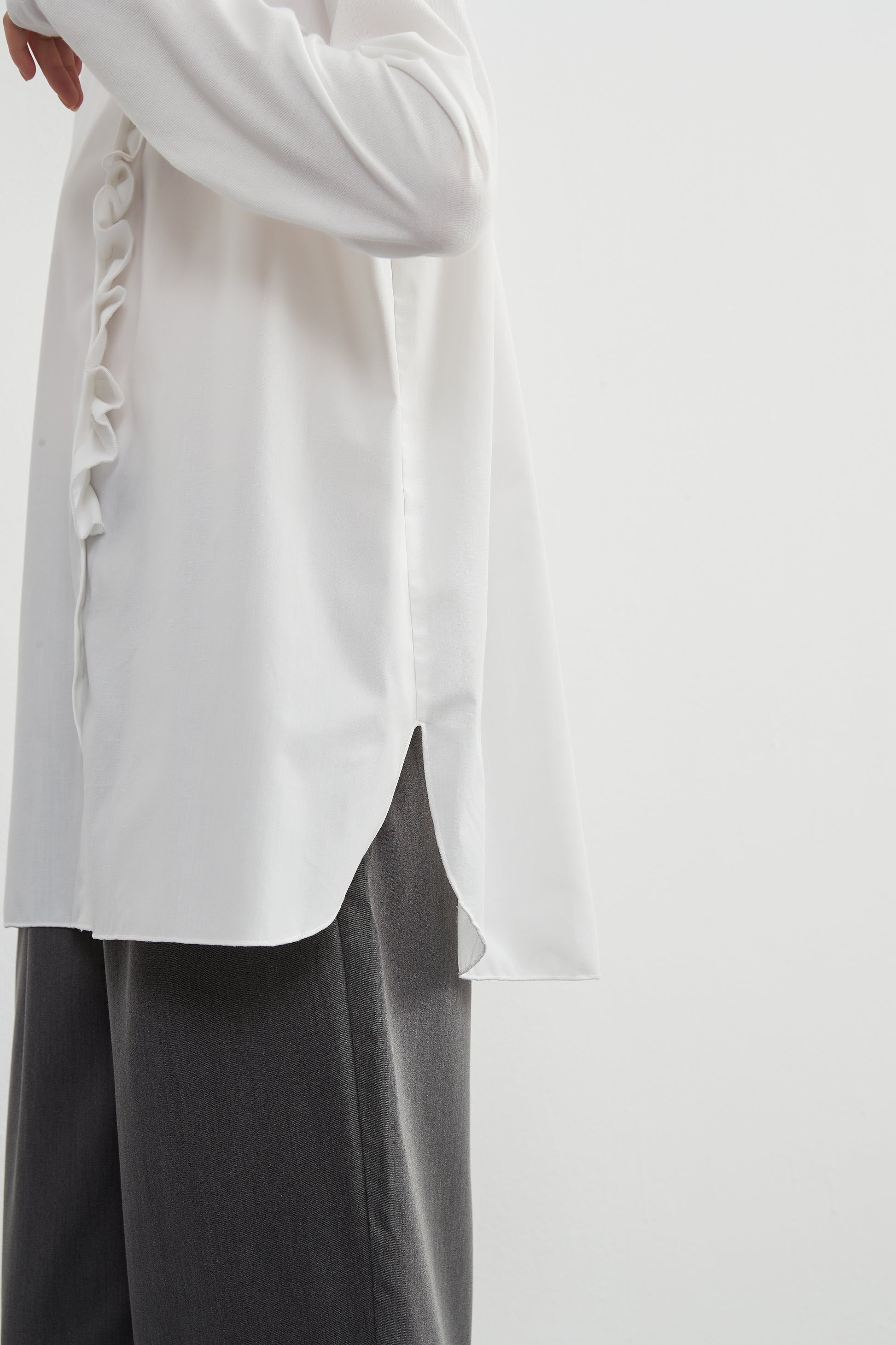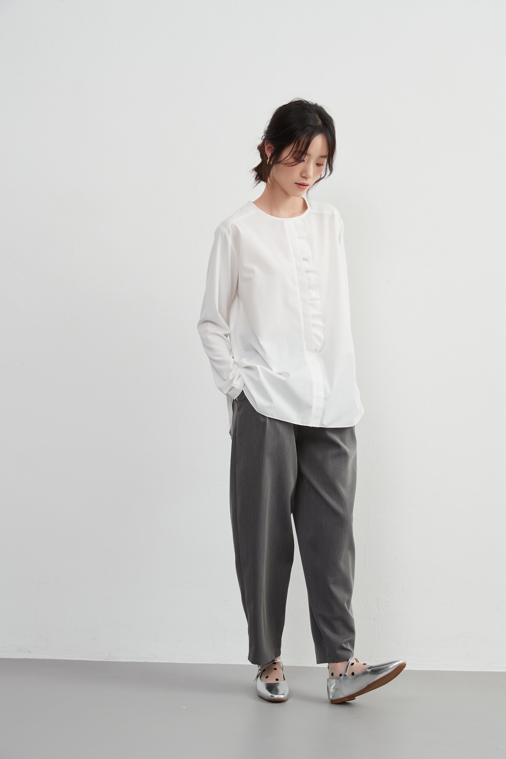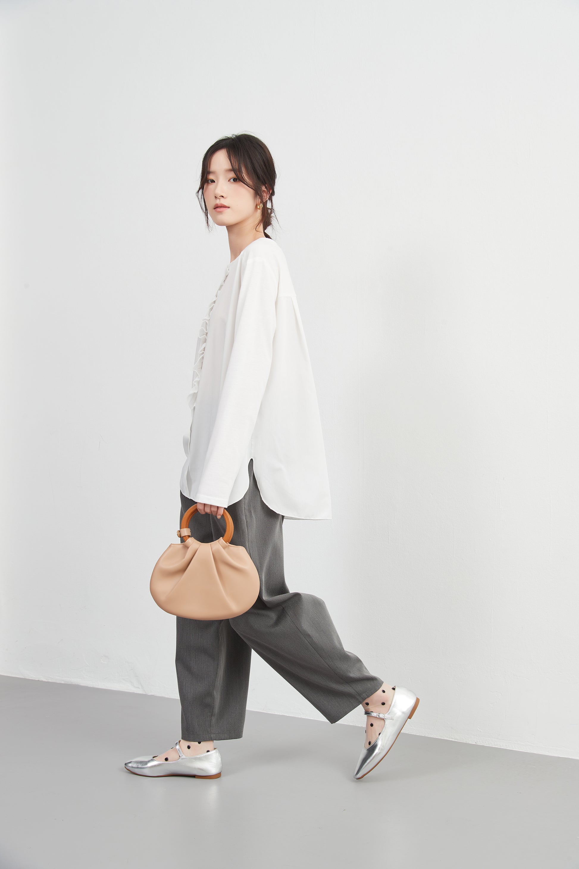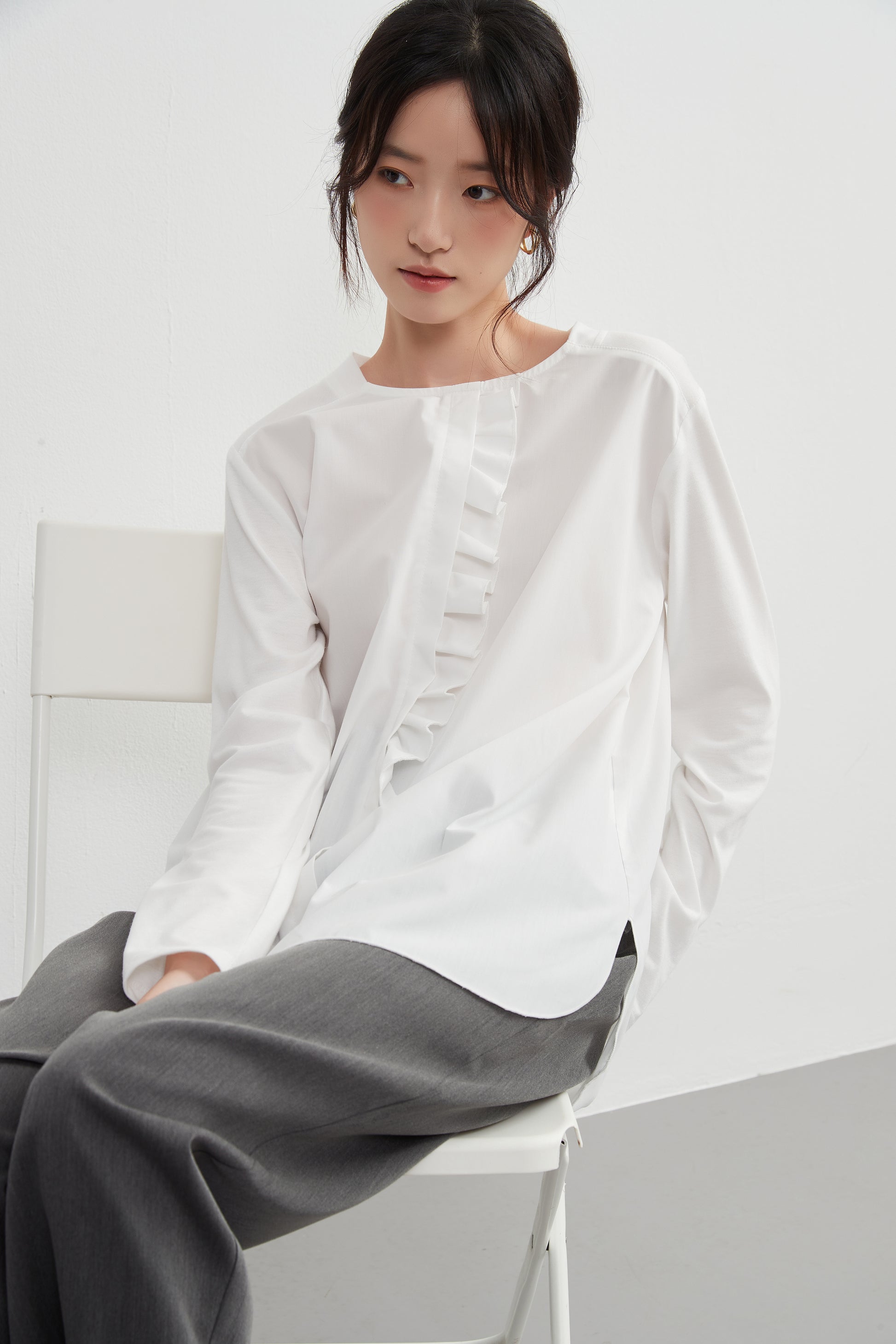 このトップスは、シンプルなボトムスと合わせることで、フリル前立てのデザインを引き立てることができます。デニムパンツやスリムフィットのチノパンツと合わせて、カジュアルなスタイルを楽しむのも良いでしょう。スカートと合わせることで、よりフェミニンなコーディネートも可能です。足元にはバレエシューズやローファーを選んで、上品な印象をプラスしましょう。